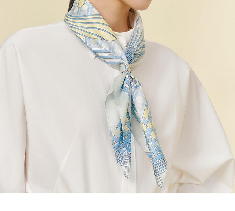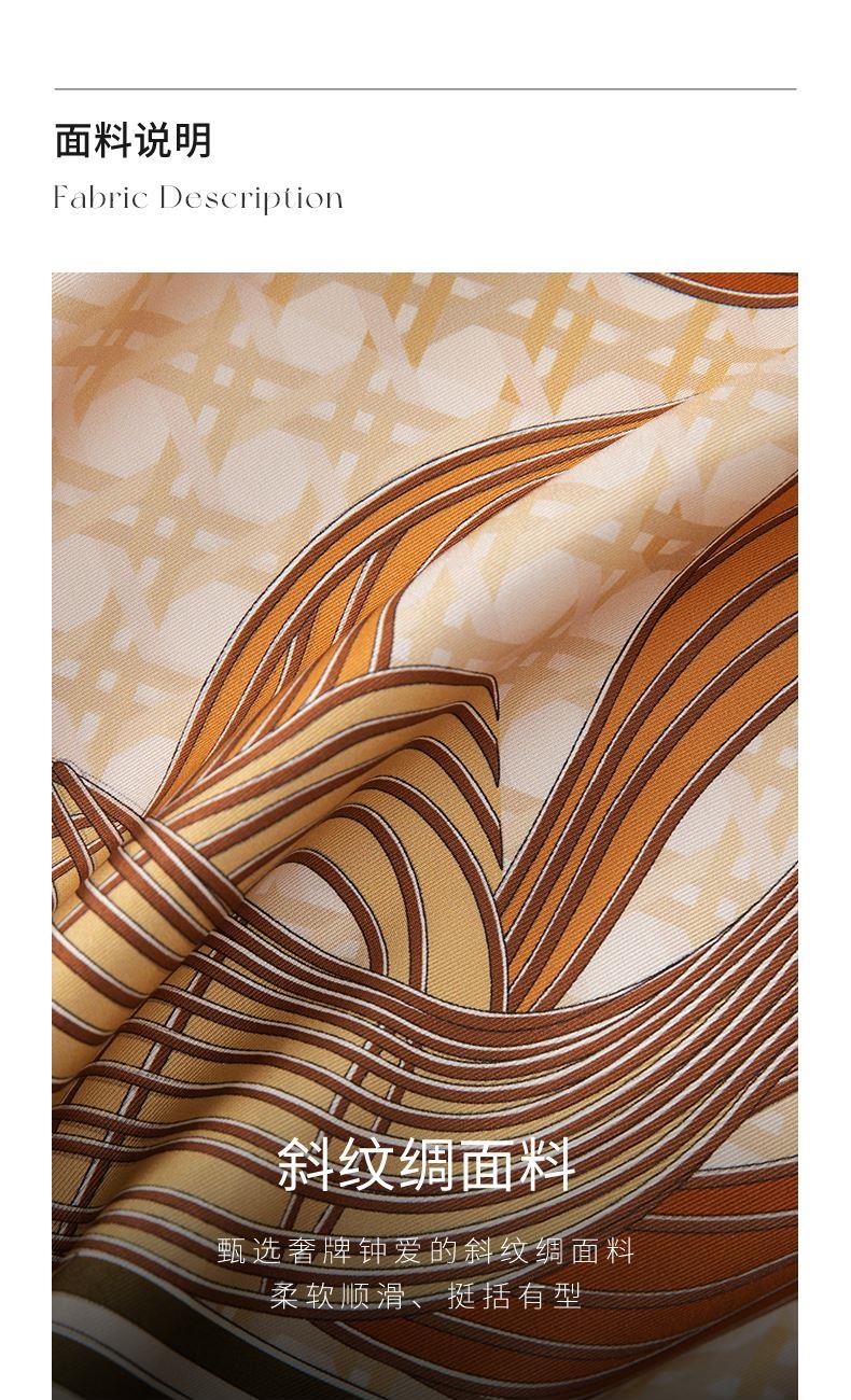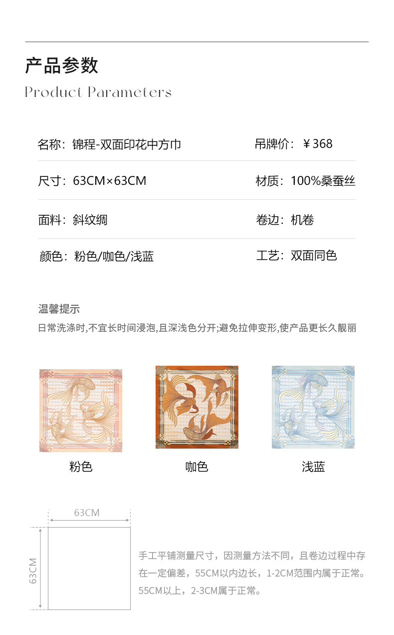 尺寸:63CMx63CM 材质:100桑蚕丝 面料:斜纹绸 卷边:机卷 颜色:粉色/咖色/浅蓝 工艺:双面同色