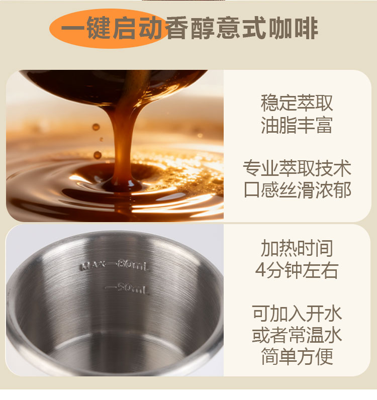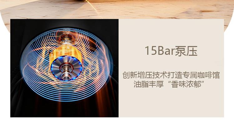 咖啡恒温萃取,90度精 准控温、15Bar泵压,萃取油脂丰富、口感香醇