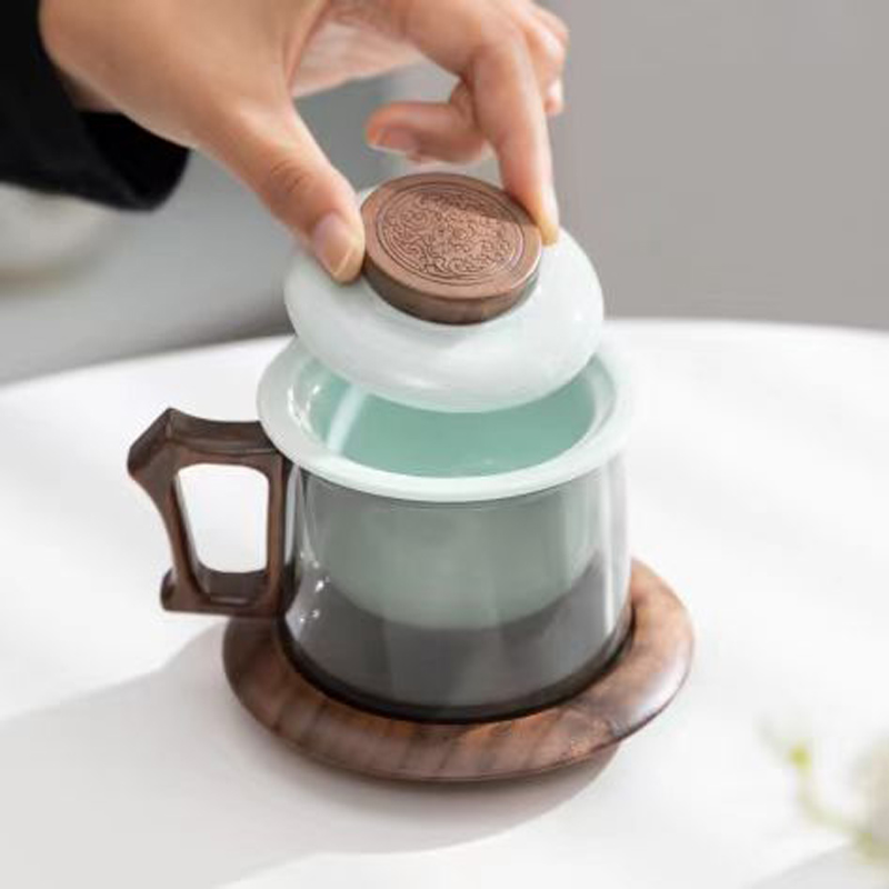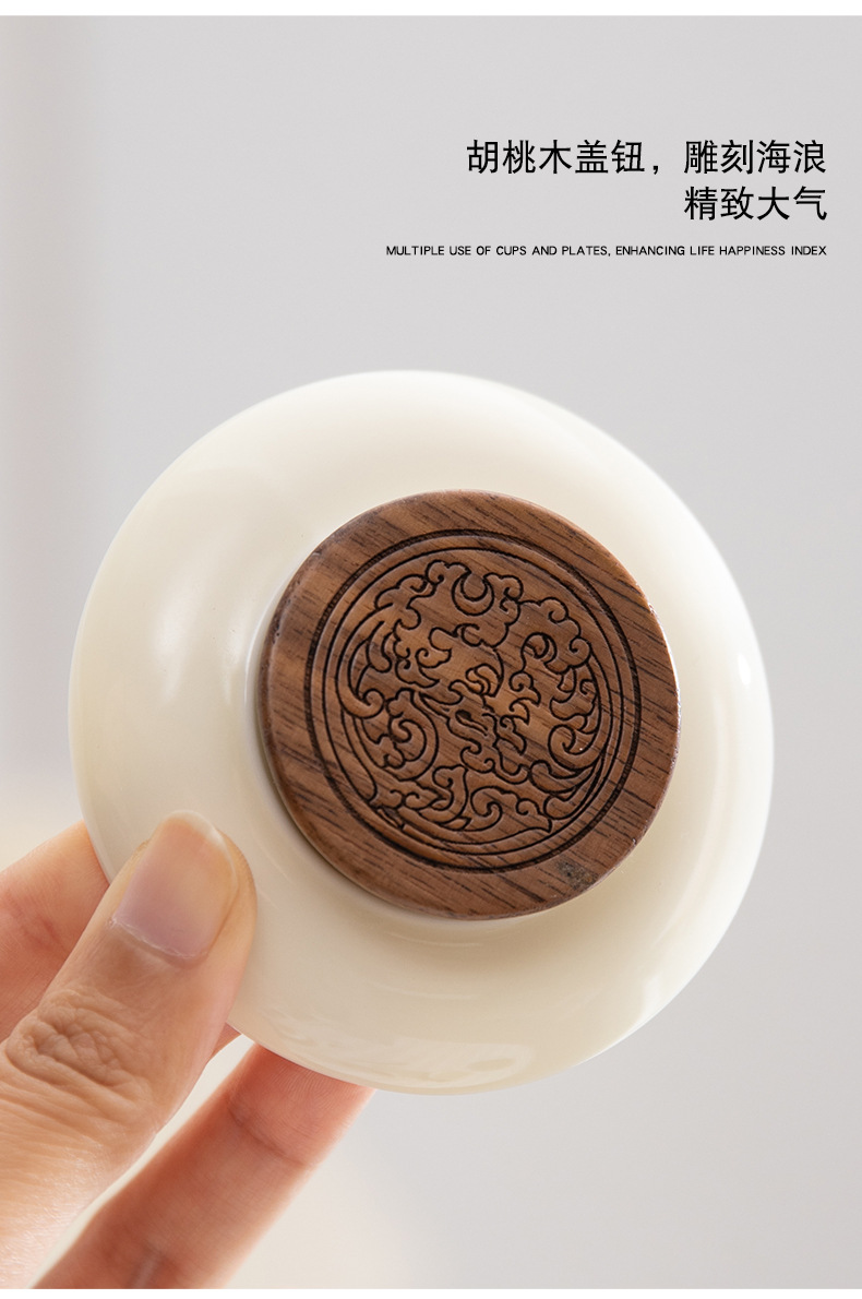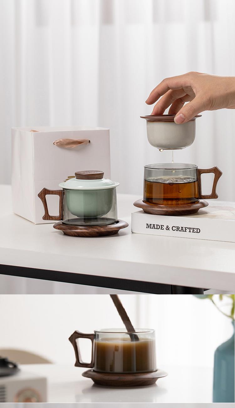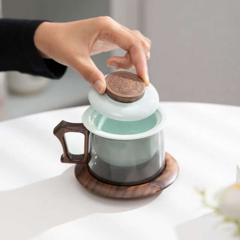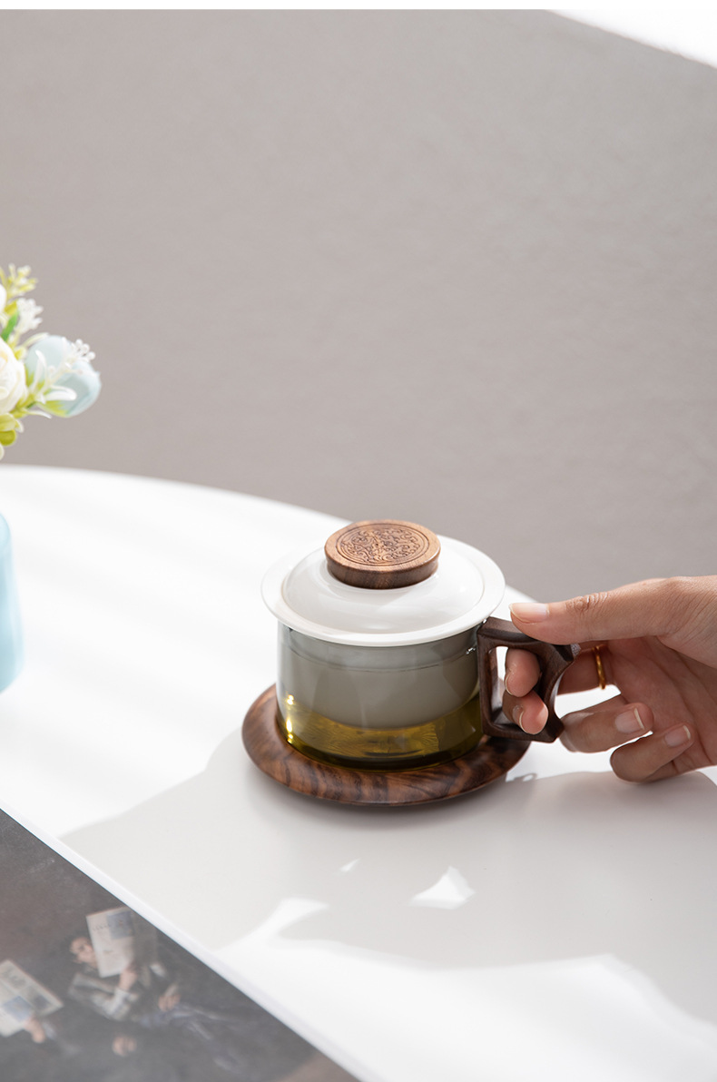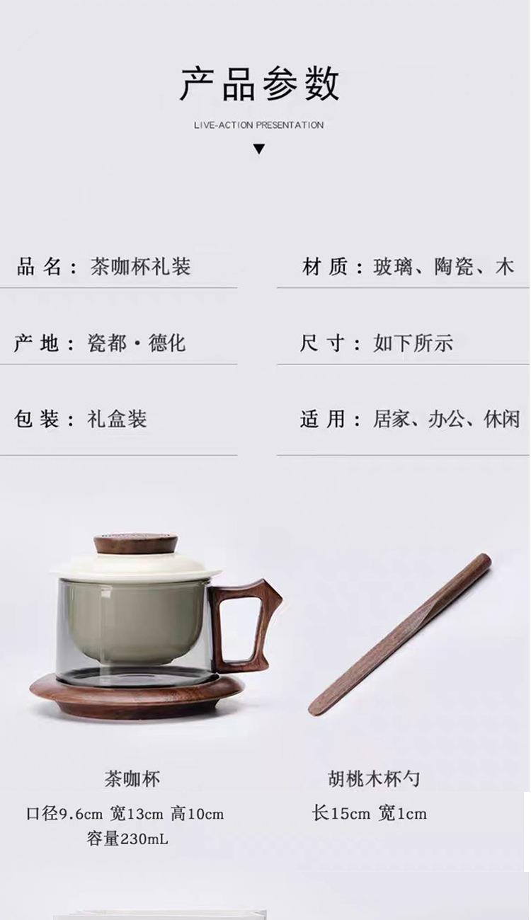 配 制: 1杯 1盖 1茶漏 1木碟 1木勺 1礼盒手提袋 材质:羊脂玉瓷、胡桃木、 高硼硅玻璃 容量:300ml 推荐说明:两用办公杯,既可泡茶、又可做咖啡杯。采用上等天青汝瓷,胡桃木雕刻祥云纹理木盖与杯把、底碟、木勺,底碟中间卡槽设计,防止杯子晃动。食品级高硼硅玻璃,尊享品质。