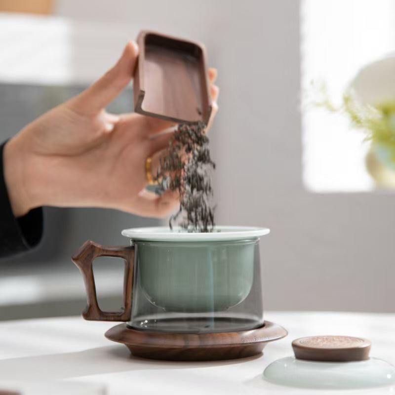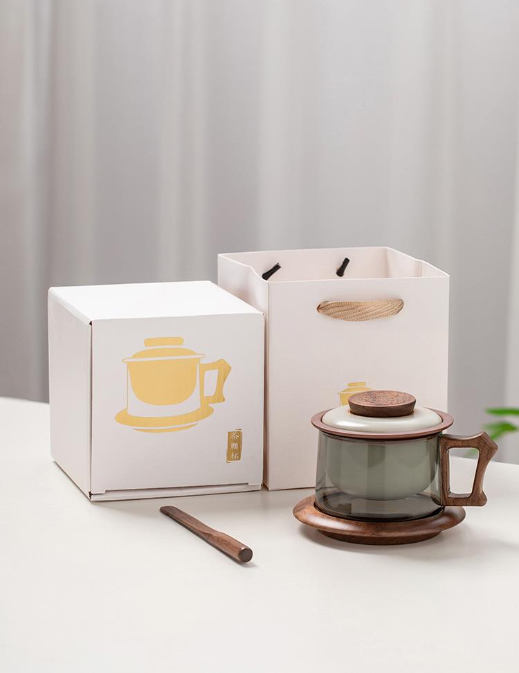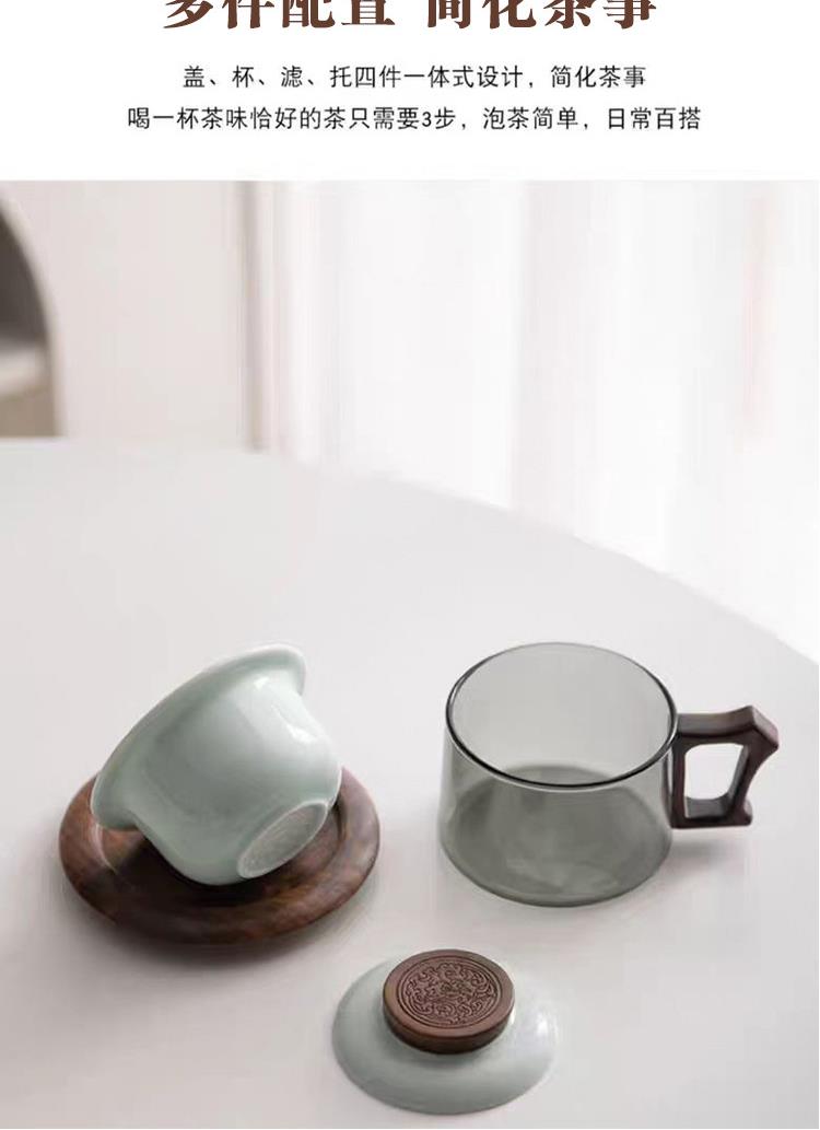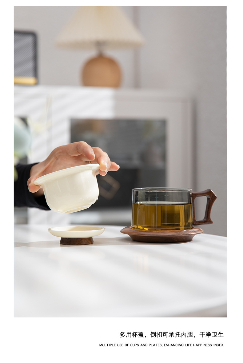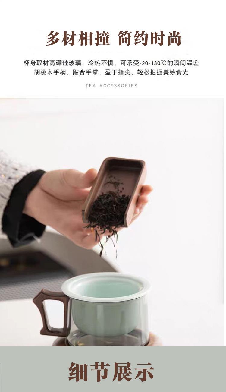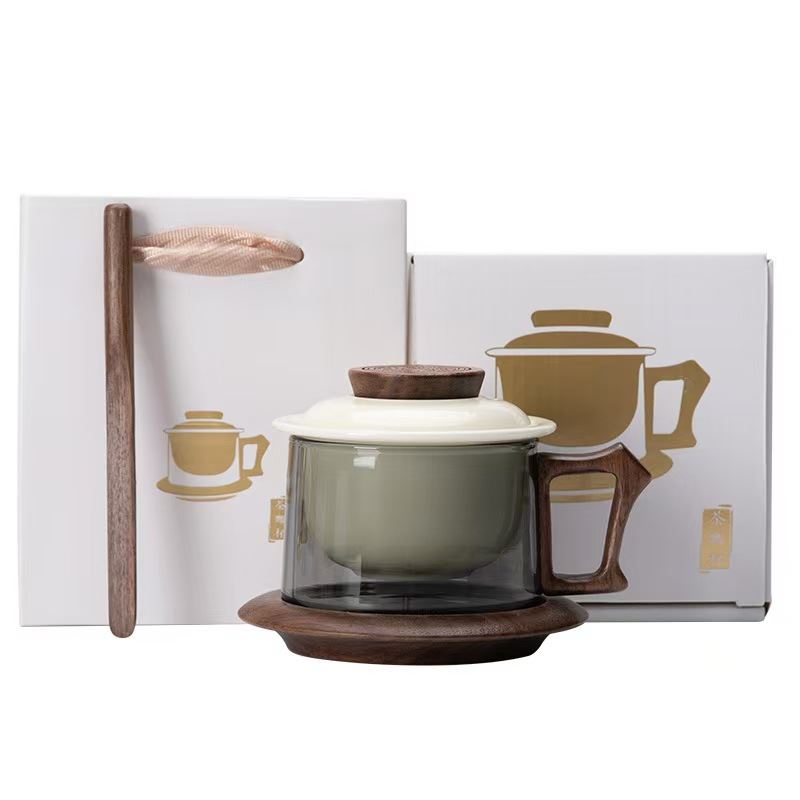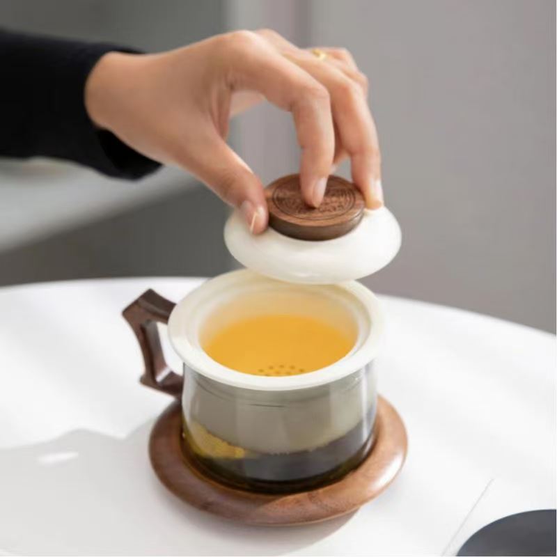 配 制: 1杯 1盖 1茶漏 1木碟 1木勺 1礼盒手提袋 材质:羊脂玉瓷、胡桃木、 高硼硅玻璃 容量:300ml 推荐说明:两用办公杯,既可泡茶、又可做咖啡杯。采用上等天青汝瓷,胡桃木雕刻祥云纹理木盖与杯把、底碟、木勺,底碟中间卡槽设计,防止杯子晃动。食品级高硼硅玻璃,尊享品质。