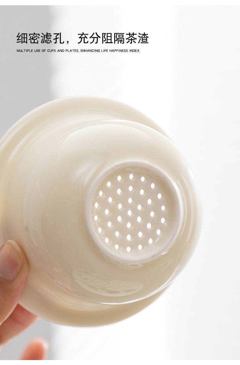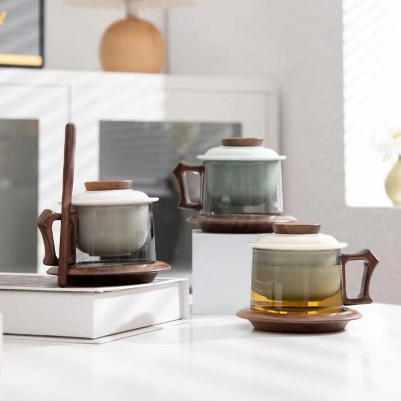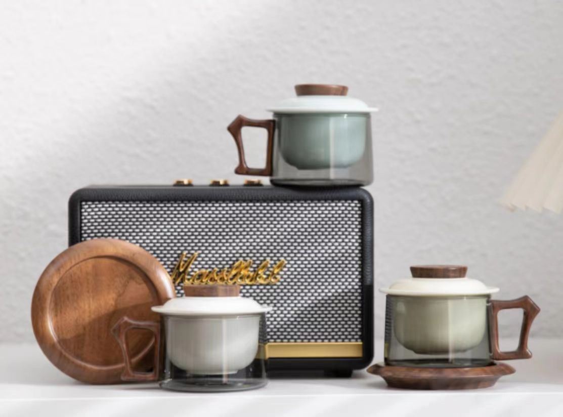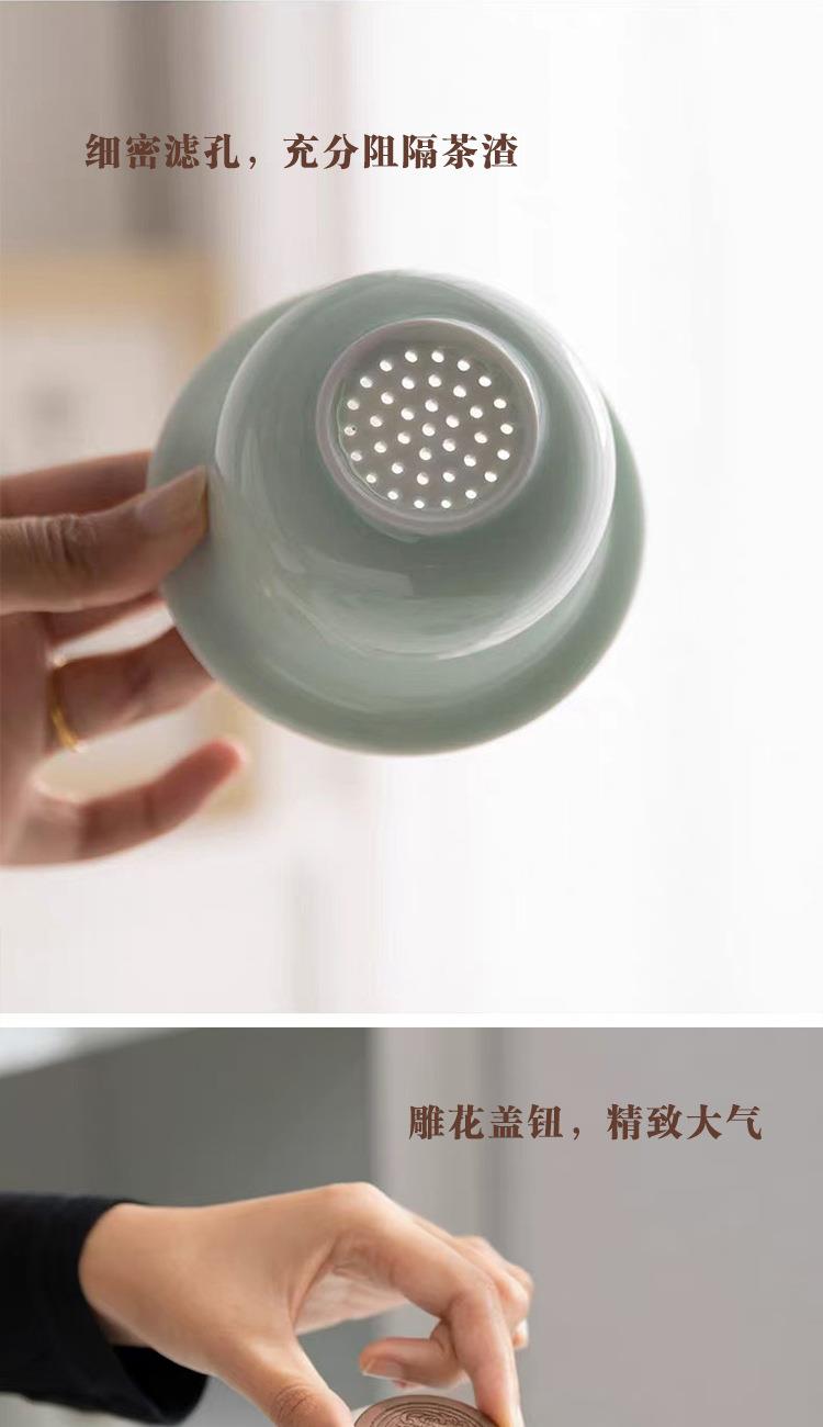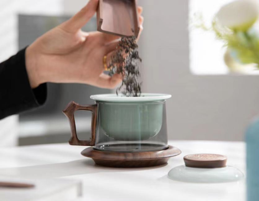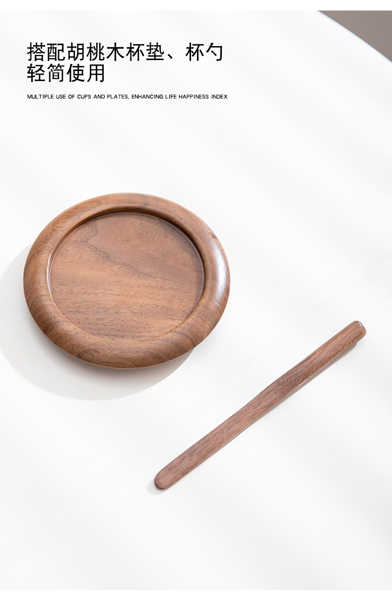 配 制: 1杯 1盖 1茶漏 1木碟 1木勺 1礼盒手提袋 材质:羊脂玉瓷、胡桃木、 高硼硅玻璃 容量:300ml 推荐说明:两用办公杯,既可泡茶、又可做咖啡杯。采用上等天青汝瓷,胡桃木雕刻祥云纹理木盖与杯把、底碟、木勺,底碟中间卡槽设计,防止杯子晃动。食品级高硼硅玻璃,尊享品质。