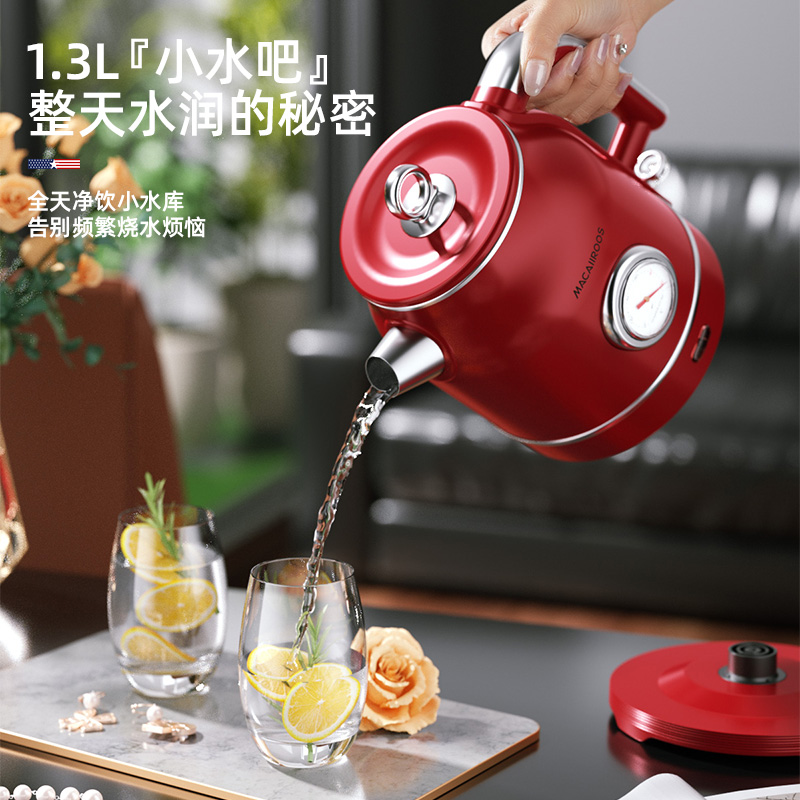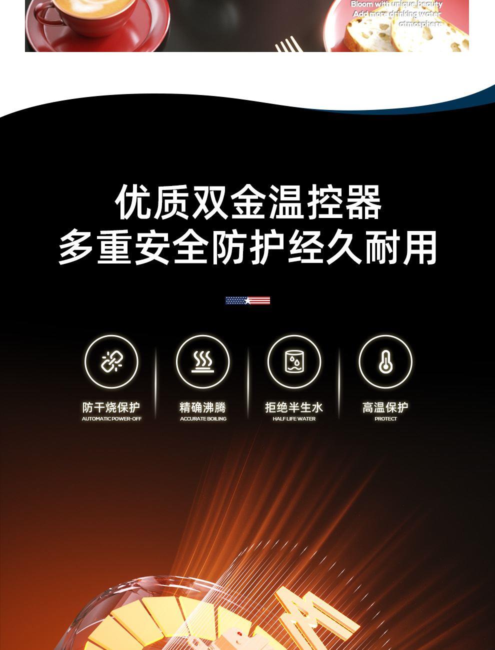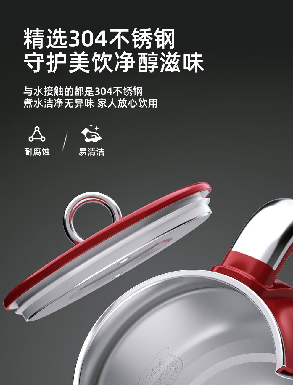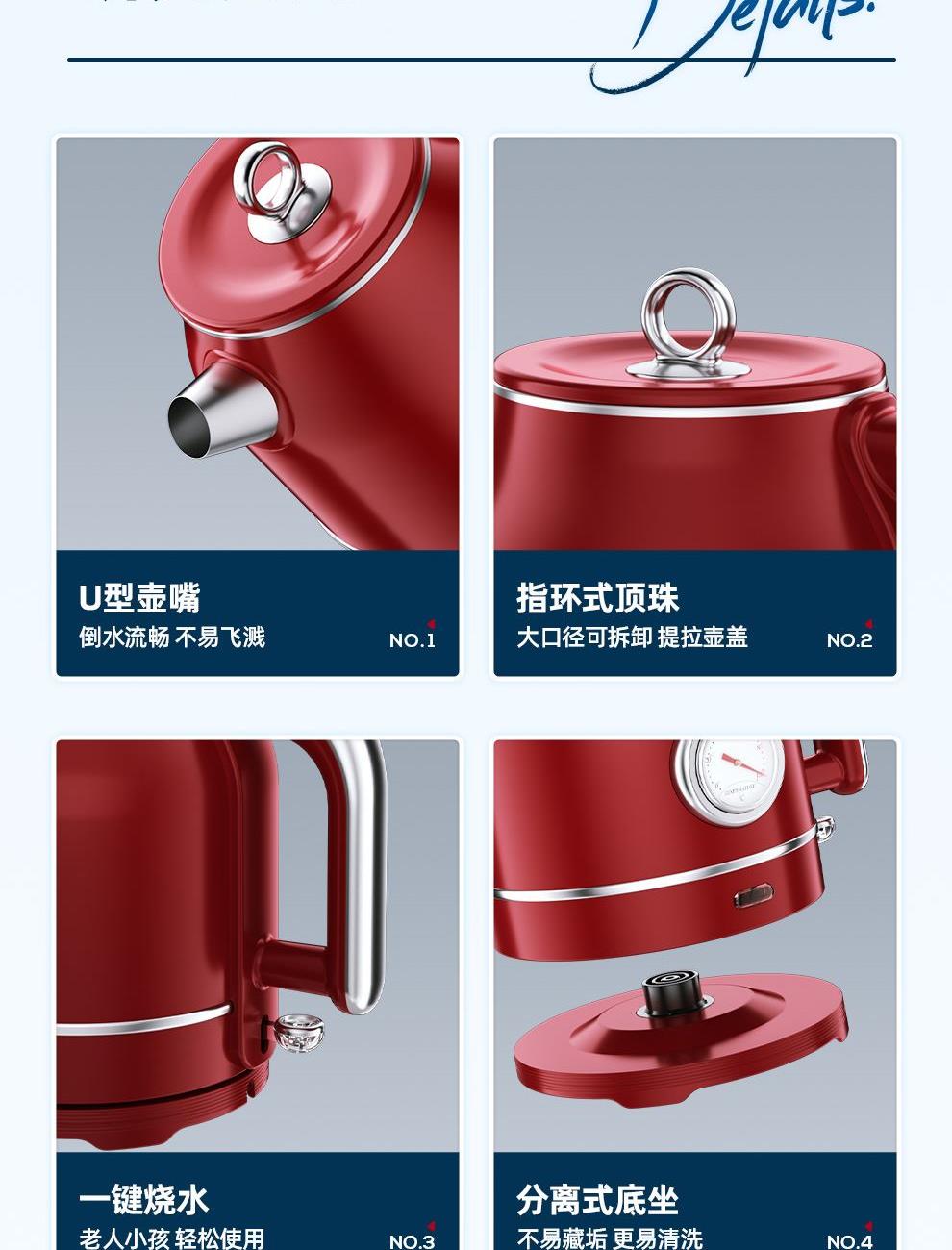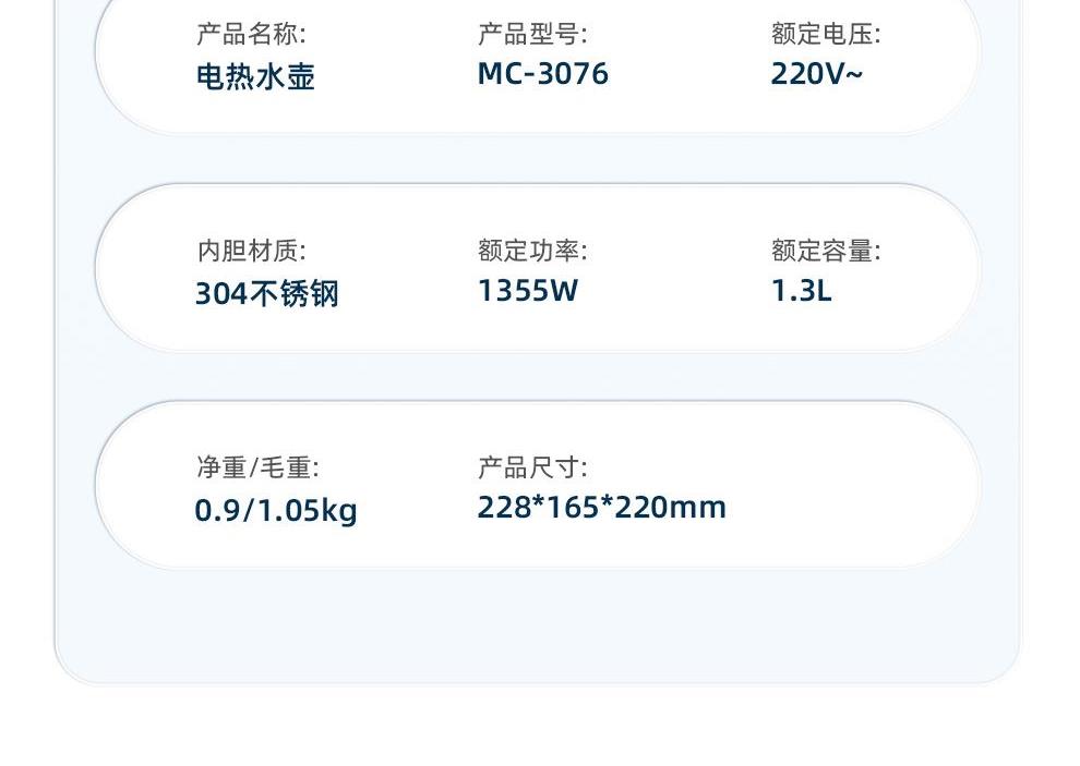 额定功率:1355W 额定容量:1.3L 额定电压:220V~ 额定频率:50Hz 产品净重:0.9kg 产品毛重:1.05kg 整箱重量:13.9kg 装 箱 数:12台/箱 实时温显自带温显一键烧水,实时温度显示,用水知温; 304不锈钢内胆、内钢盖食品接触用材质,耐高温耐腐蚀; 一键烧水1355W大功率烧水快,水开跳挚,操作简单; 分离式上盖&安全设计方便接水和清洗,双层防烫壶身,防干烧自动断电。