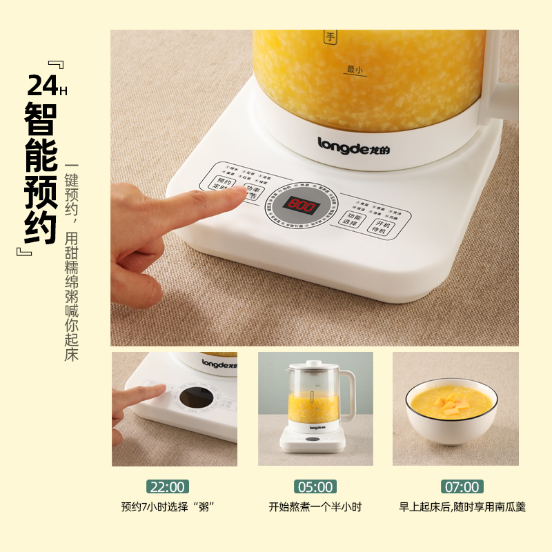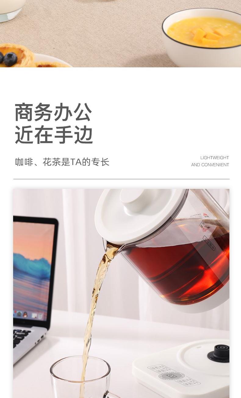 额定功率:800W 产品容量:1.5L 额定电压:220V~ 产品频率:50Hz 产品净重:1.0kg 产品毛重:1.4kg 整箱重量:18.0kg 高硼硅玻璃壶身高硼硅玻璃冷热交替不易裂 食品级不锈钢发热体食品级不锈钢发热体,长久耐用 触控菜单选择22大触控菜单选择,数码显示 功率可调、时间可调功率可调,180分钟定时,24小时预约