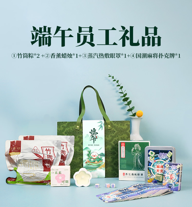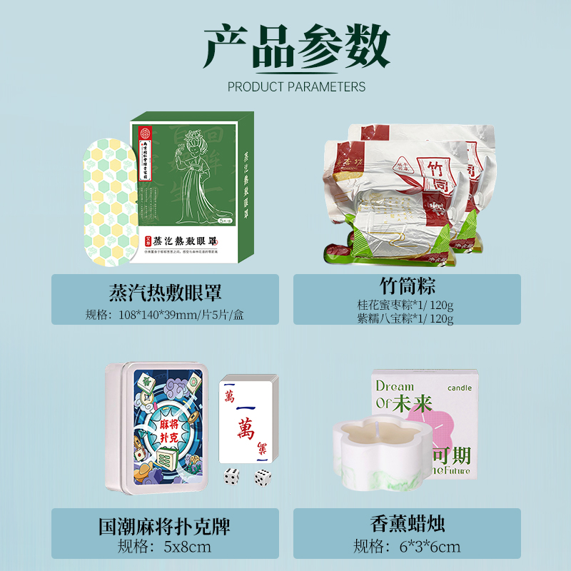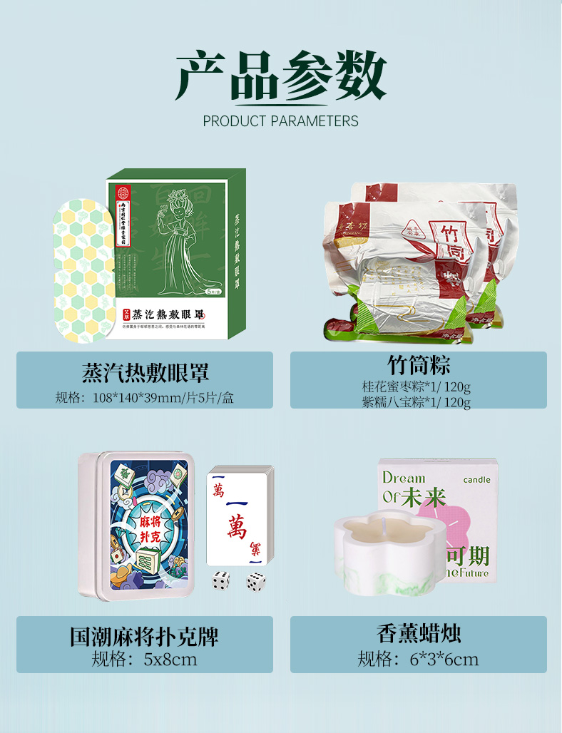 复古手提礼盒*1 ①竹筒粽*2 ②香薰蜡烛*1 ③蒸汽热敷眼罩*1 ④国潮麻将扑克牌*1
