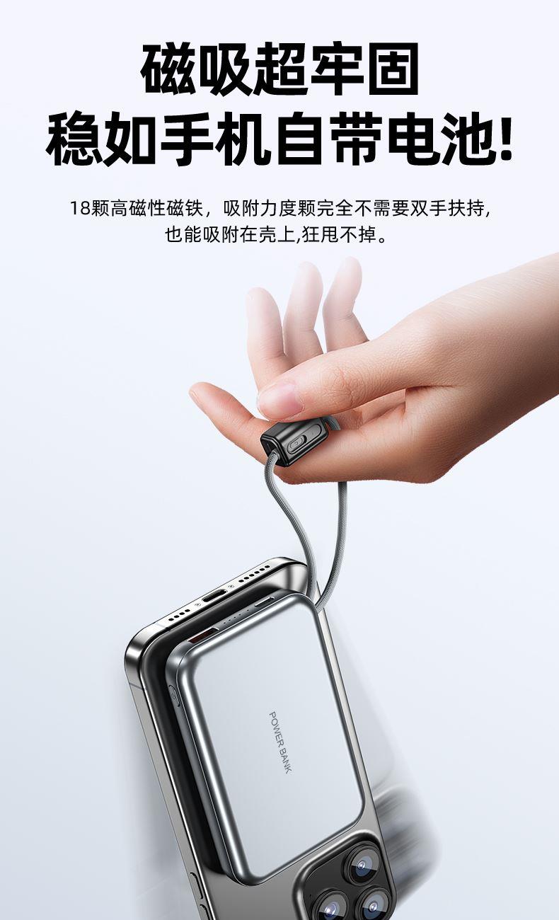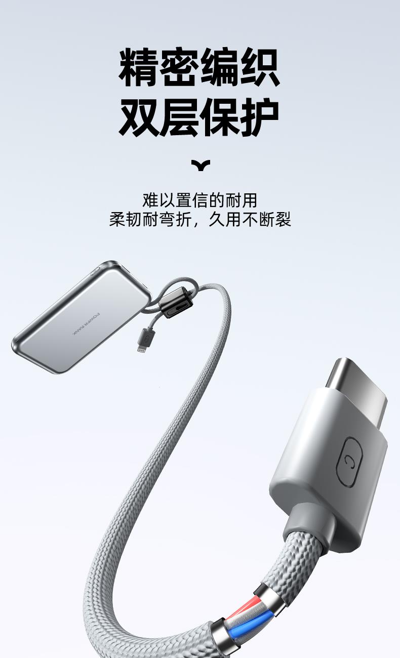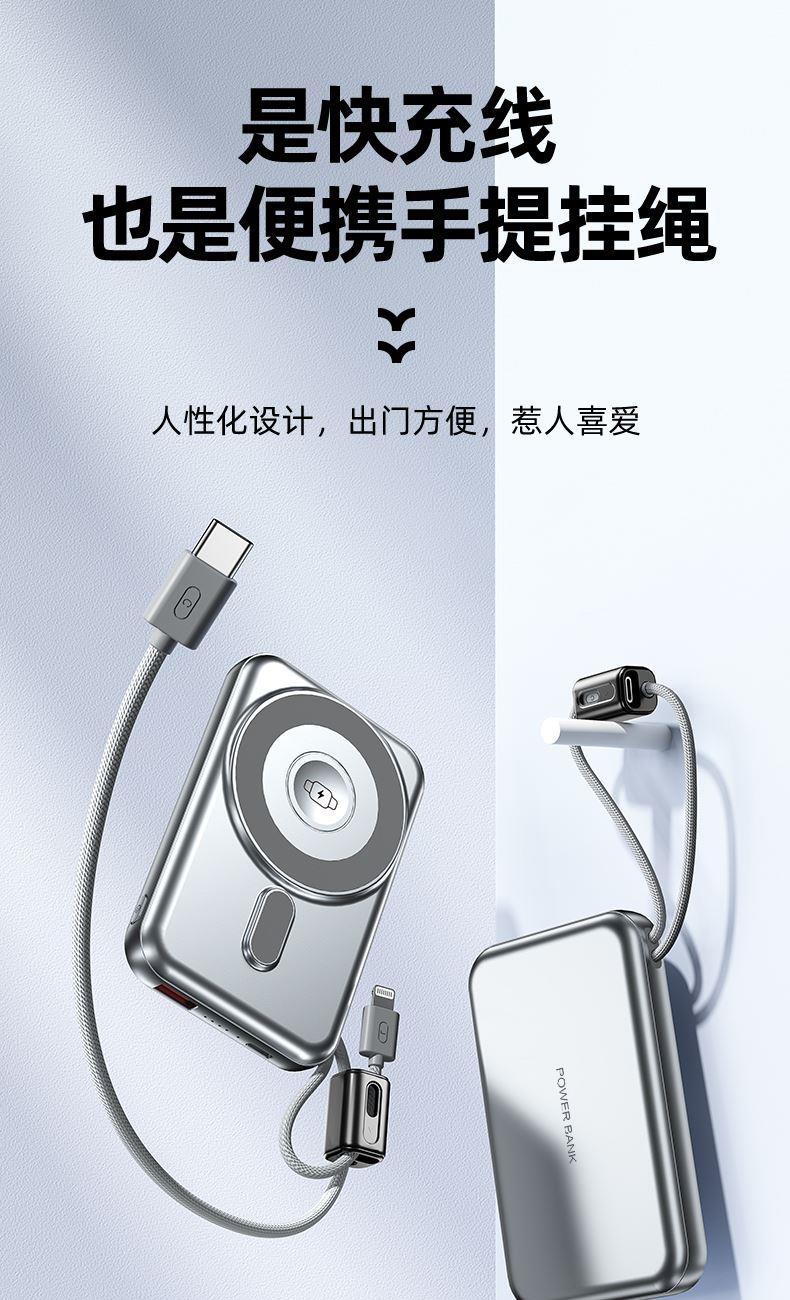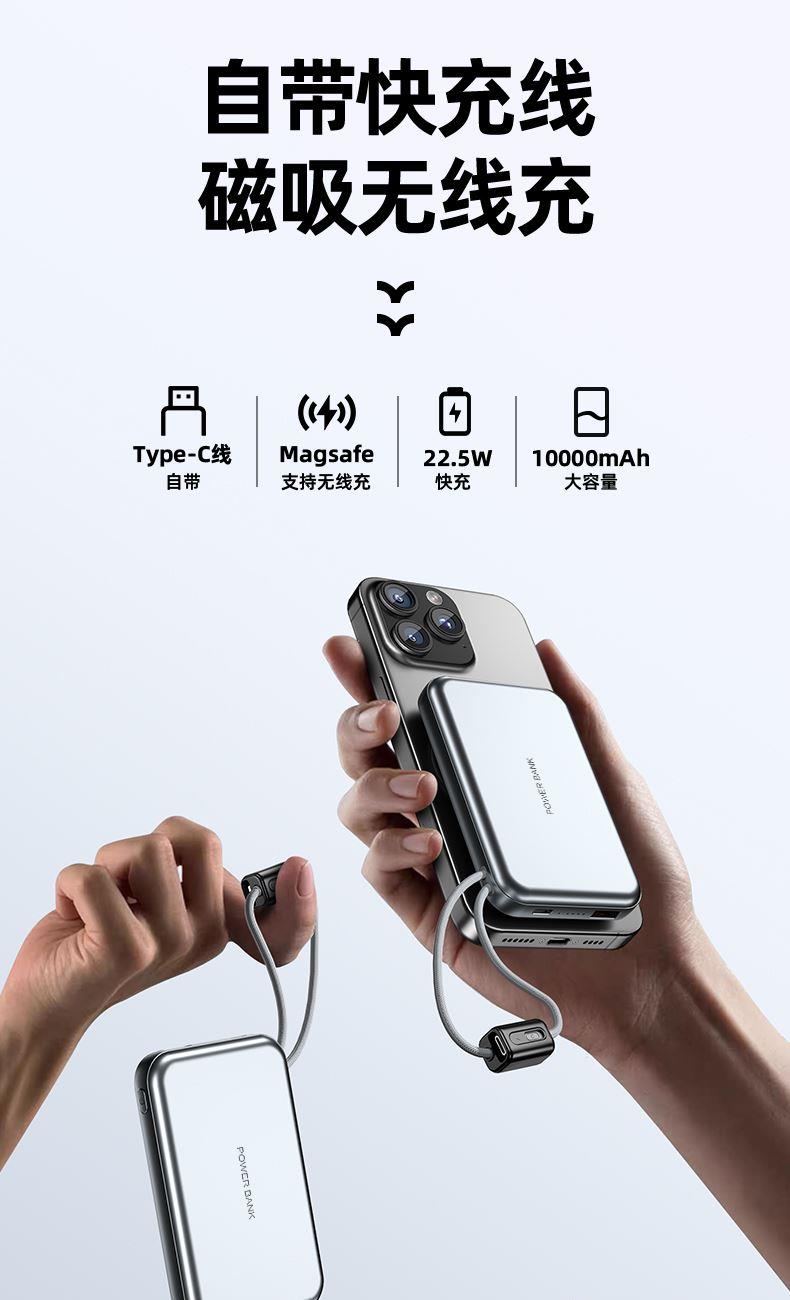 型 号: R16W 颜色 :米色 /灰色 电池 :聚合物*1pcs 电池类型 :聚合物动力电芯 容量:10000mAh 材质 :ABS+PC 尺寸 :68*108*16mm 功能特点 超薄铝合金简约设计,时尚大气; 22.5W超级快充,迅速充电; 10000mAh锂电池,澎湃动力; 自带苹果和Type-C充电线; 一输入三输出,支持苹果15手机 可充手机,手表,蓝牙耳机一件搞定