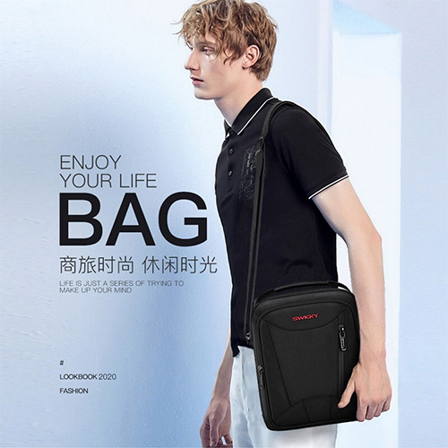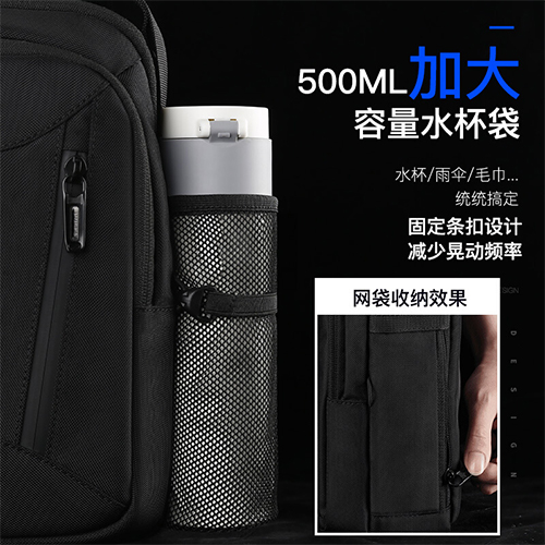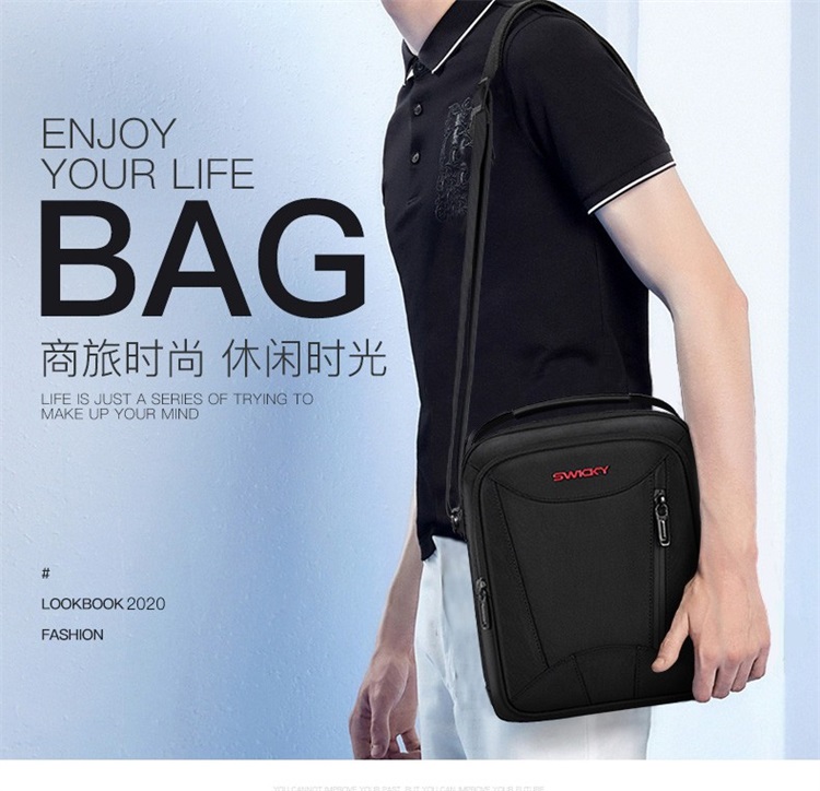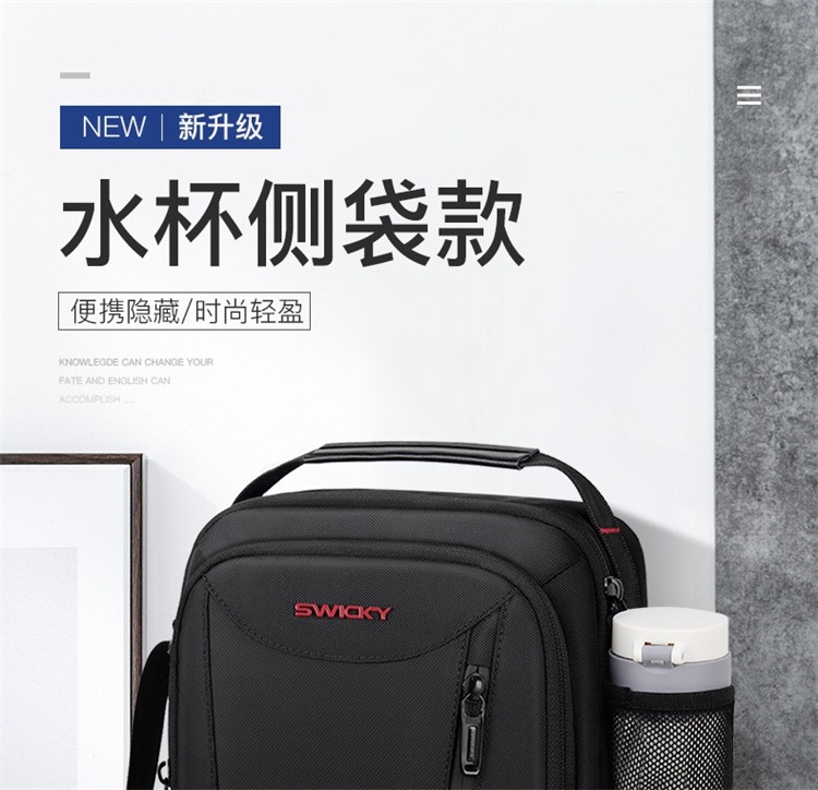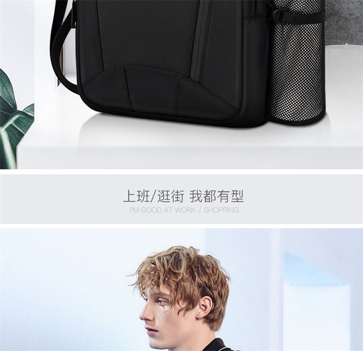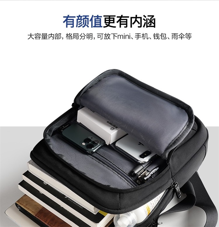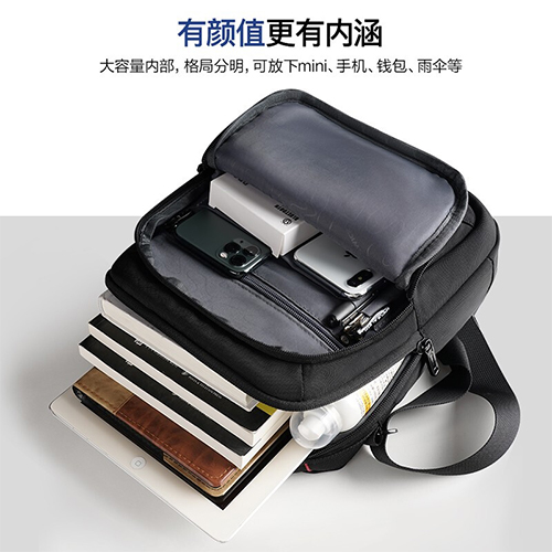 型 号:91425 尺 寸:280*220*110MM材 质:聚酯纤维 颜 色:黑色 重 量:0.4kg 单肩包:包型挺括,不易变形,不易起皱。大容量内部,格局分明,可放下mini、手机、钱包、雨伞等。商务休闲,隐藏式水杯袋·免洗面料·加大空间