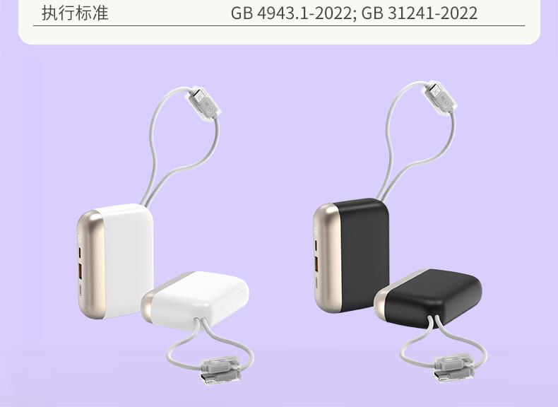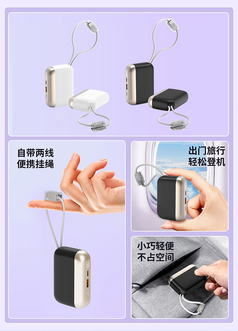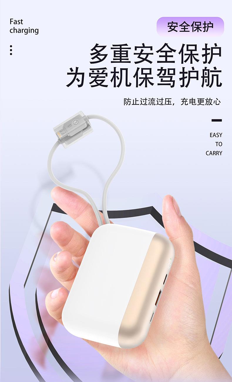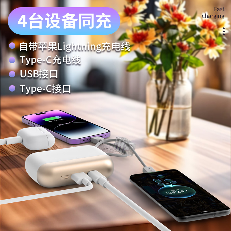 便捷收纳设计,自带苹果Lightning线和Type-C双充电线多接口设计满足4台设备同时充,防过流过压使充电更放心。