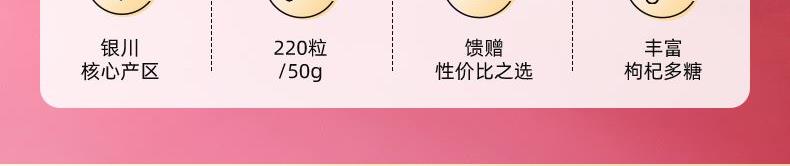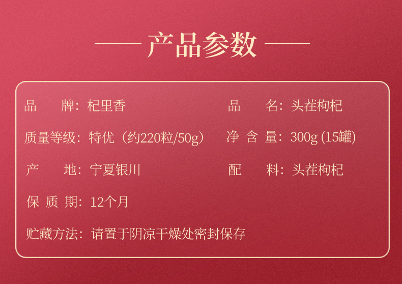 品 牌:杞里香 质量等级:特优(约220粒/50g) 产地:宁夏银川 品 名:头茬枸杞 净含量:300g(15罐) 配料:头茬枸杞 保质期:12个月 贮藏方法:请置于阴凉干燥处密封保存