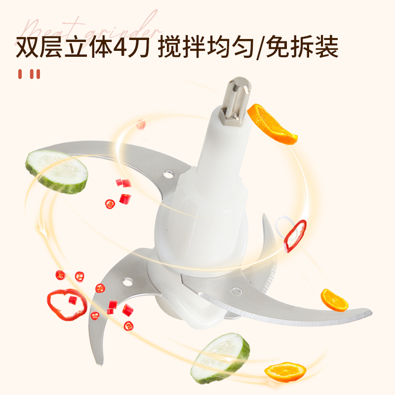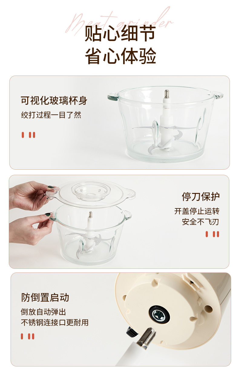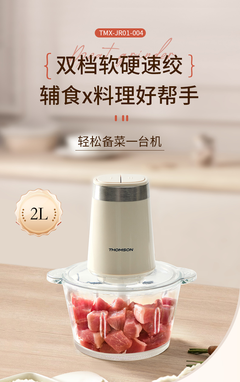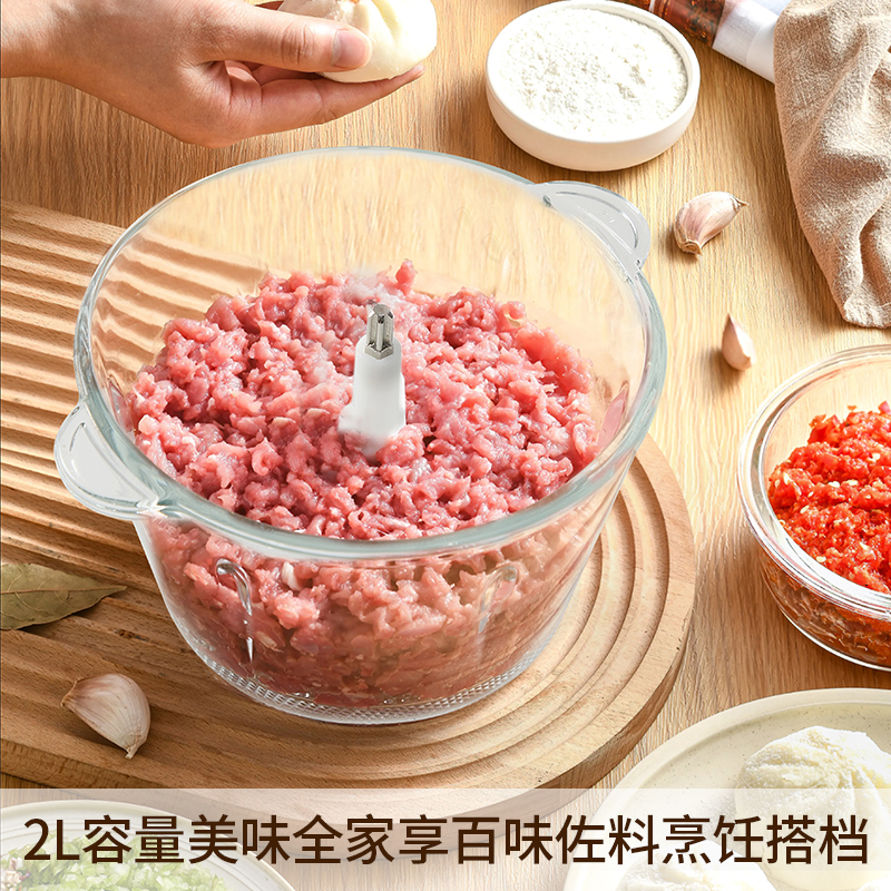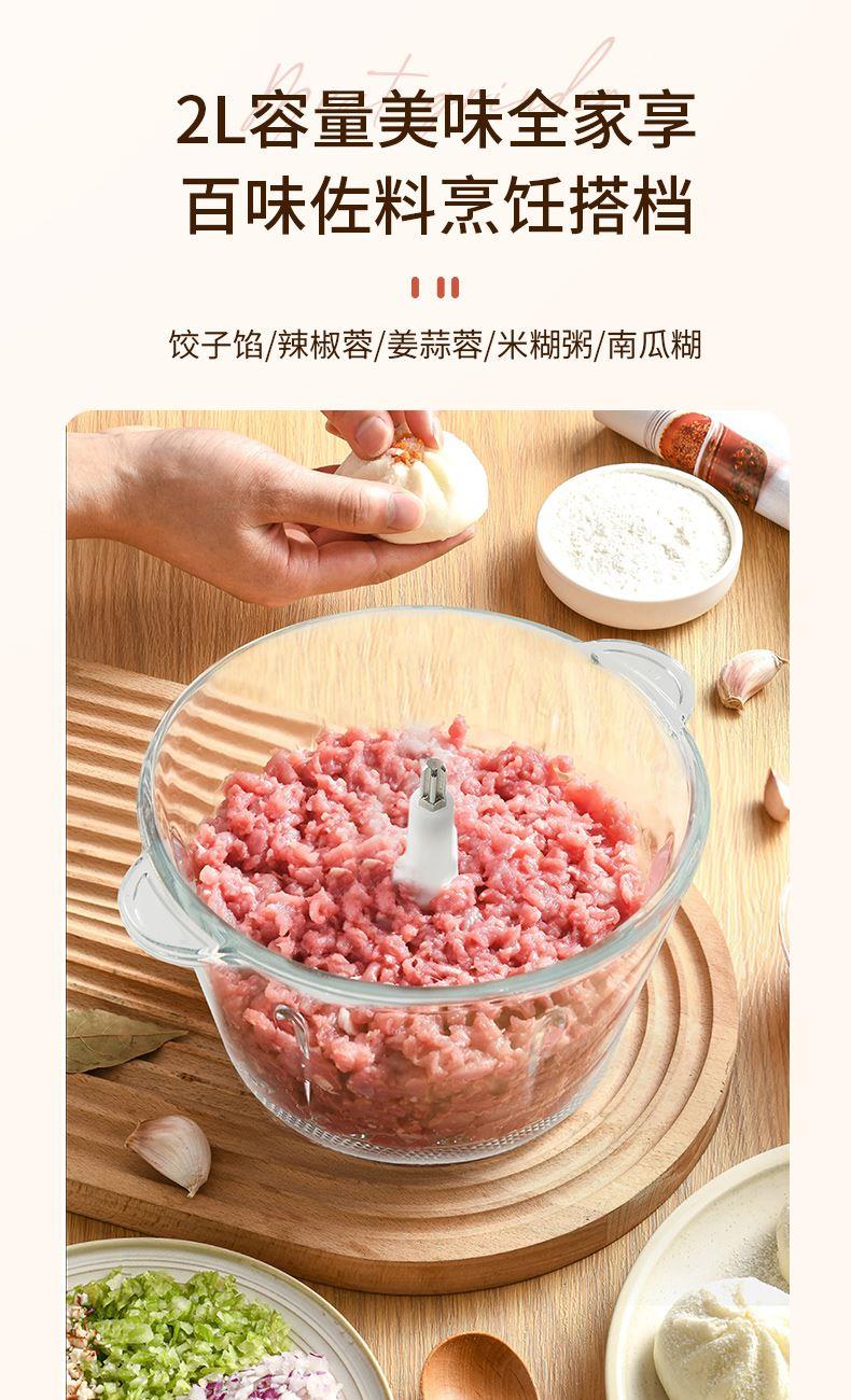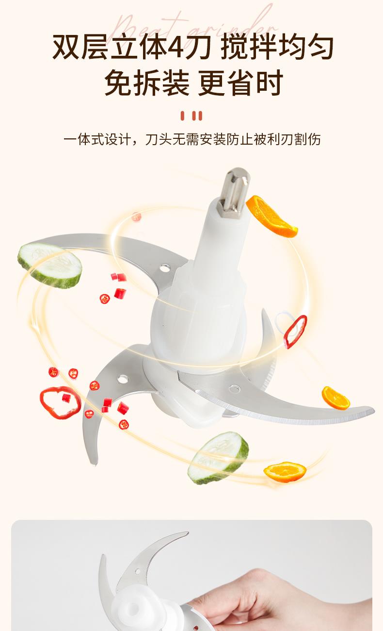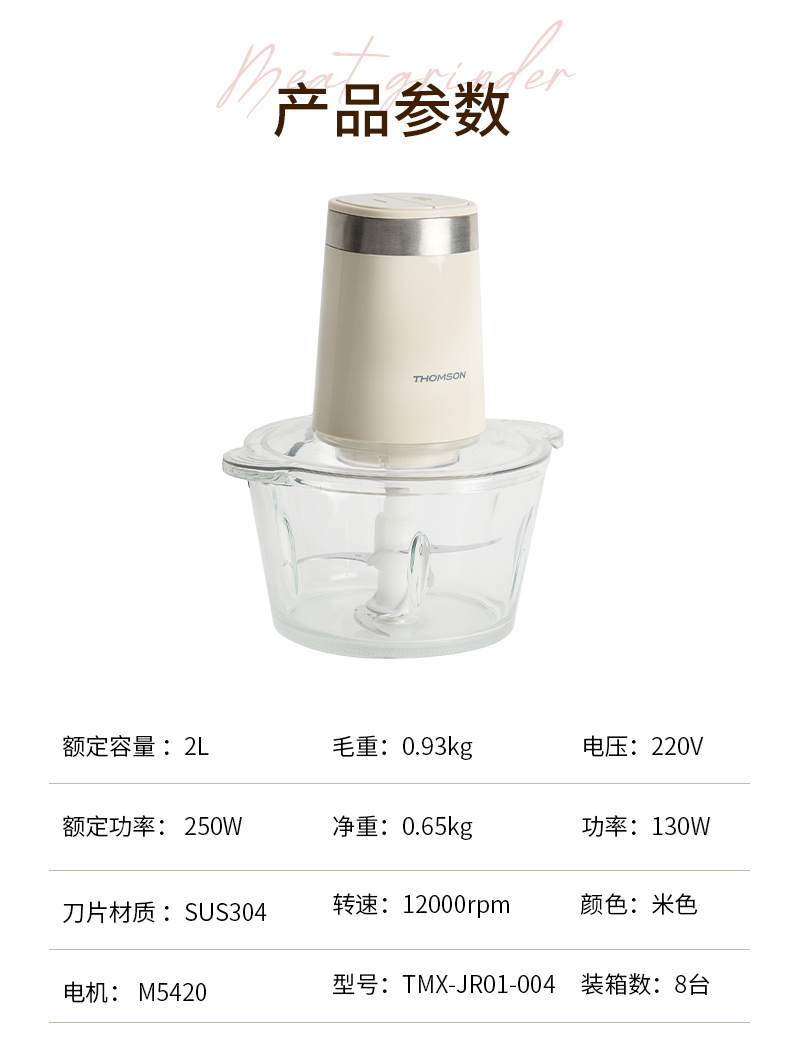 产品参数: 额定功率:250W 额定电压:220V~ 额定容量:2L 额定频率:50Hz 产品净重:0.65kg 产品毛重:0.93kg 刀片材质:SUS304 电机:M5420 电压220V 功率130W 转速12000rpm 彩盒尺寸:320*215*170mm 外箱尺寸:638*440*360mm 产品卖点: 双档软硬速绞,辅食x料理好帮手 2L容量美味全家享,百味佐料烹饪搭档 双层立体4刀,搅拌均匀免拆装更省时 整机拆卸无死角,隔离杯盖易清洗