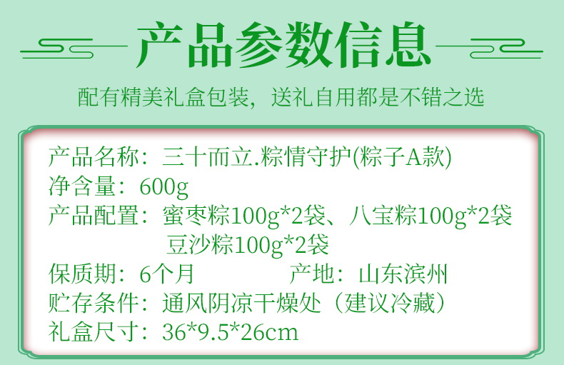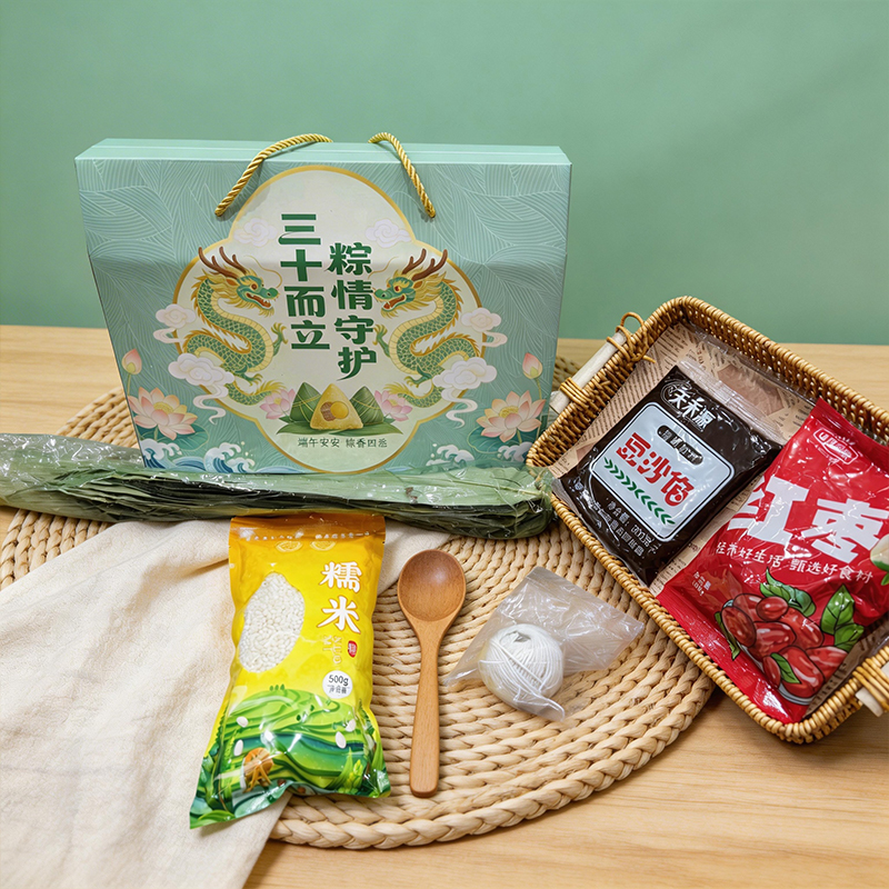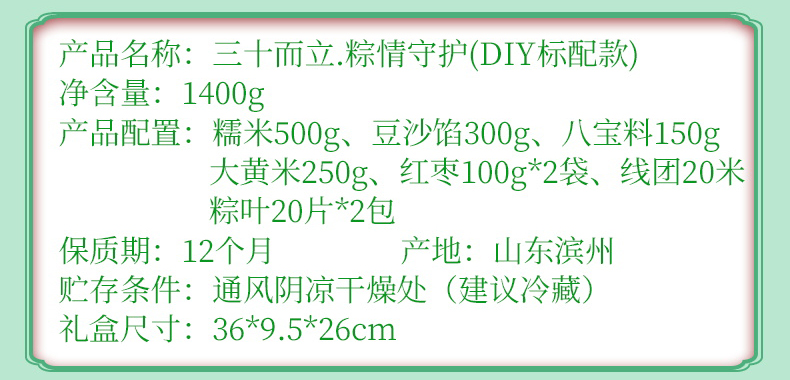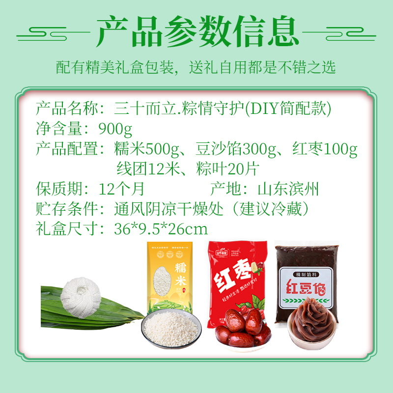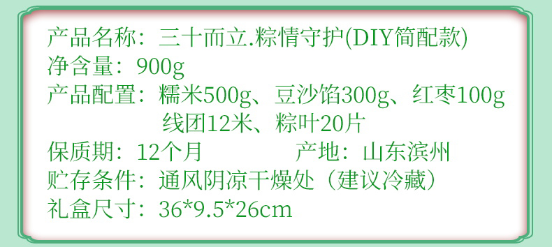 礼盒:DIY简配款 净含量:900g 产品规格配置:糯米500g、豆沙300g红枣100g、线团12米粽叶20片 盒尺 寸:36*26*9.5cm 尺寸:60*37.5*54 0.122方 箱重量:15kg