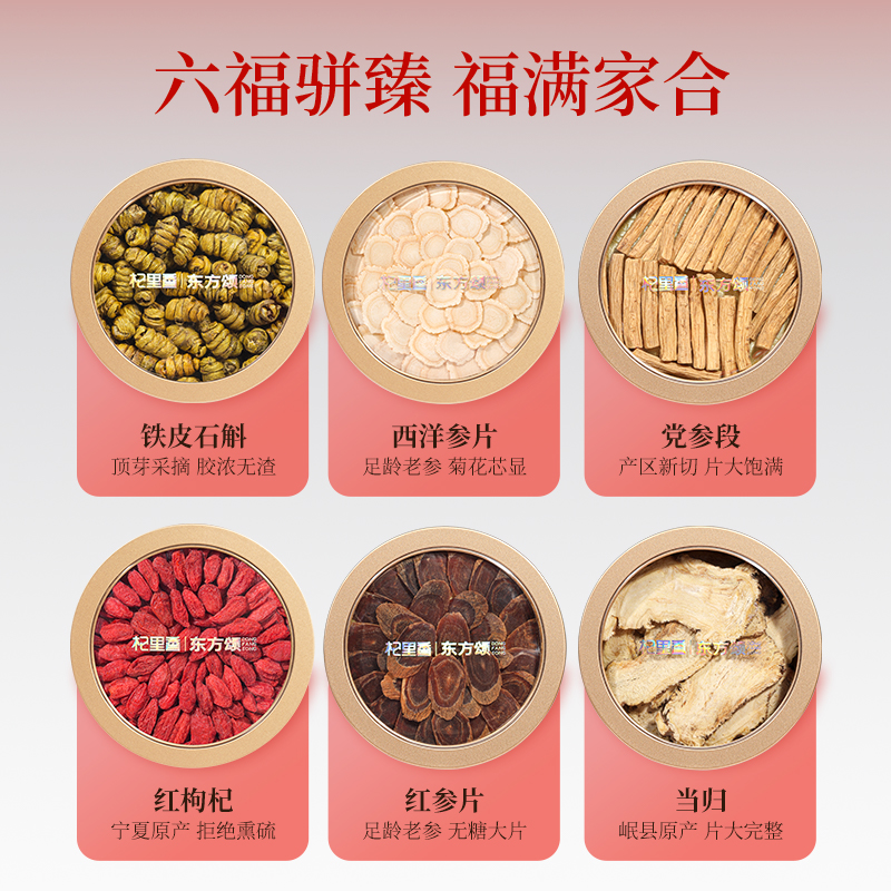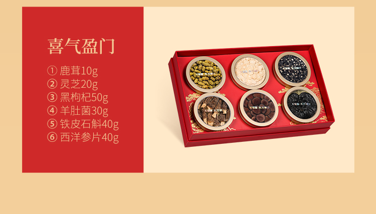 禄运吉祥:西洋参片40g、铁皮石斛40g、党参段50g、红枸杞100g、红参片40g、当归40g