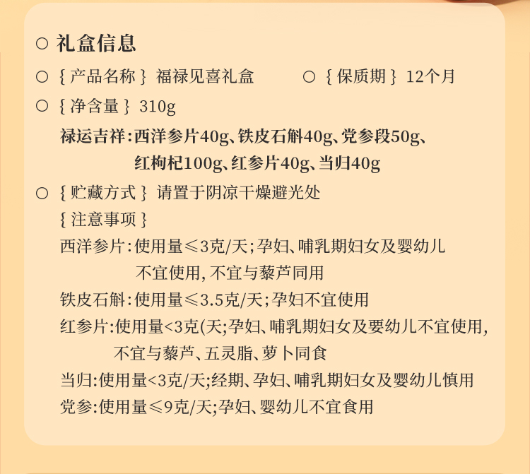 {注意事项}西洋参片:使用量≤3克/天;孕妇、哺乳期妇女及婴幼儿不宜使用,不宜与藜芦同用铁皮石斛:使用量≤3.5克/天;孕妇不宜使用
