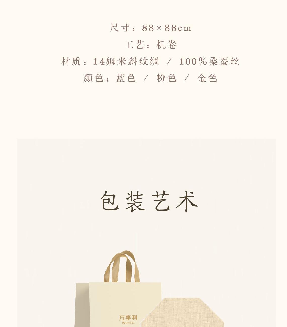 编码:CWMA09068288 礼盒内含:中方巾*1 灵川金桂系列·无火香薰*1 灵川金桂系列·空气香氛*1 中方巾规格: 尺寸:88×88cm 工艺:机卷 材质:14姆米斜纹绸、100桑蚕丝 颜色:蓝色/粉色/金色