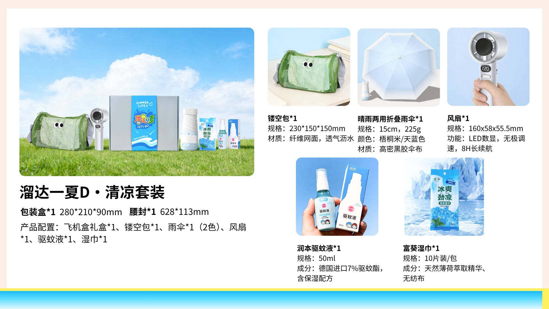 腰封*1 628*113mm 包装盒*1 280*210*90mm 产品配置:飞机盒礼盒*1、镂空包*1、雨伞*1(2色)、风扇1、驱蚊液*1、湿巾*1