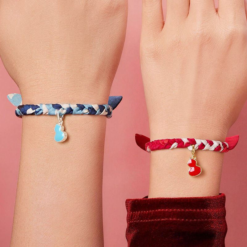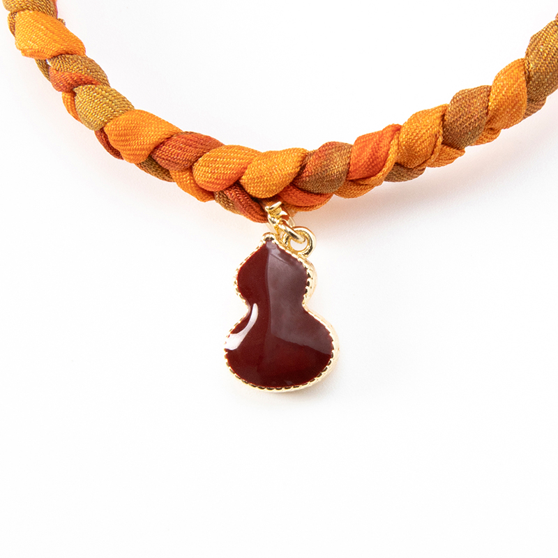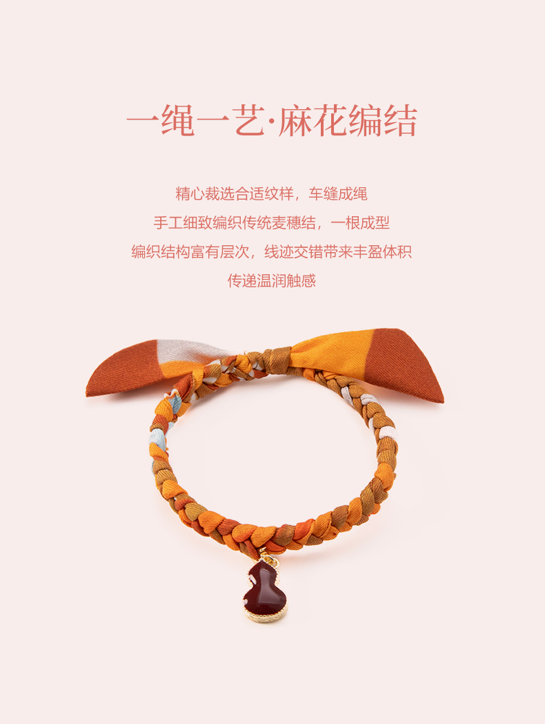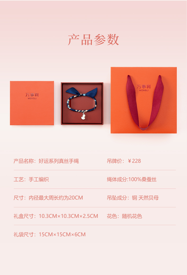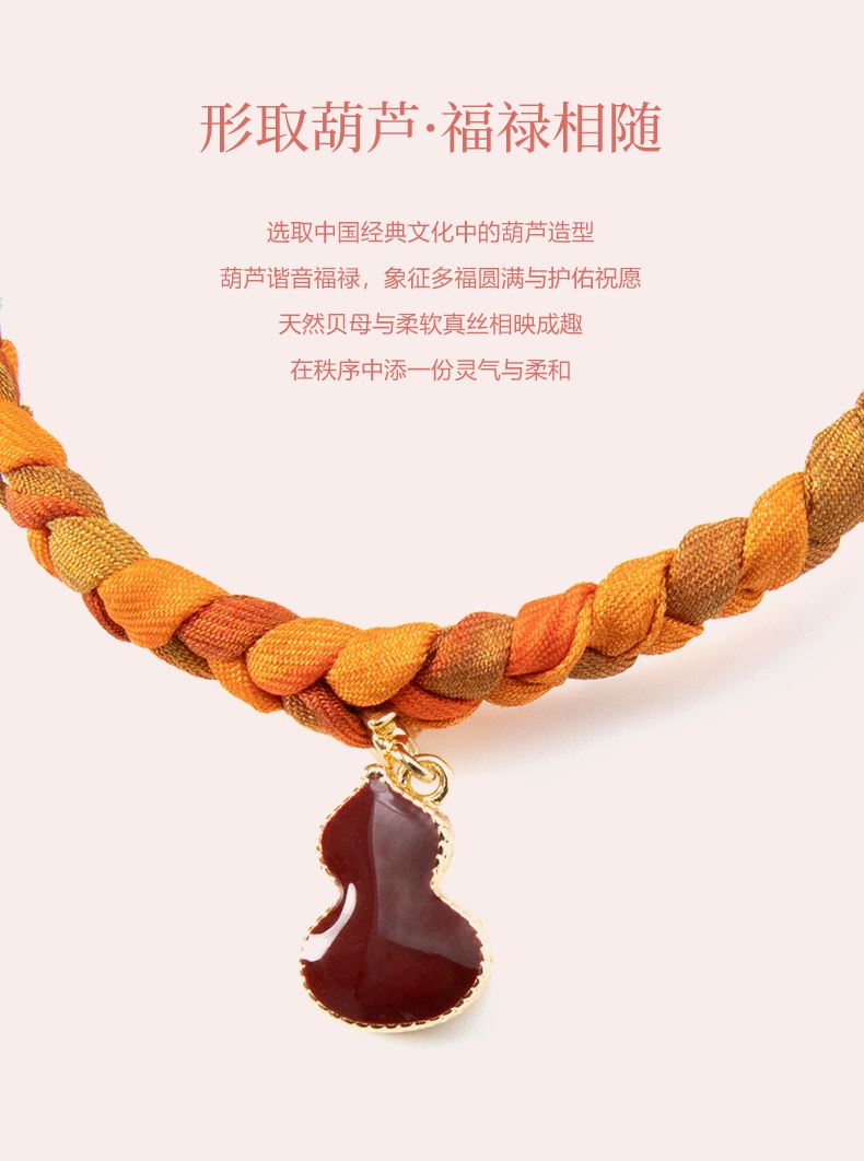 商品编码:CWMA01108449 规格:zui小周长17cm ,zui大周长20cm 面料工艺:主体绳体:100桑蚕丝,喷印+编织 装饰葫芦:铜镀真金+天然贝母 颜色:随机花色