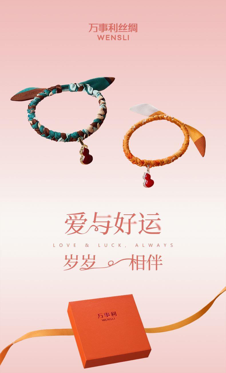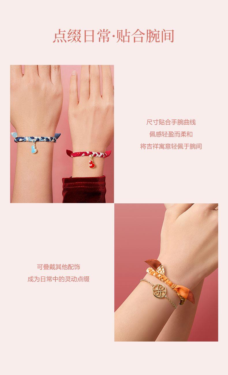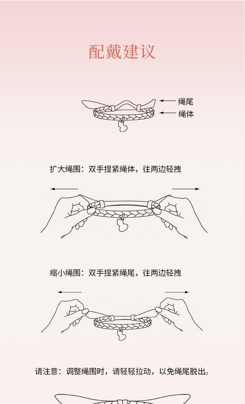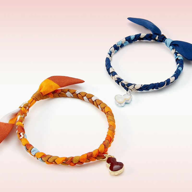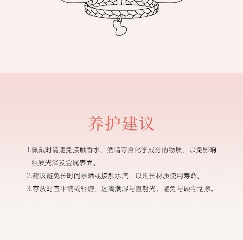 商品编码:CWMA01108449 规格:zui小周长17cm ,zui大周长20cm 面料工艺:主体绳体:100桑蚕丝,喷印+编织 装饰葫芦:铜镀真金+天然贝母 颜色:随机花色