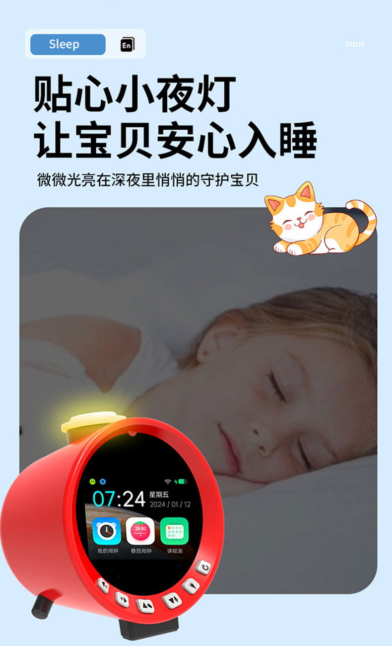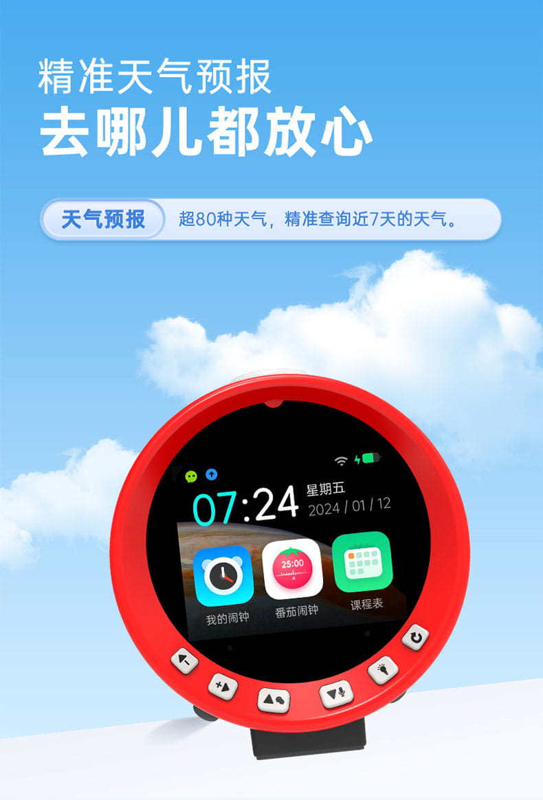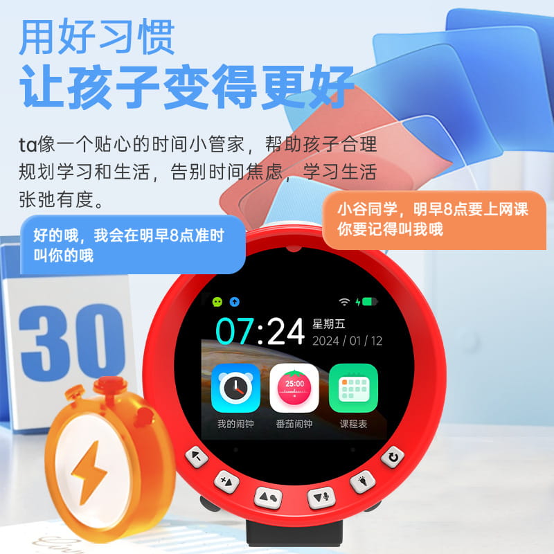 产品尺寸:150*150*100mm 电池容量:2000mAh 操作方式:单点触摸 连接方式:蓝牙、WIFI 产品颜色:红色 整套毛重:350g 整箱数量:60 智能语音交互,语音唤醒,智能问答,语音查词 番茄时间管理法,可设置50组闹钟 内置喜马拉雅少儿 K12全科教材在线同步学习