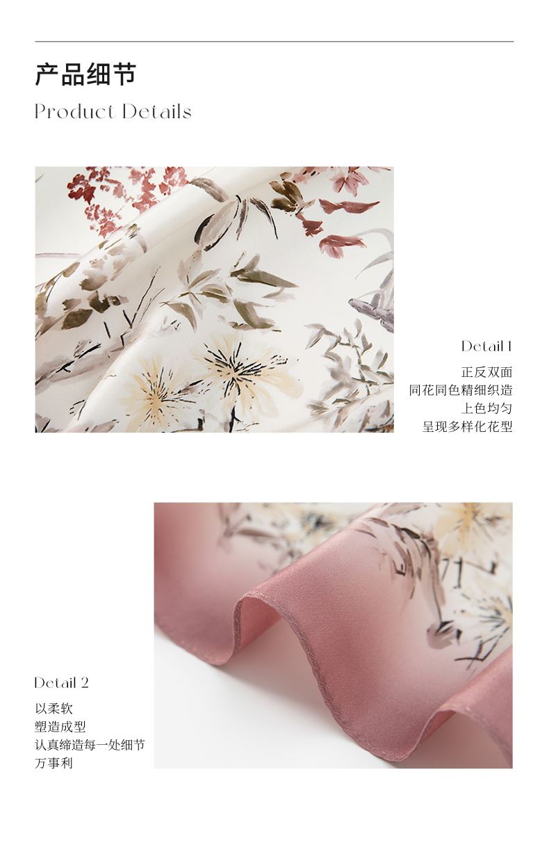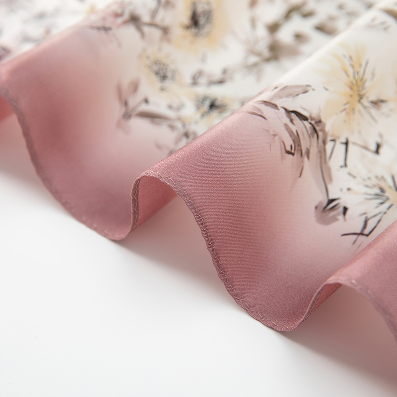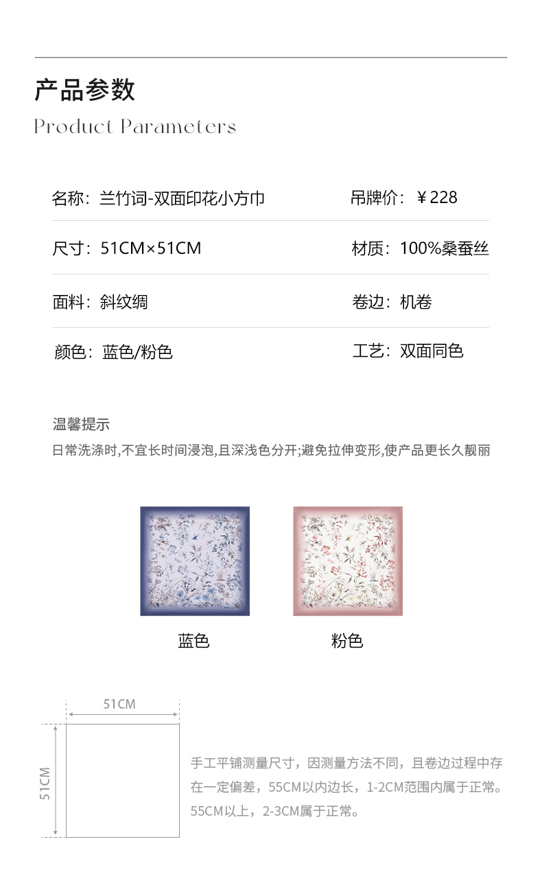 尺寸:51CMx51CM 材质:100桑蚕丝 面料:斜纹绸 卷边:机卷 颜色:蓝色/粉色 工艺:双面同色