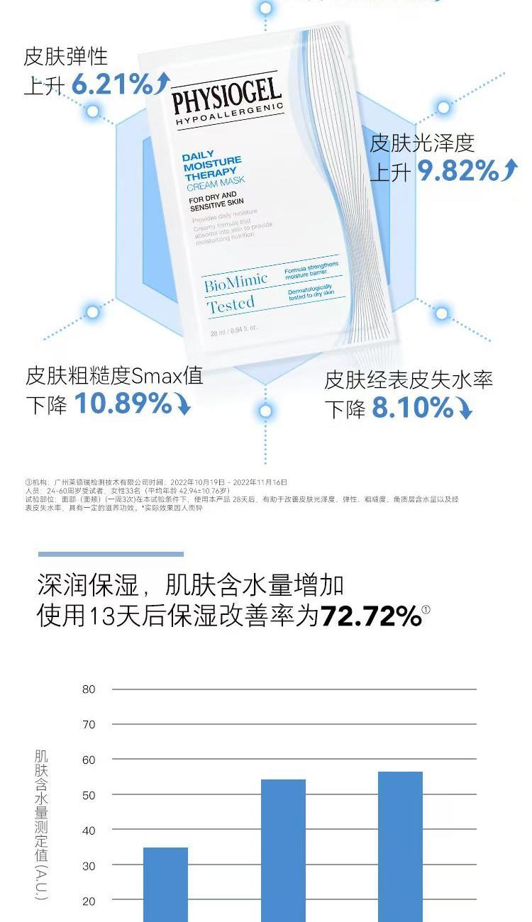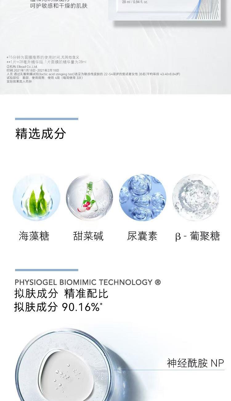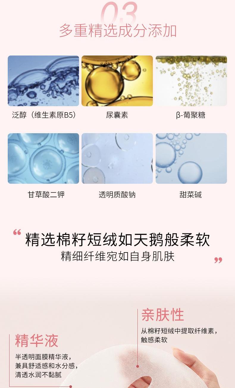 舒缓修护,维稳安肤,强韧屏障(特殊美容后适用) 精选棉籽短绒如天鹅般柔软,精细纤维宛如自身肌肤; 精华液:半透明面膜精华液,兼具舒适感和水分感,清透水润不黏腻; 亲肤性:从棉籽短绒中提取纤维素,触感柔软; 吸收力:紧锁精华液,密集保湿,轻拍更好吸收。 密集保湿,深入补水,奶油乳状般浓稠盈润质地密集保湿,帮助肌肤焕活水润嫩泽,坚持使用改善肌肤缺水状态; 敏感肌适用 :温和无刺激配方,呵护敏感和干燥的肌肤