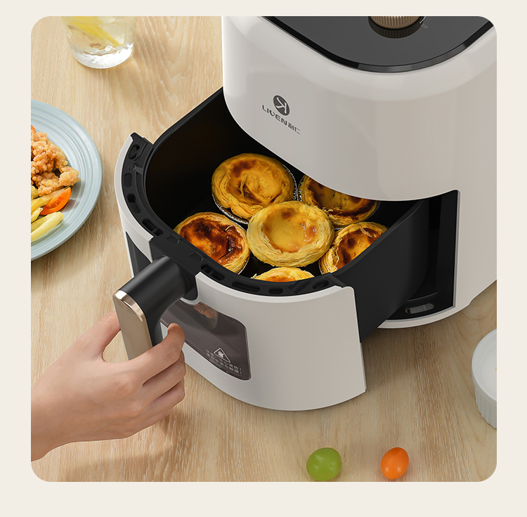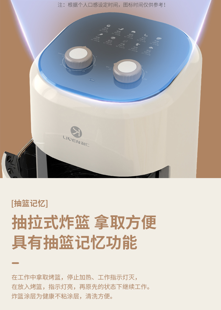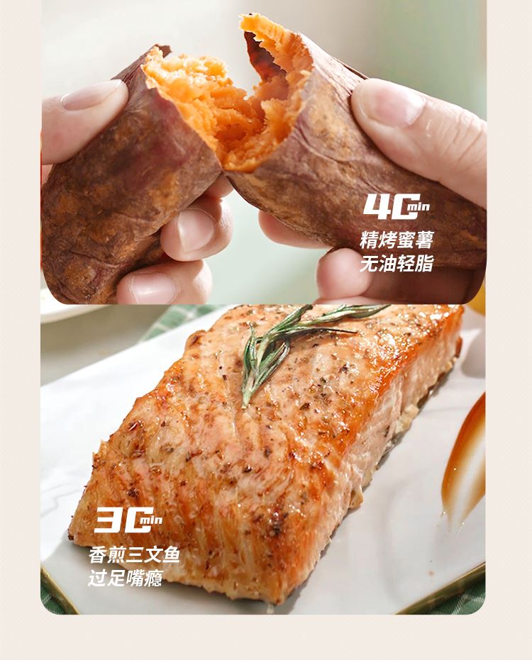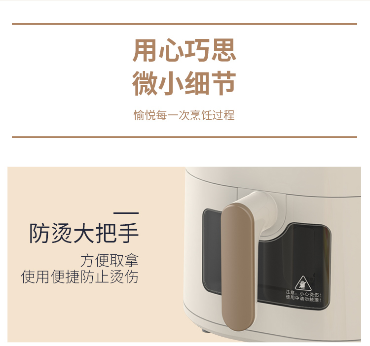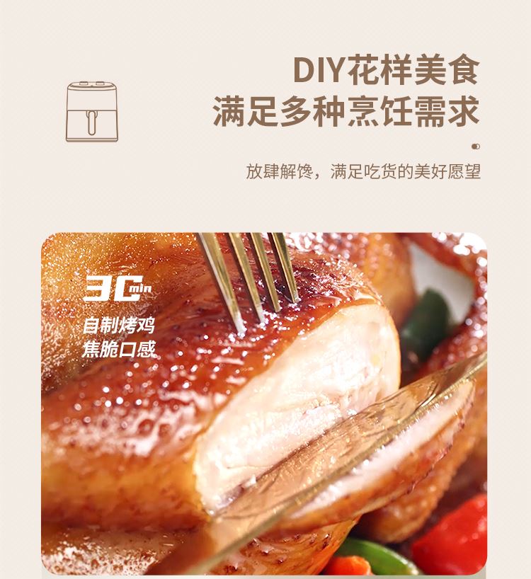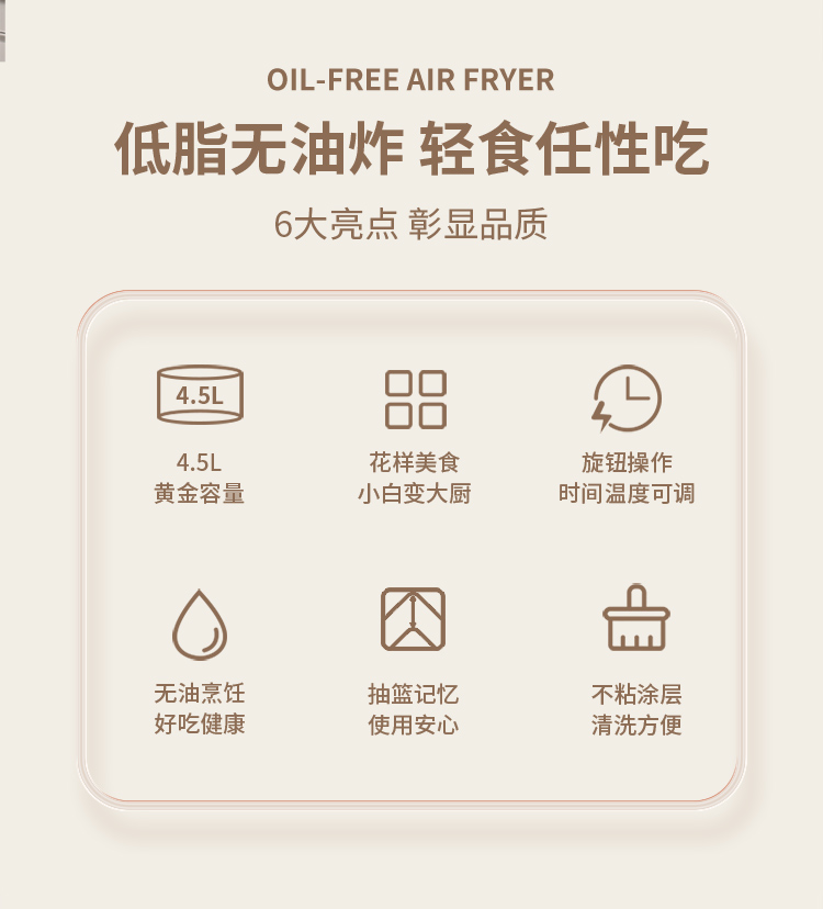 6大亮点,旋钮操作,时间温度可调 4.5L黄金容量,不粘涂层,清洗方便 抽蓝式炸篮,拿取方便,具有抽篮记忆功能 微蒸汽空气烤,口感鲜嫩多汁 一旋一扭,美味就绪,下厨无负担 防烫大把手,便捷收线,轻松收纳