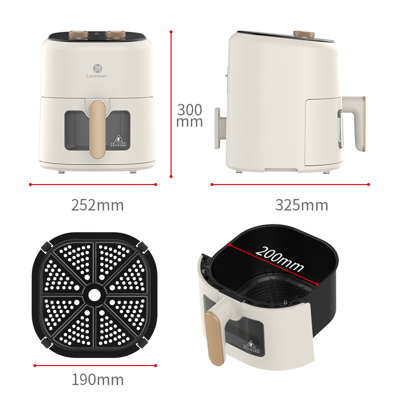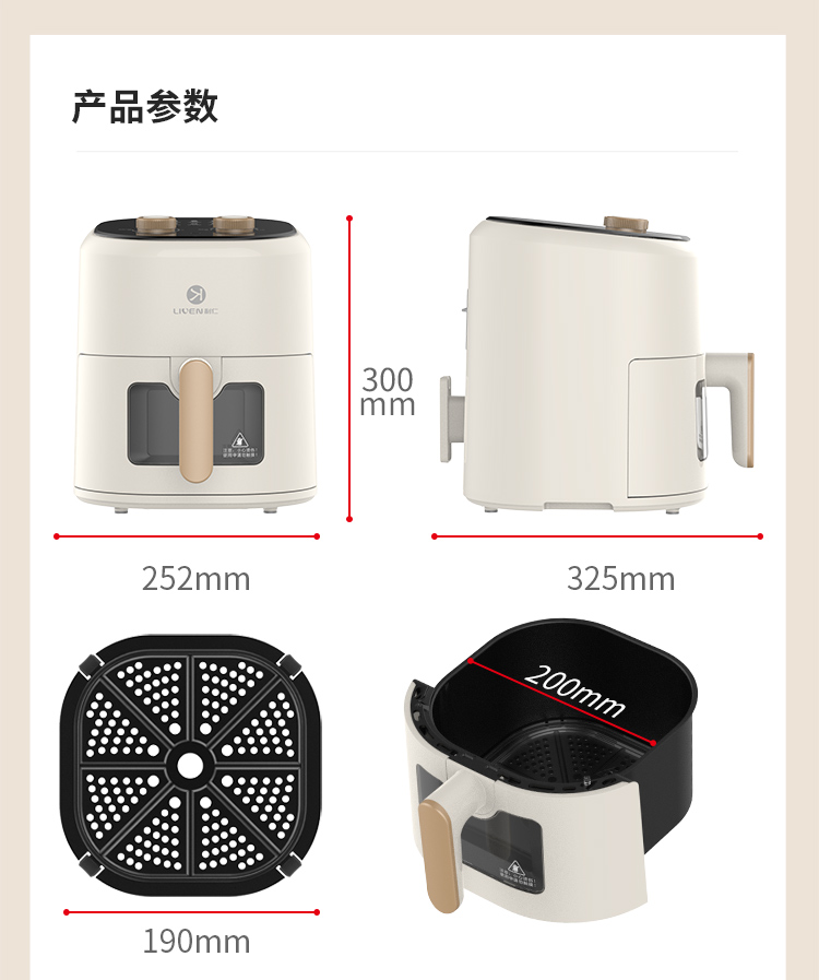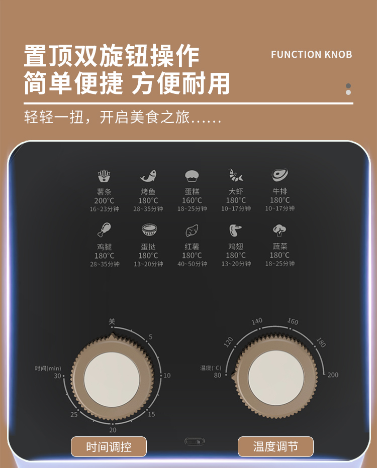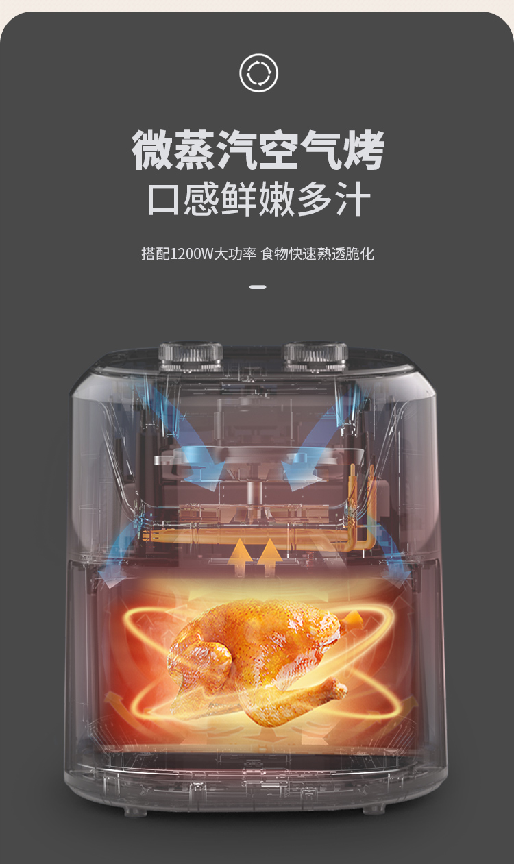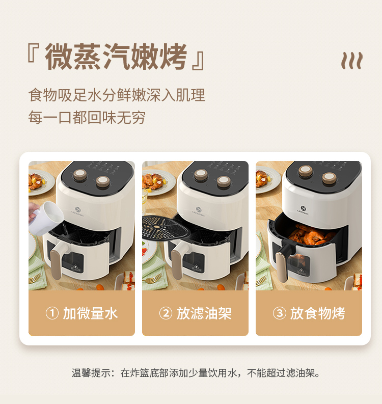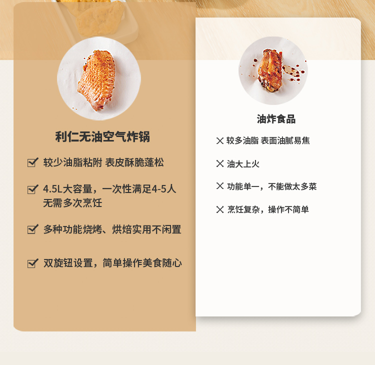 6大亮点,旋钮操作,时间温度可调 4.5L黄金容量,不粘涂层,清洗方便 抽蓝式炸篮,拿取方便,具有抽篮记忆功能 微蒸汽空气烤,口感鲜嫩多汁 一旋一扭,美味就绪,下厨无负担 防烫大把手,便捷收线,轻松收纳