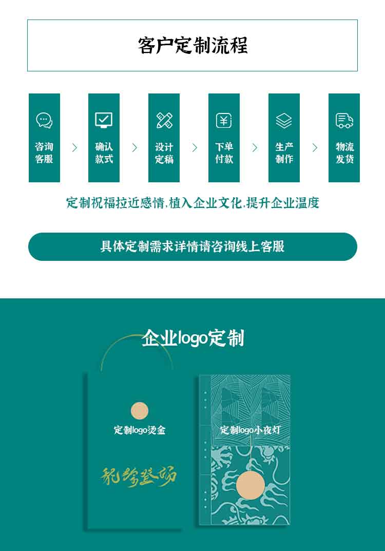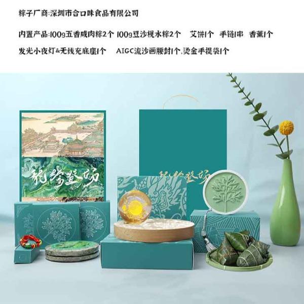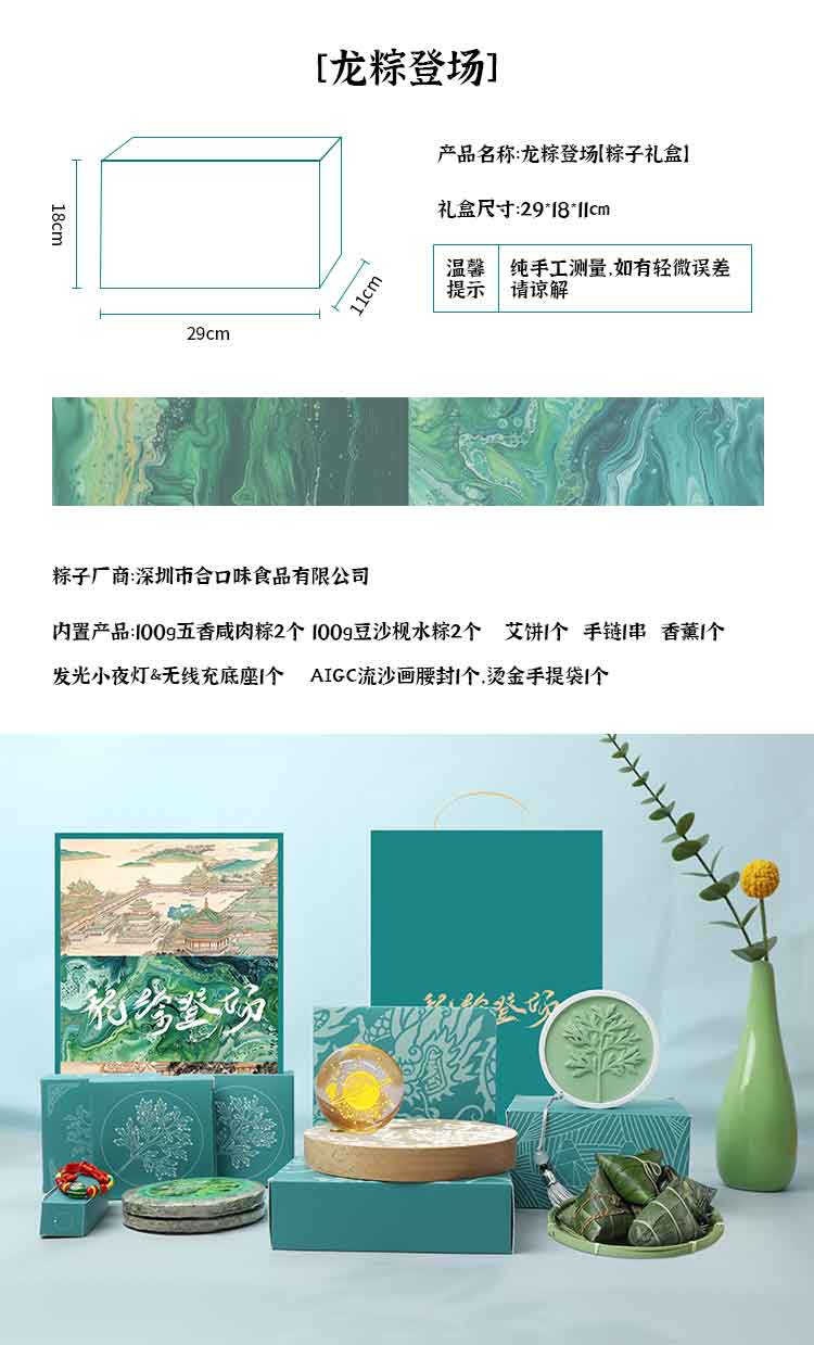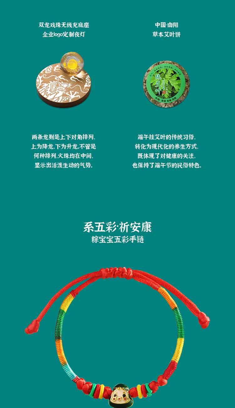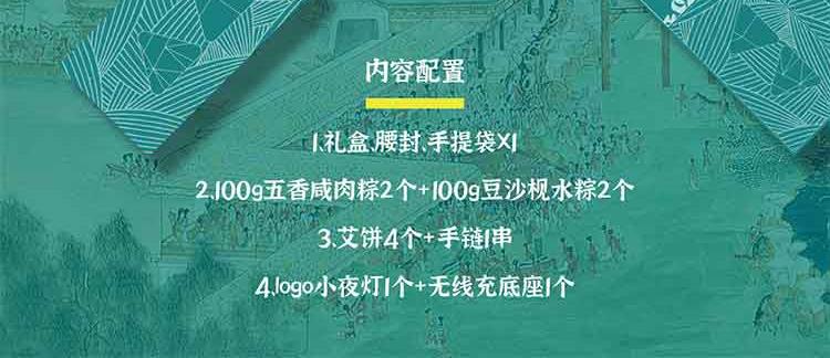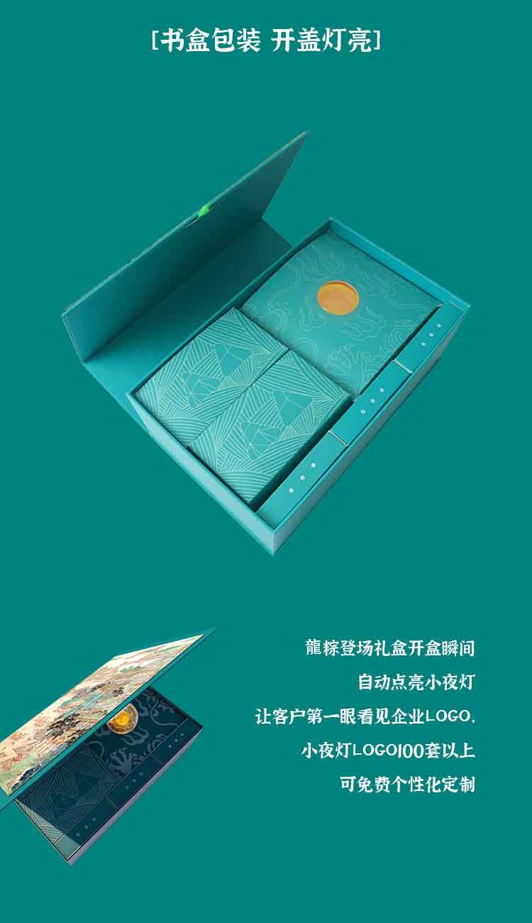 礼盒礼袋*1 粽子4个 香薰片1个 无线充支架一个 水晶球1个 手链1个 艾饼1个 开盒瞬间自动点亮小夜灯,让客户一眼看见企业LOGO,可个性化定制图案或LOGO