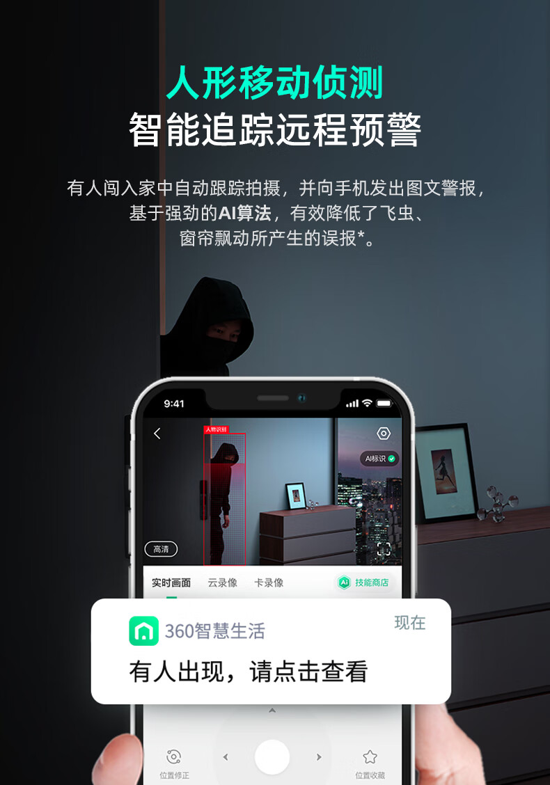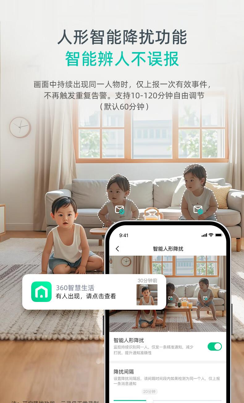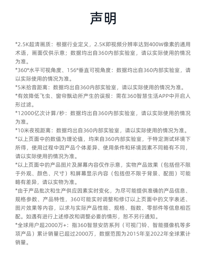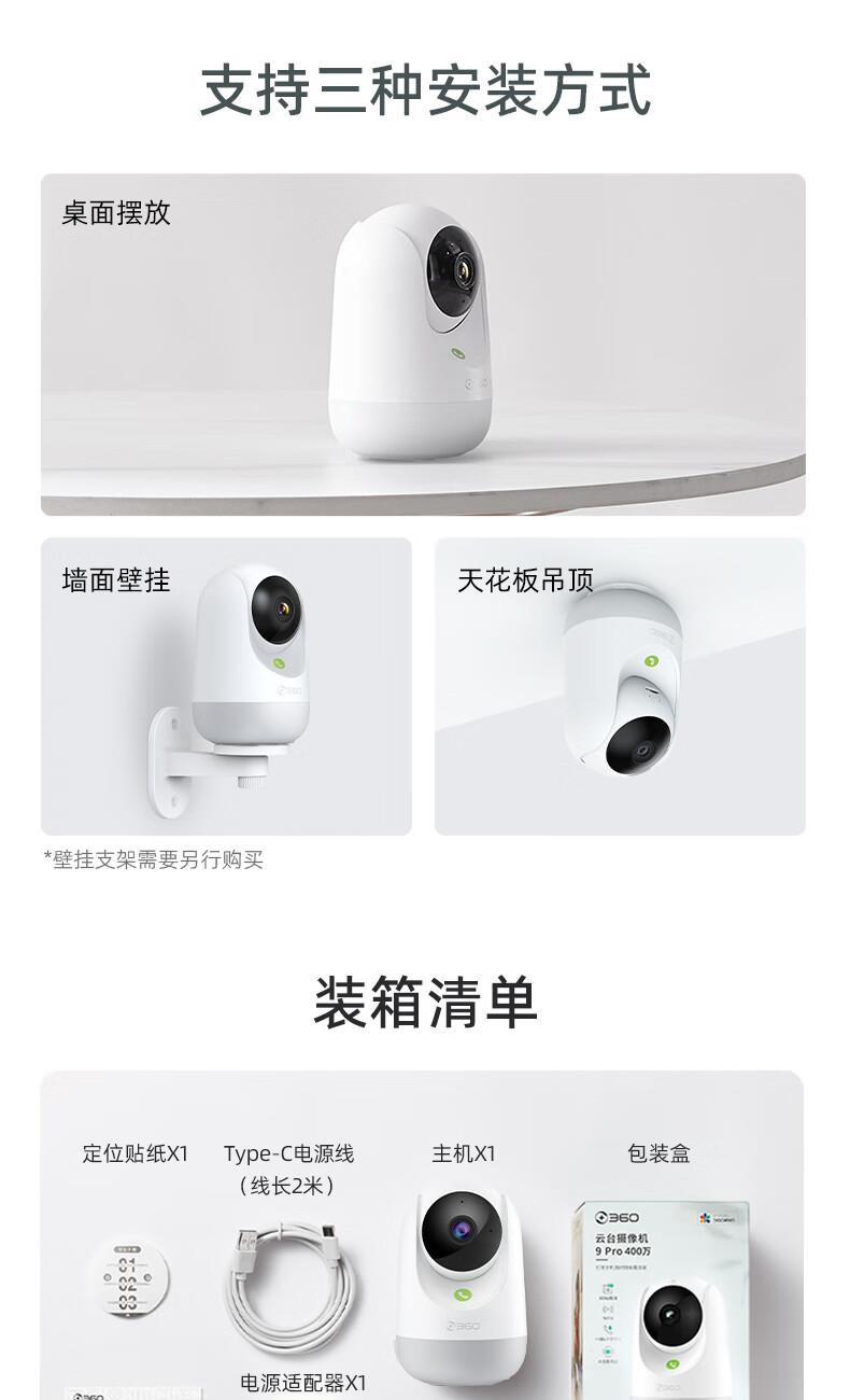 产品参数: 1、400W像素、旋转角度:水平360°,垂直156°、微光全彩。 2、重量:0.42kg、包装尺寸:95*90*160mm 产品功能: 1、360智能双频摄像头 2、看娃、看宠物、看老人、看门店多场景守护者 3、接入Deepseek,智能远程操纵设备,动嘴不动手 4、2.5K真高清 5、支持电脑、PC端、APP实时查看,满足不同场景使用:商超、仓库、餐饮等中小微企业客户,支持多人同时查看。(搭配360视觉云)