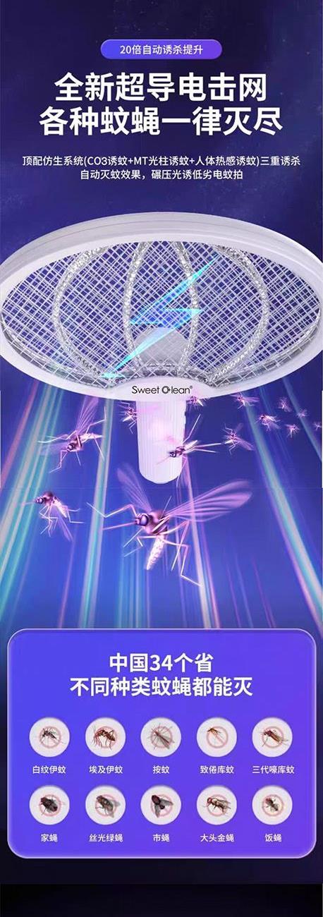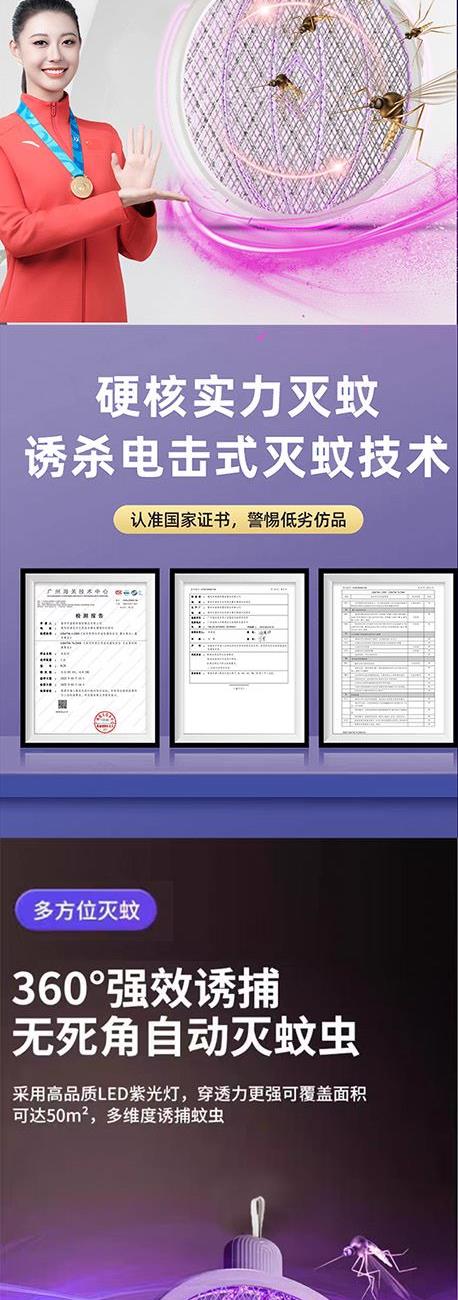 额定电压:5V 额定功率:3W 型料材质:PP 输出电压:3000V~ 产品尺寸:23*44.5CM 旋转折叠一拍双用多重保护,3000V高密度电网全新的塑网防护设计,365nm变频光波自动诱蚊,两种灭蚊模式即是电蚊拍也是灭蚊灯。轻松转换壁挂自动灭蚊,吸引蚊虫智能灭蚊省心省力,3000mAh锂电池强劲持久续航,充电时间为2小时,充满约可使用一个月。