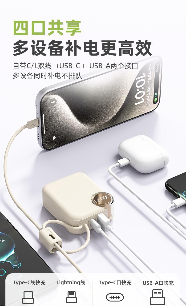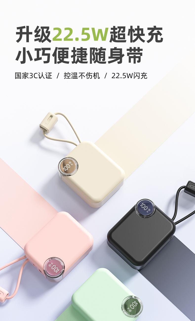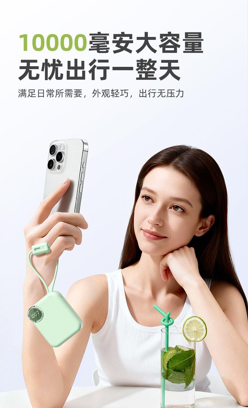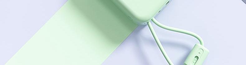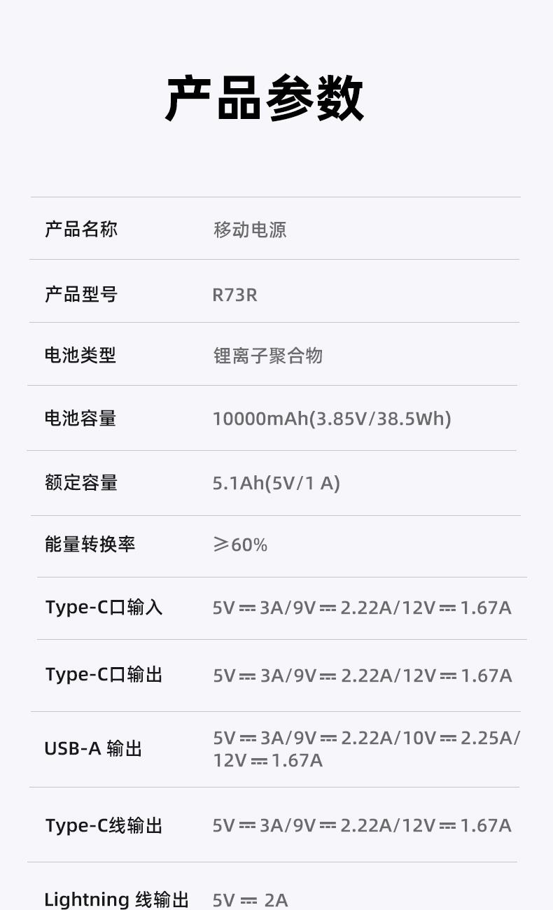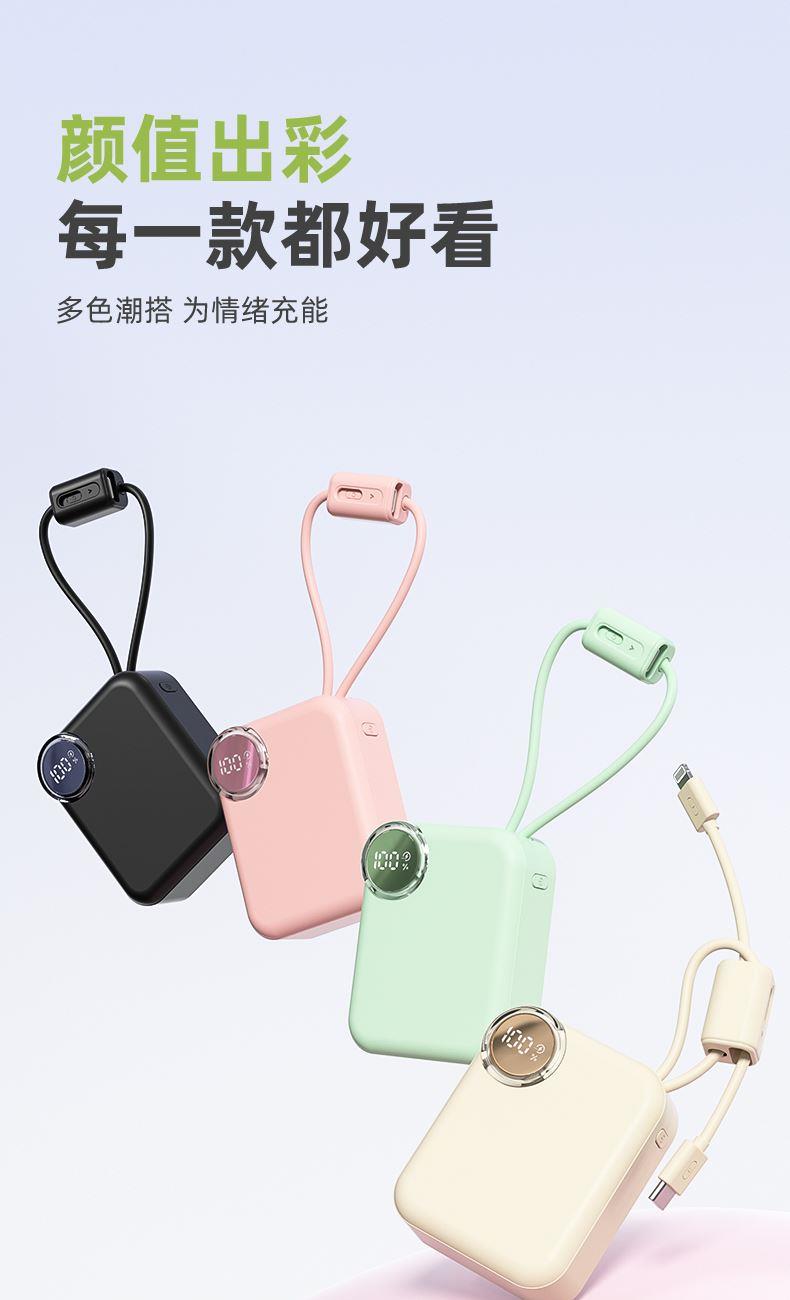 型 号: R73R 颜色 :米色 /绿色/ 蓝色/ 粉色/ 电池 :锂离子聚合物电池*1pcs 电池类型 :动力电芯 容量:10000mAh 材质 :ABS+PC 尺寸 :71*62*28MM 功能特点 马卡龙配色,时尚大气; 22.5W超级快充,迅速充电; 10000mAh锂电池,澎湃动力; 自带苹果和Type-C充电线; 一输入三输出,支持苹果15手机 智能数显查看电量