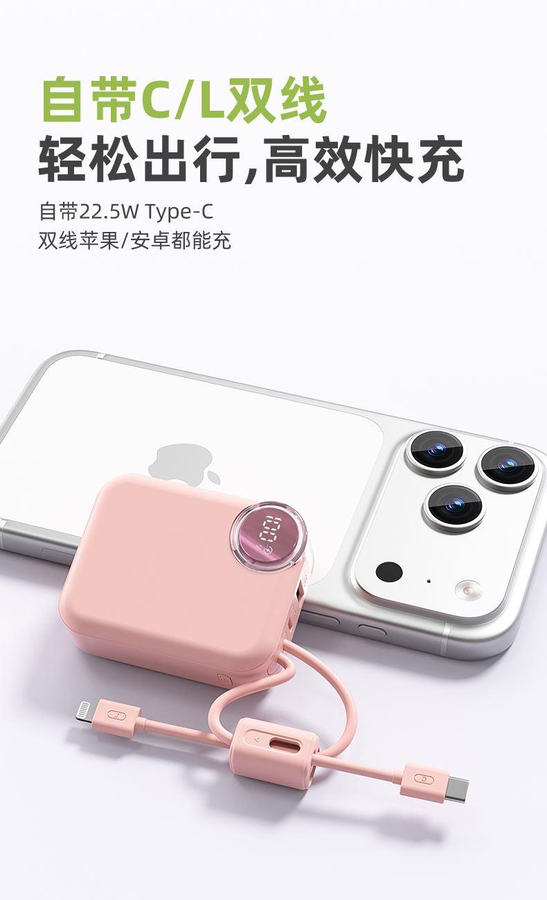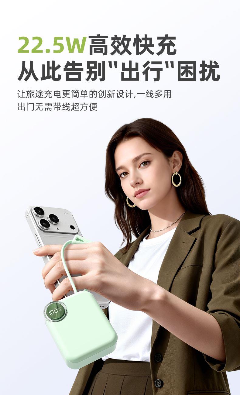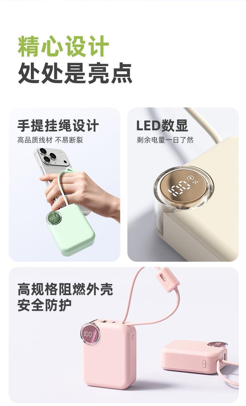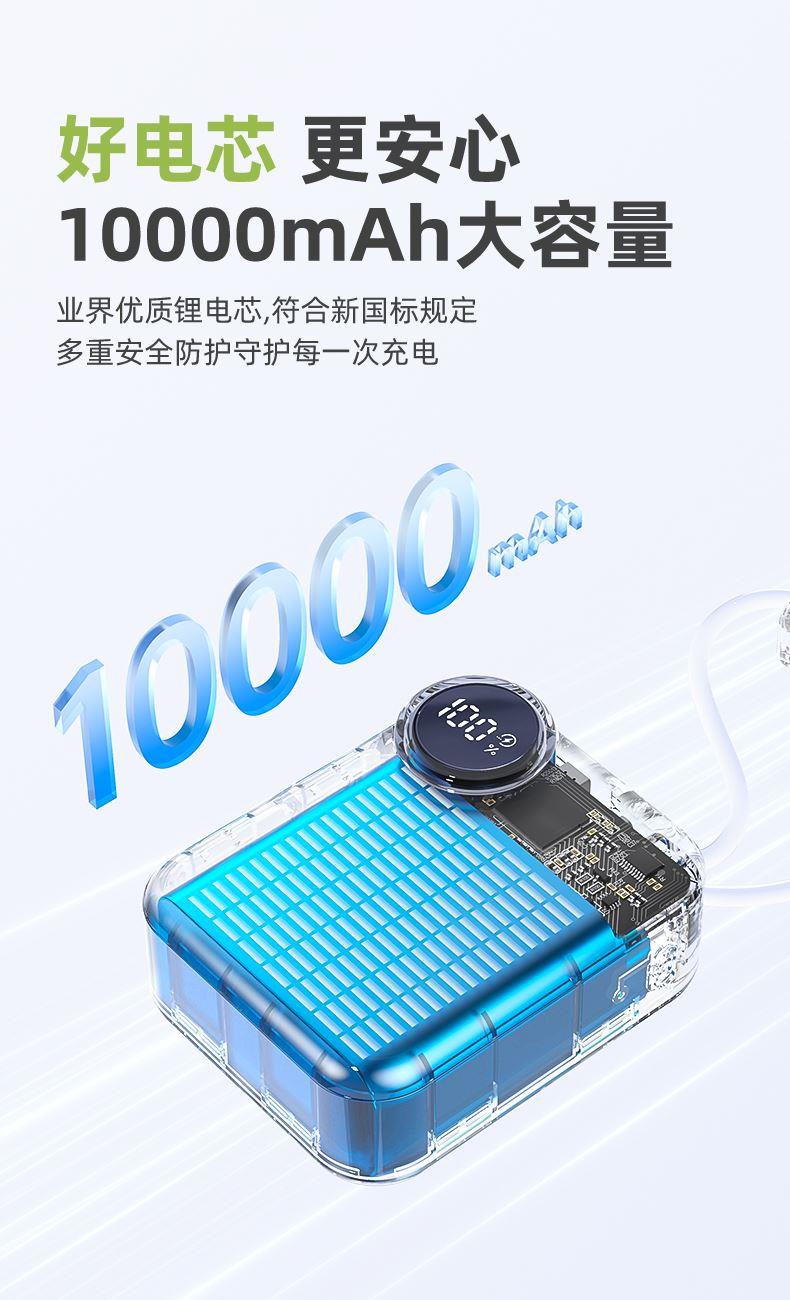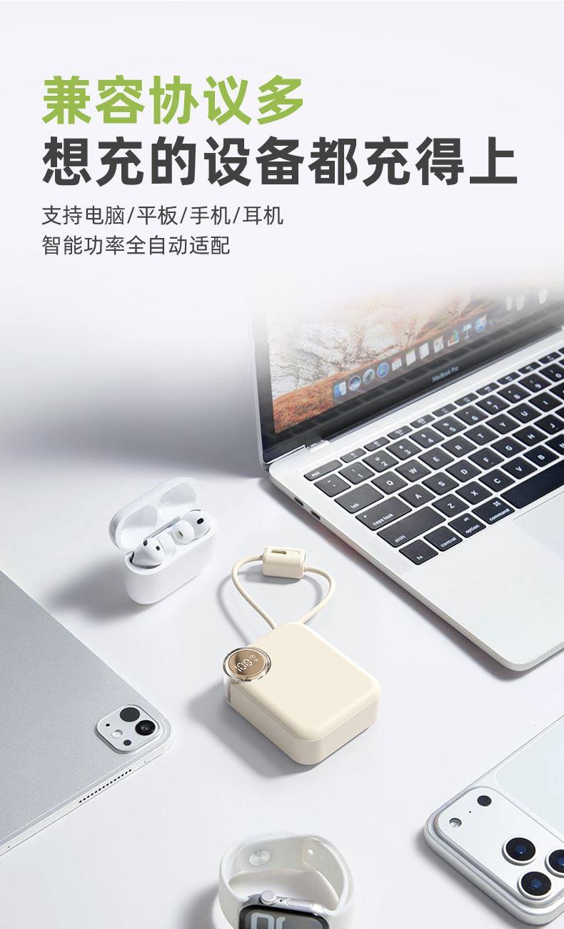 型 号: R73R 颜色 :米色 /绿色/ 蓝色/ 粉色/ 电池 :锂离子聚合物电池*1pcs 电池类型 :动力电芯 容量:10000mAh 材质 :ABS+PC 尺寸 :71*62*28MM 功能特点 马卡龙配色,时尚大气; 22.5W超级快充,迅速充电; 10000mAh锂电池,澎湃动力; 自带苹果和Type-C充电线; 一输入三输出,支持苹果15手机 智能数显查看电量