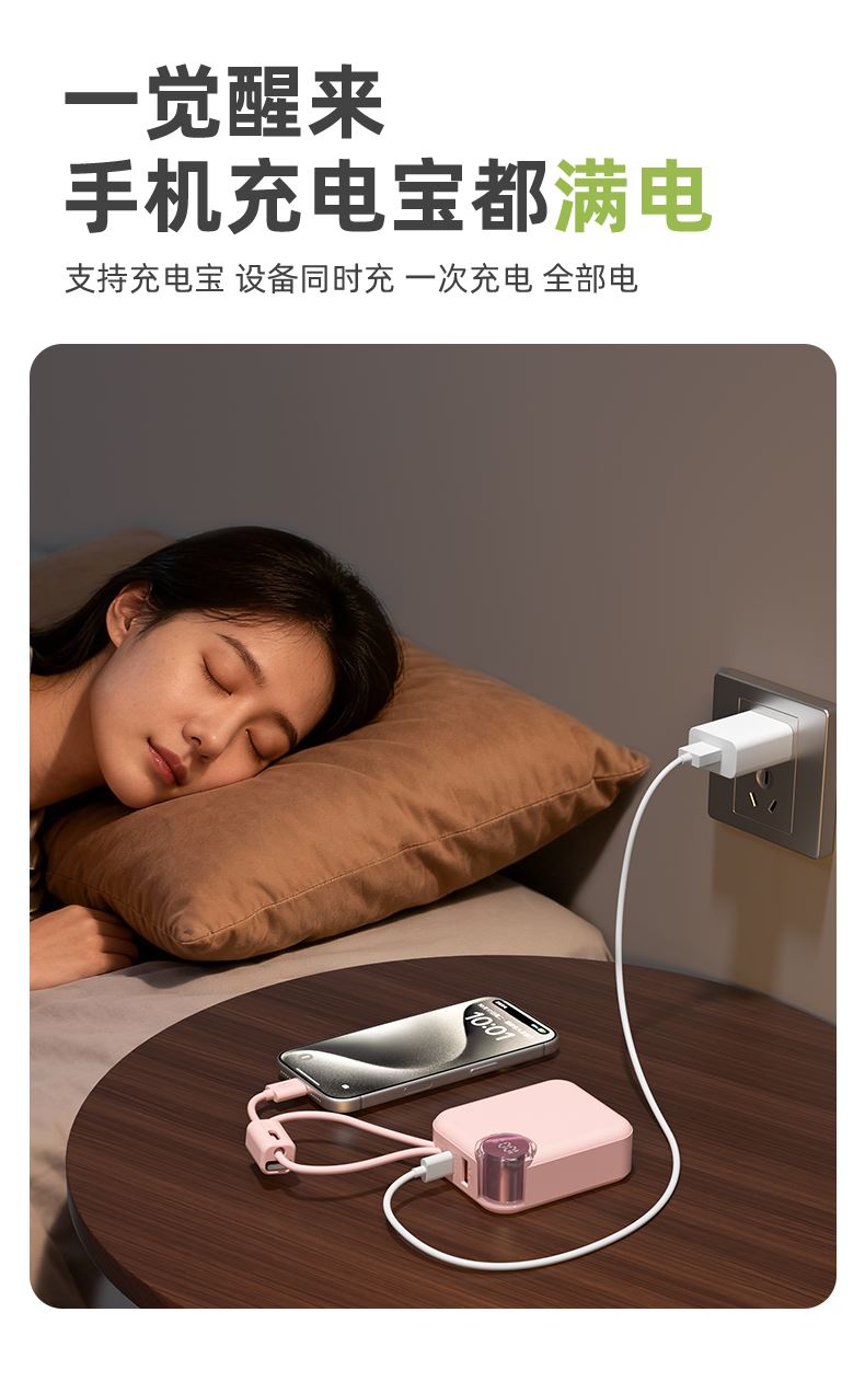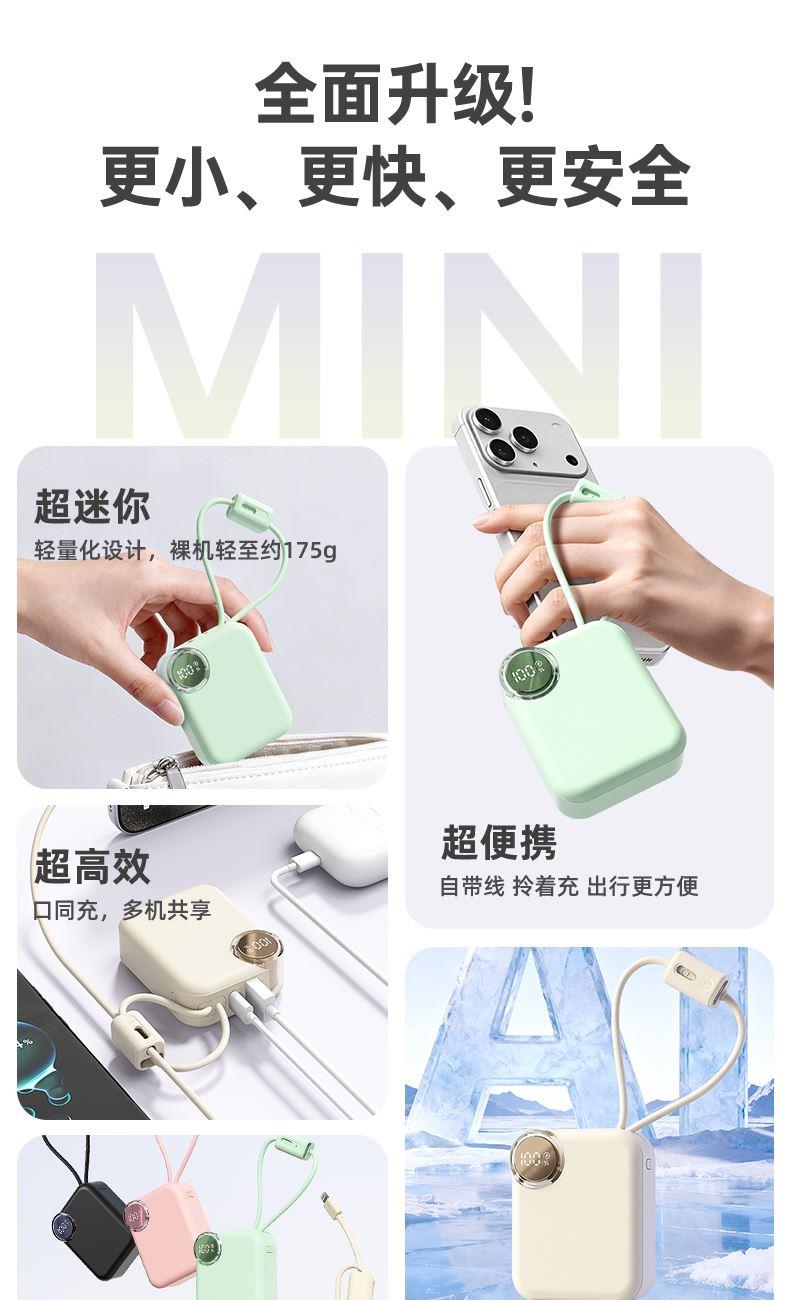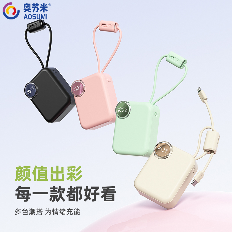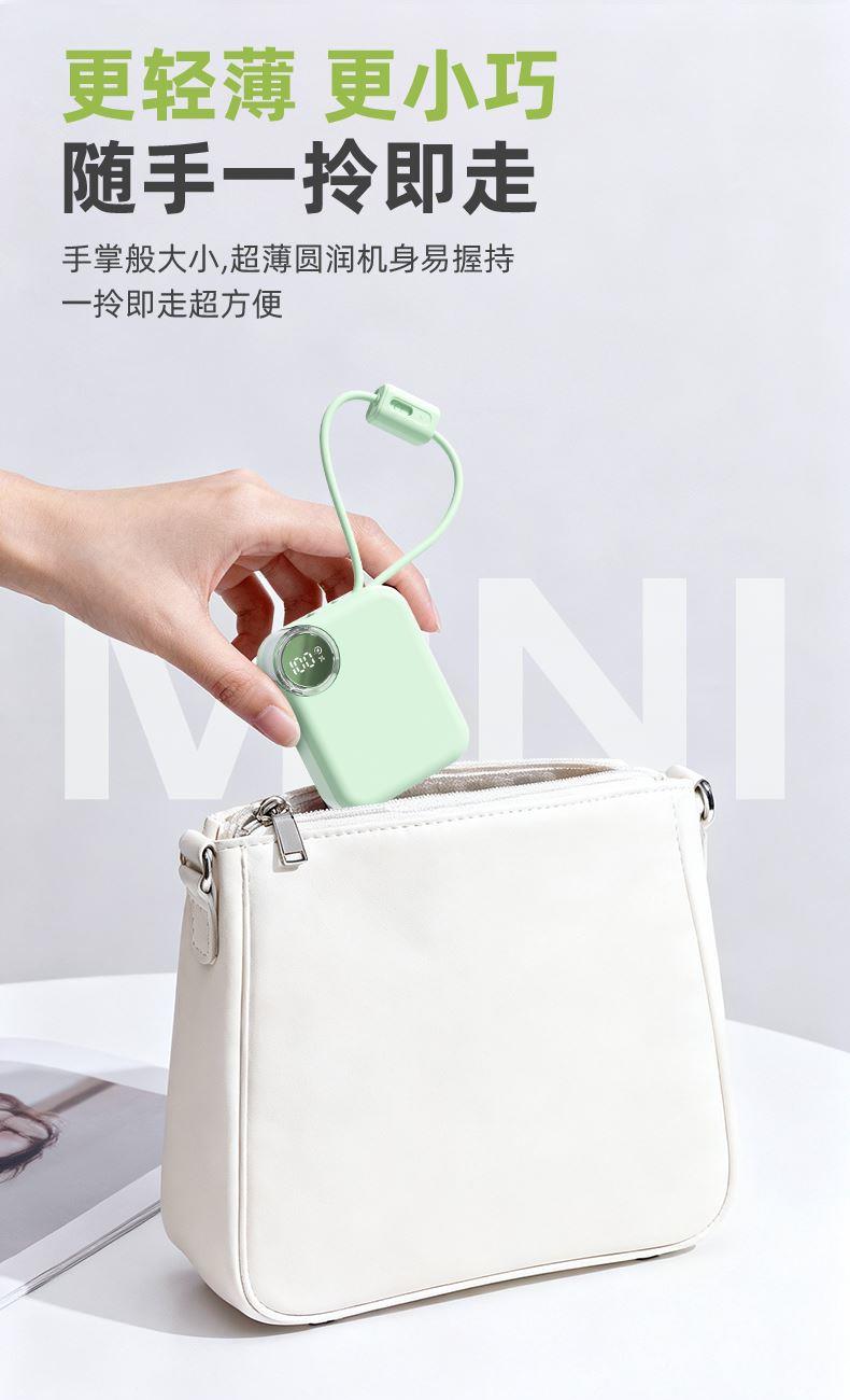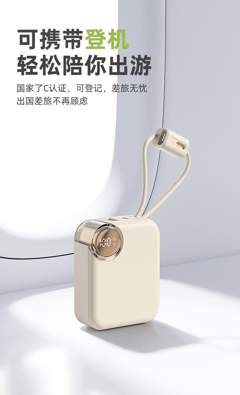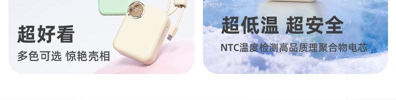型 号: R73R 颜色 :米色 /绿色/ 蓝色/ 粉色/ 电池 :锂离子聚合物电池*1pcs 电池类型 :动力电芯 容量:10000mAh 材质 :ABS+PC 尺寸 :71*62*28MM 功能特点 马卡龙配色,时尚大气; 22.5W超级快充,迅速充电; 10000mAh锂电池,澎湃动力; 自带苹果和Type-C充电线; 一输入三输出,支持苹果15手机 智能数显查看电量