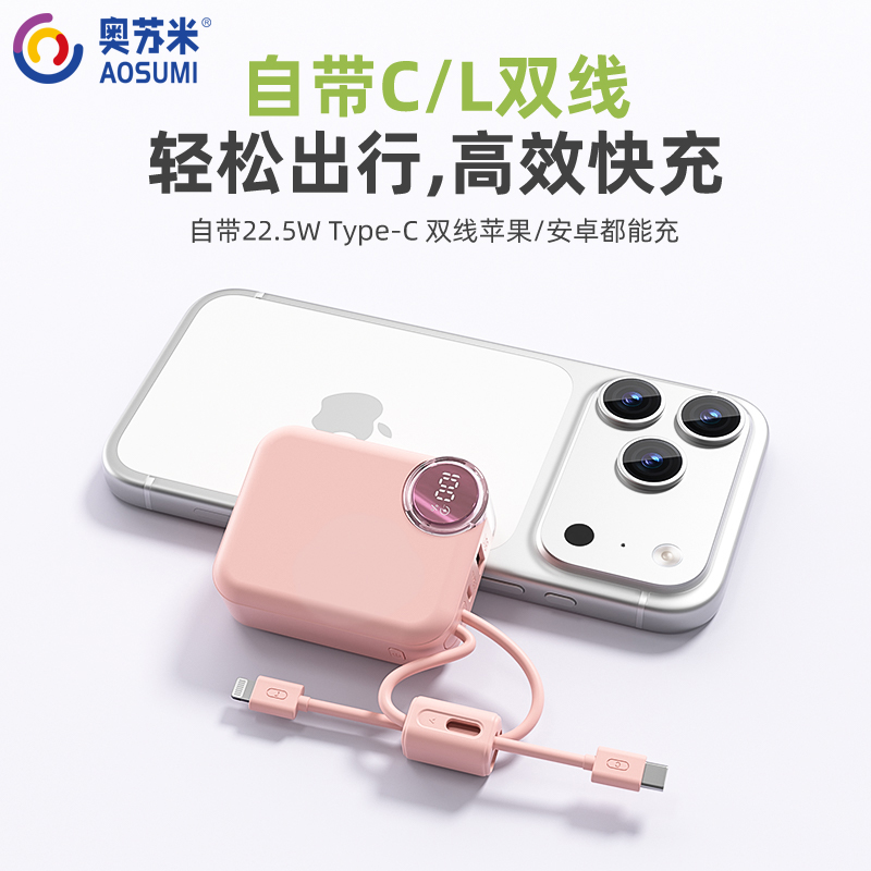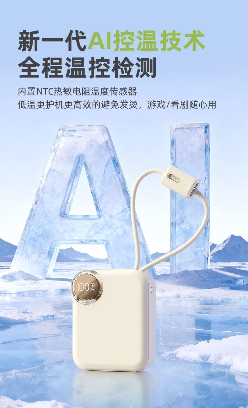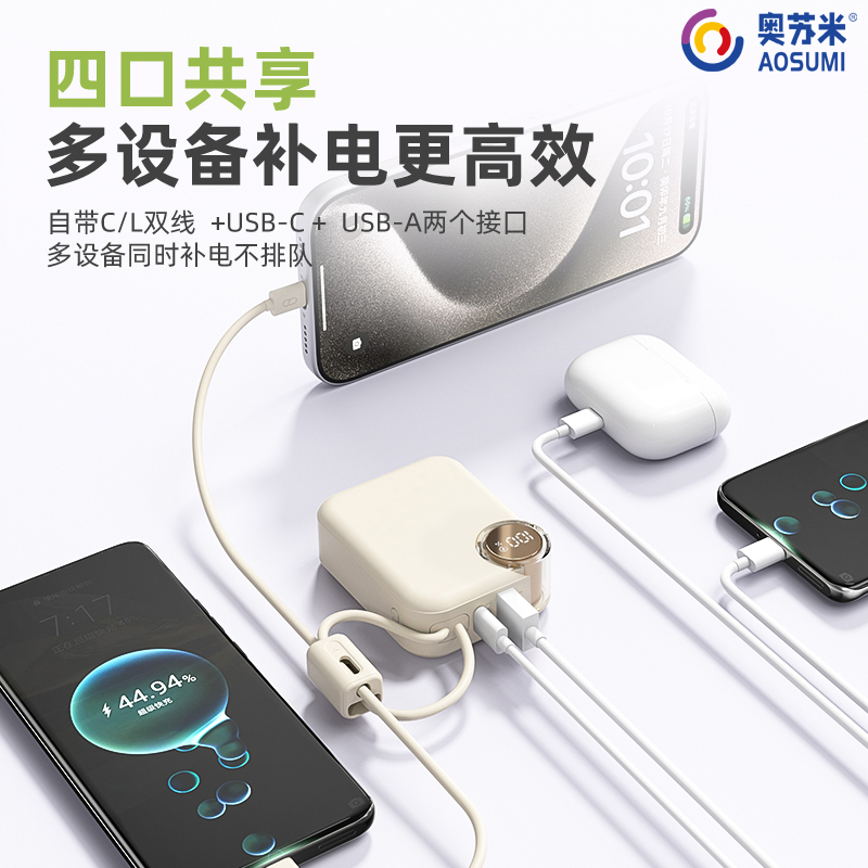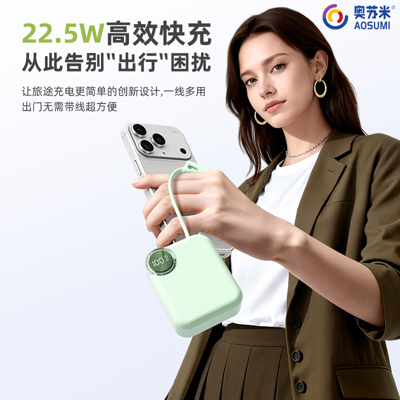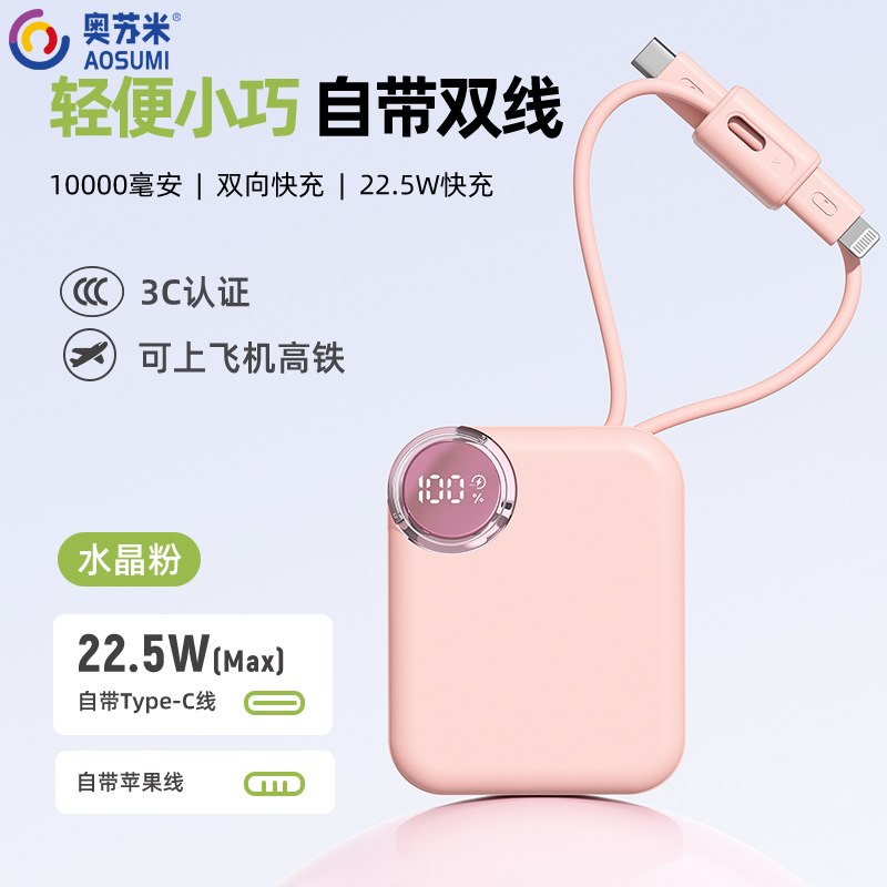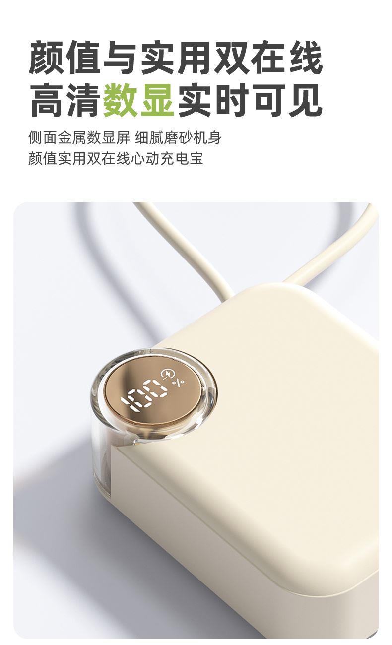型 号: R73R 颜色 :米色 /绿色/ 蓝色/ 粉色/ 电池 :锂离子聚合物电池*1pcs 电池类型 :动力电芯 容量:10000mAh 材质 :ABS+PC 尺寸 :71*62*28MM 功能特点 马卡龙配色,时尚大气; 22.5W超级快充,迅速充电; 10000mAh锂电池,澎湃动力; 自带苹果和Type-C充电线; 一输入三输出,支持苹果15手机 智能数显查看电量