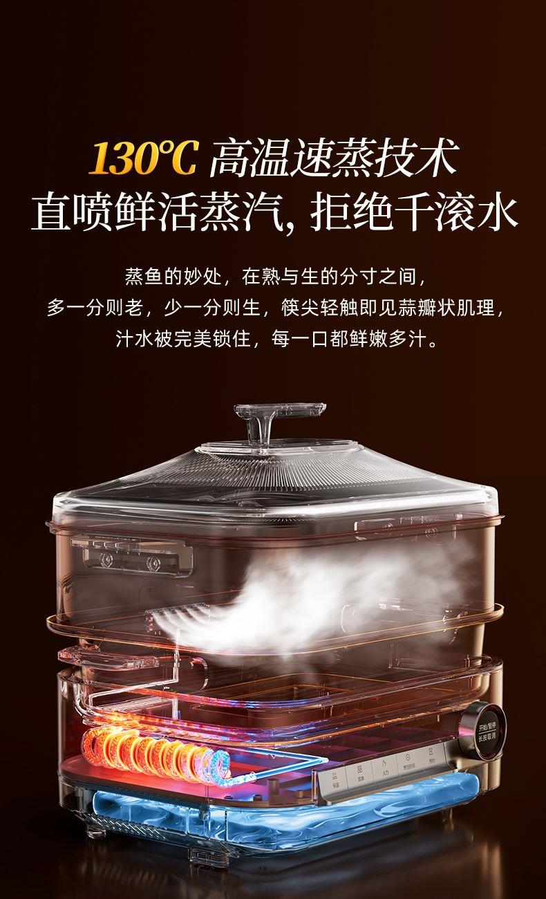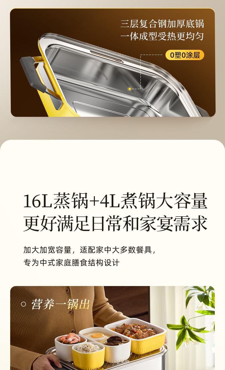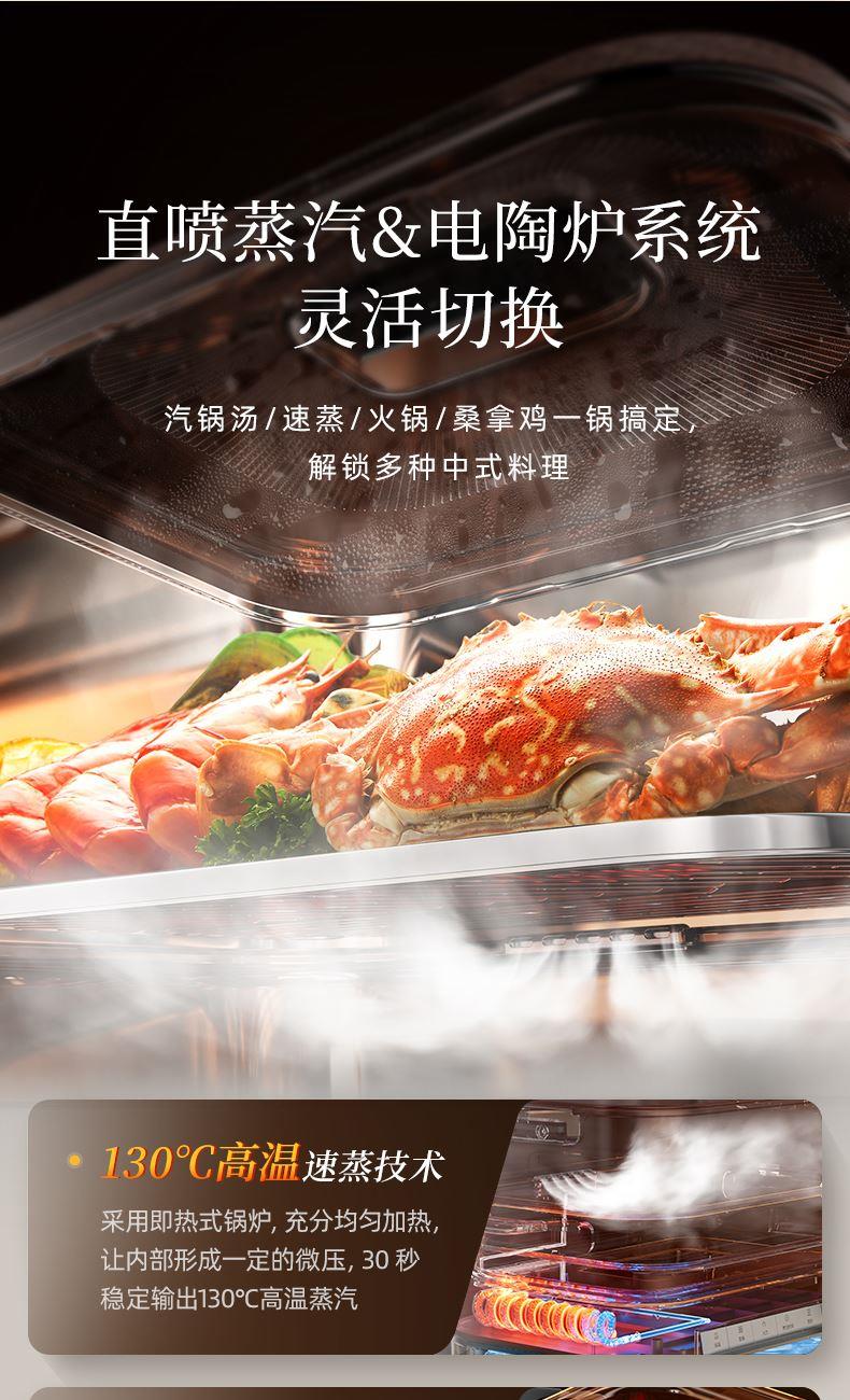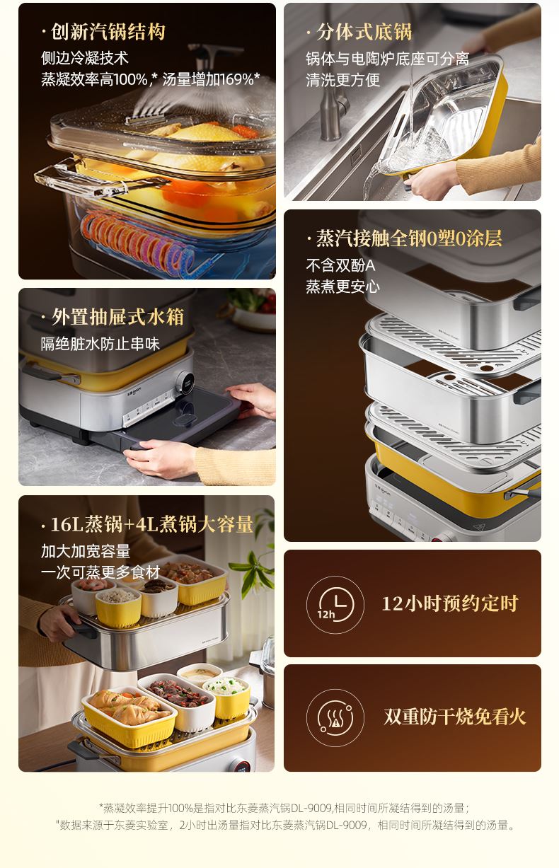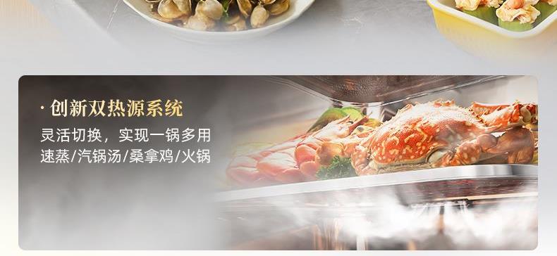 1.汽锅、速蒸、火锅、桑拿鸡一锅搞定 2.30秒130℃高温速蒸技术,够快才够鲜 3.食材不加一滴水,蒸凝出汤,味道更鲜 4.蒸汽接触全钢、0塑、0涂层、0胶水 5.创新电陶炉+蒸汽双加热系统,一机料理中式鲜滋味 6.分体式底锅,抽屉式水箱,清洗更省心,一键除垢 7.16L蒸锅+4L煮锅(汽锅),大容量满足日常家宴