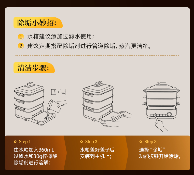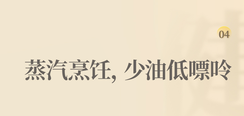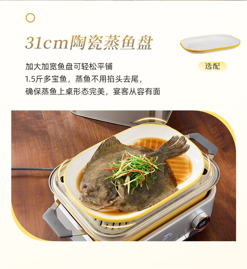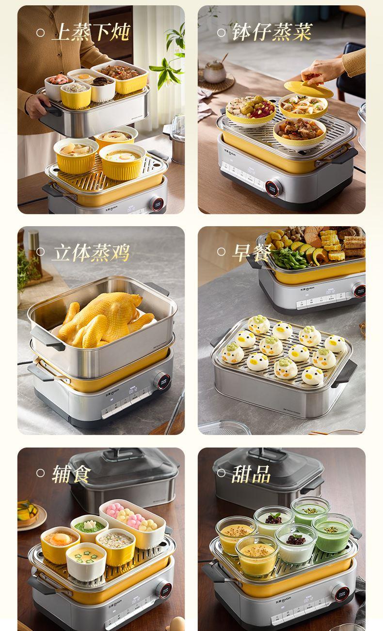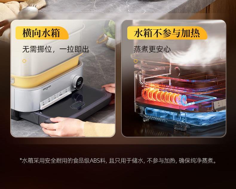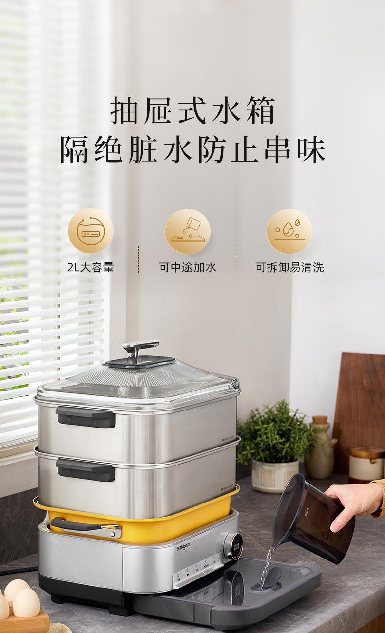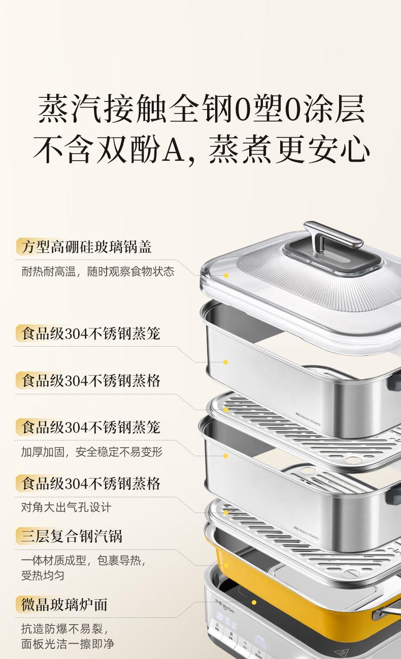 1.汽锅、速蒸、火锅、桑拿鸡一锅搞定 2.30秒130℃高温速蒸技术,够快才够鲜 3.食材不加一滴水,蒸凝出汤,味道更鲜 4.蒸汽接触全钢、0塑、0涂层、0胶水 5.创新电陶炉+蒸汽双加热系统,一机料理中式鲜滋味 6.分体式底锅,抽屉式水箱,清洗更省心,一键除垢 7.16L蒸锅+4L煮锅(汽锅),大容量满足日常家宴