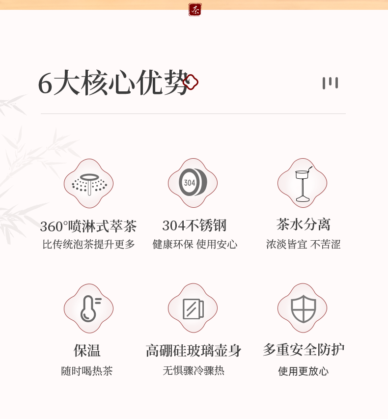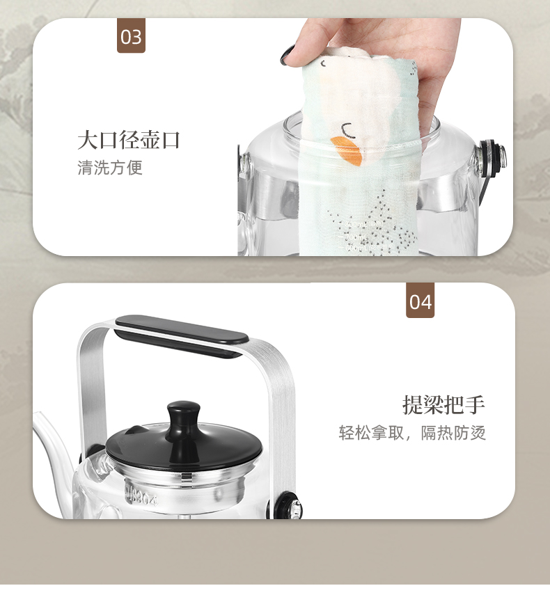 1、全新升级分体式过滤网--声音更小,更易清洗,煮茶口感好