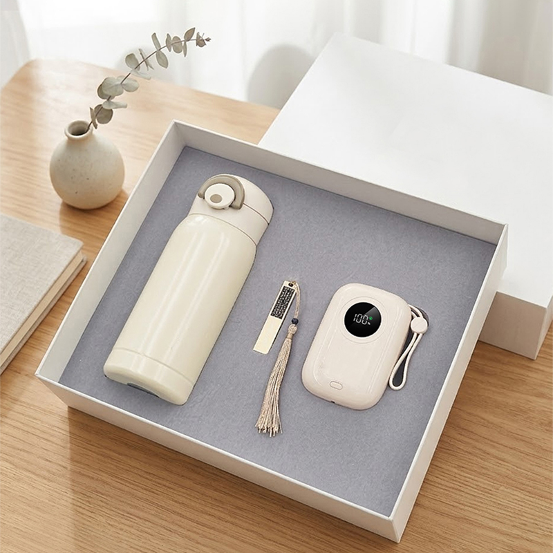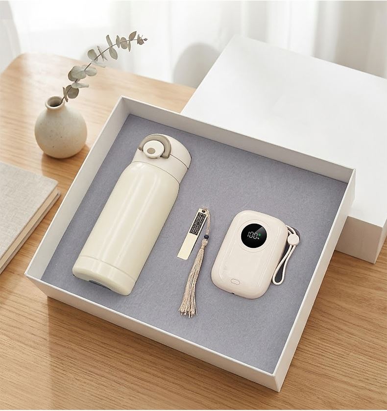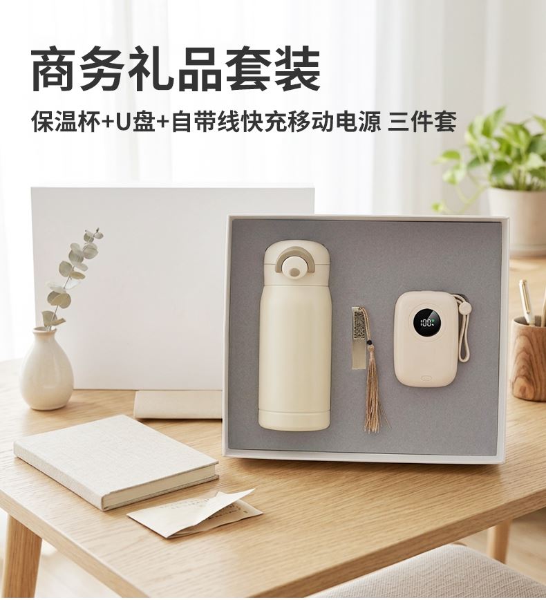 礼盒配置: 1、22.5W超级快充10000mAh自带线移动电源 2、金属镂空16GU盘 3、口袋保温杯(350毫升) 4、米色包装盒尺寸:275x227x75mm 5、米色手提袋尺寸:286x260x85mm 6、颜色:米白色 7、重量:25kg/箱