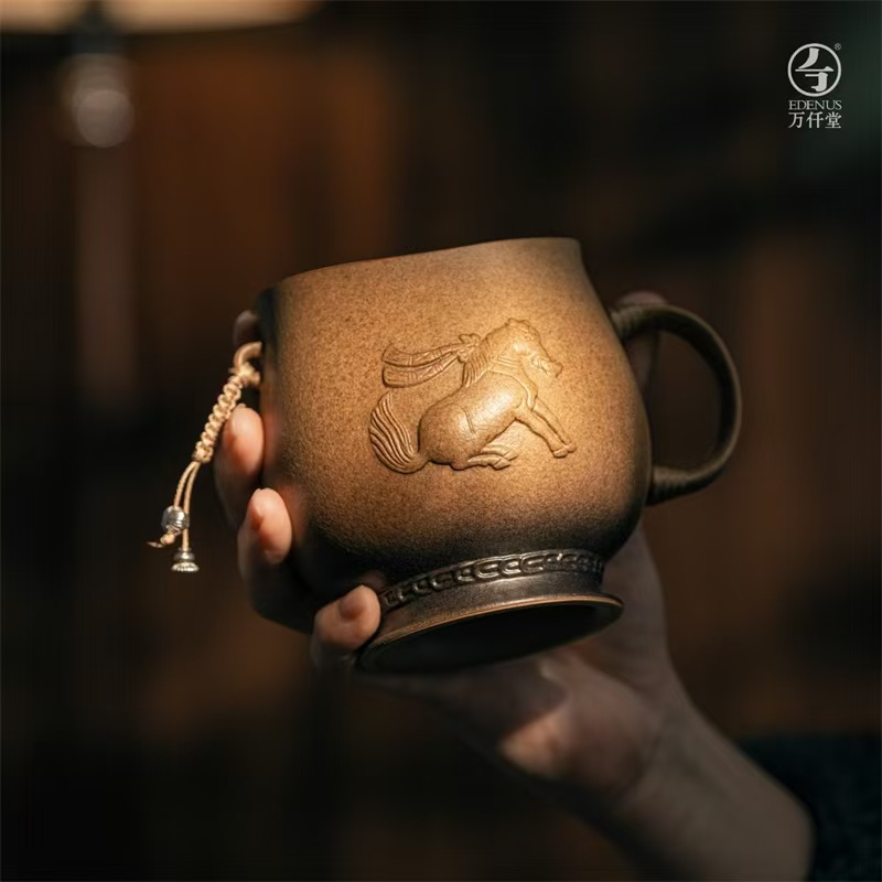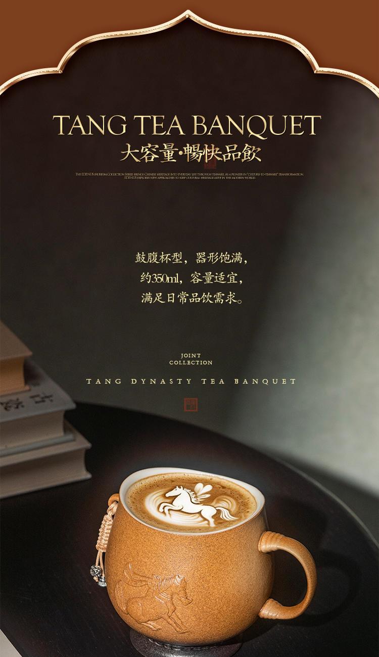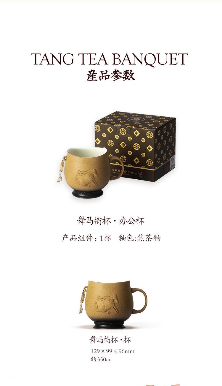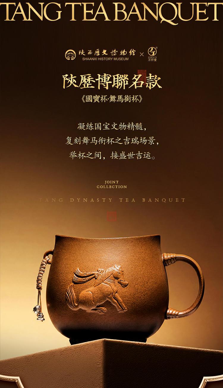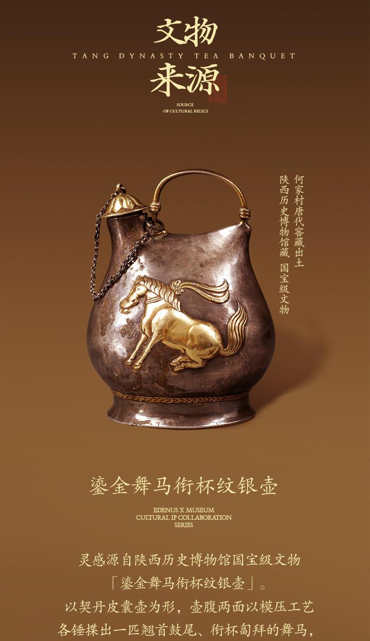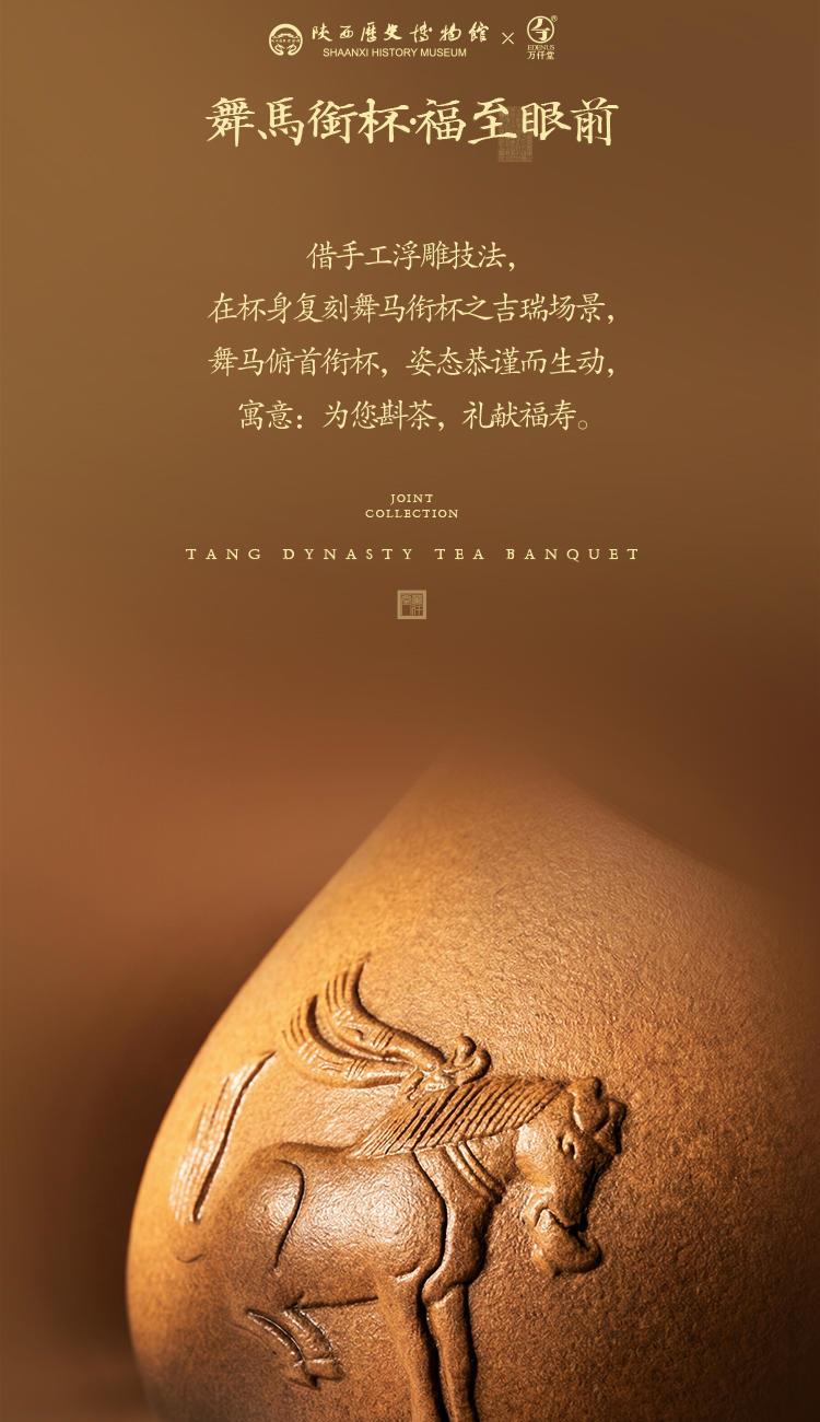 灵感源自陕西历史博物馆国宝级文物《鎏金舞马衔杯纹银壶》。借手工浮周隹技法,在杯身复刻舞马衔杯之吉瑞场景,舞马俯首衔杯,姿态恭谨而生动,舞马衔杯·福至眼前。