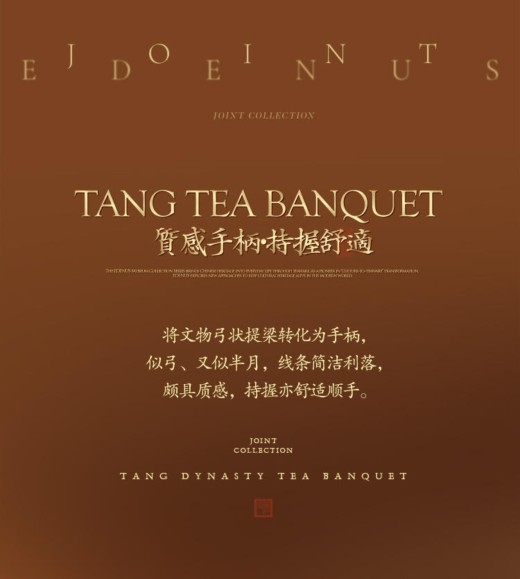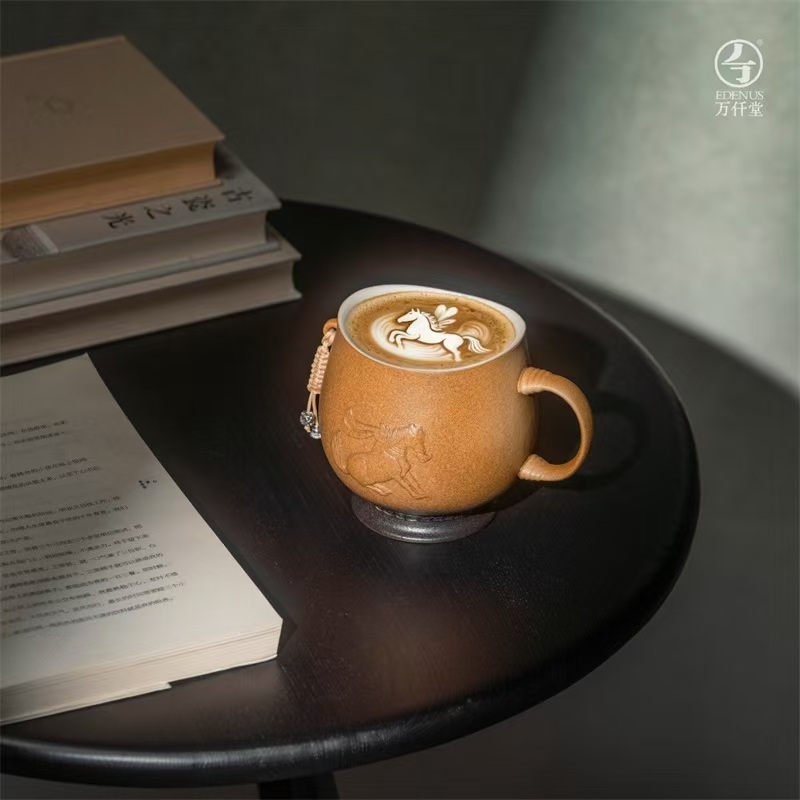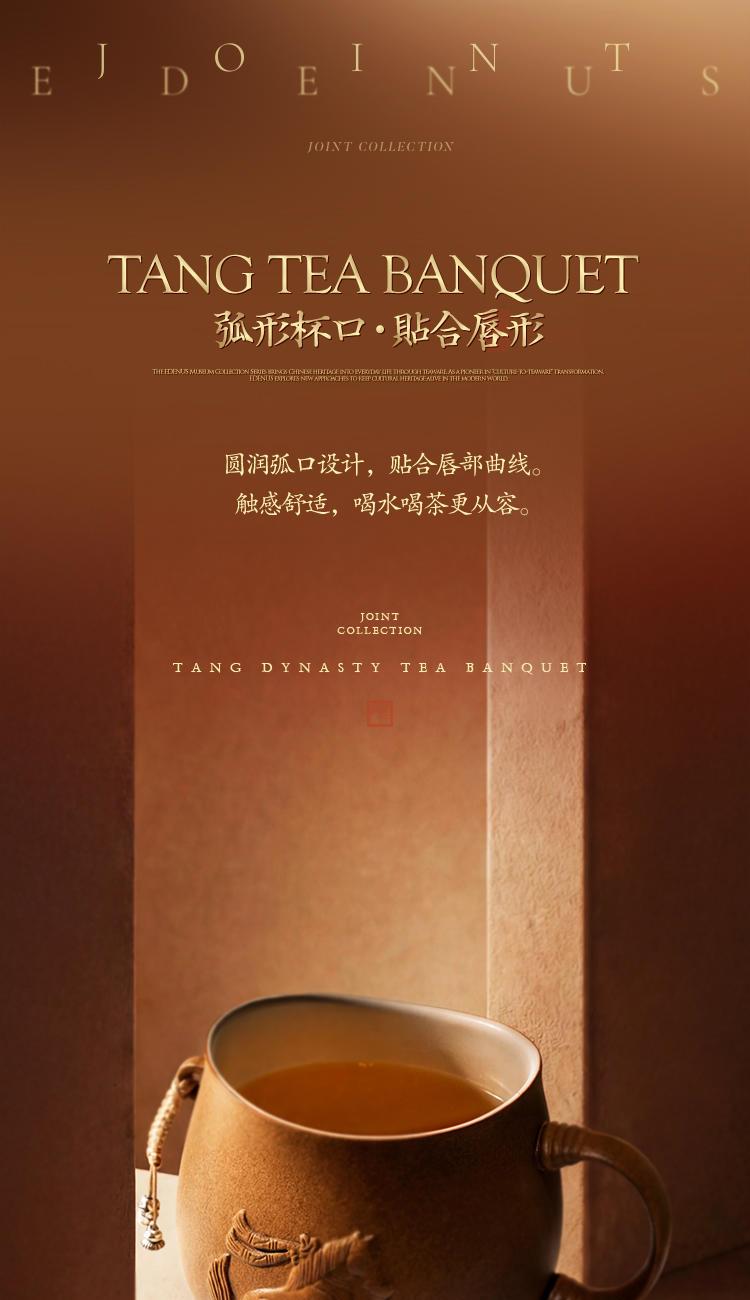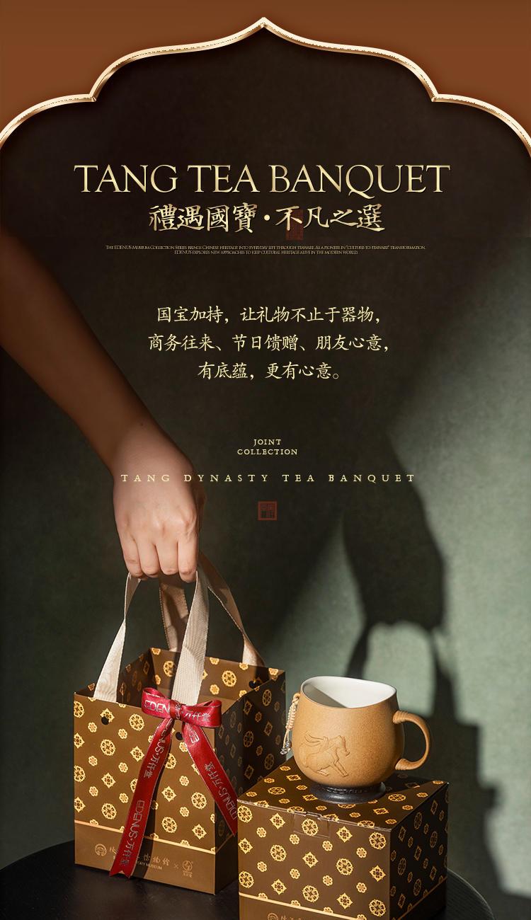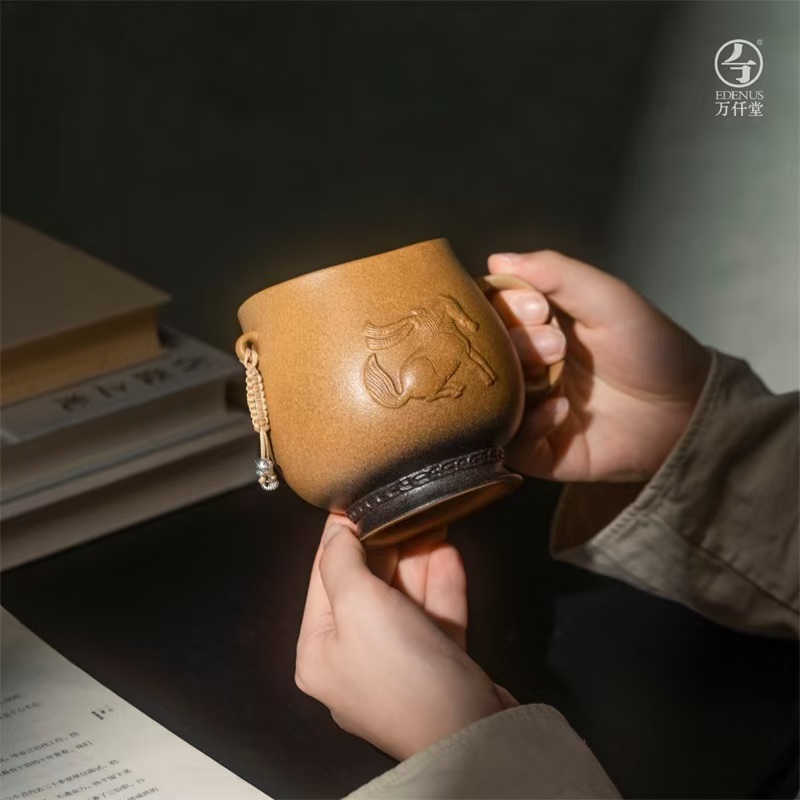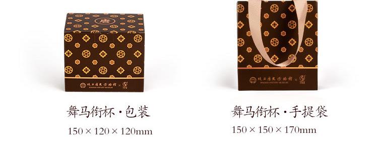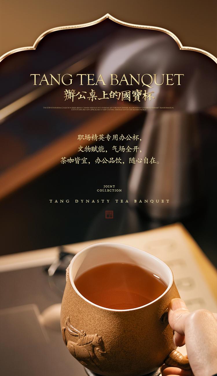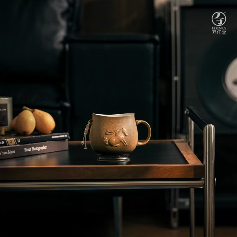 灵感源自陕西历史博物馆国宝级文物《鎏金舞马衔杯纹银壶》。借手工浮周隹技法,在杯身复刻舞马衔杯之吉瑞场景,舞马俯首衔杯,姿态恭谨而生动,舞马衔杯·福至眼前。