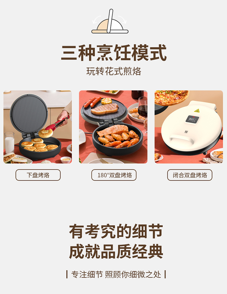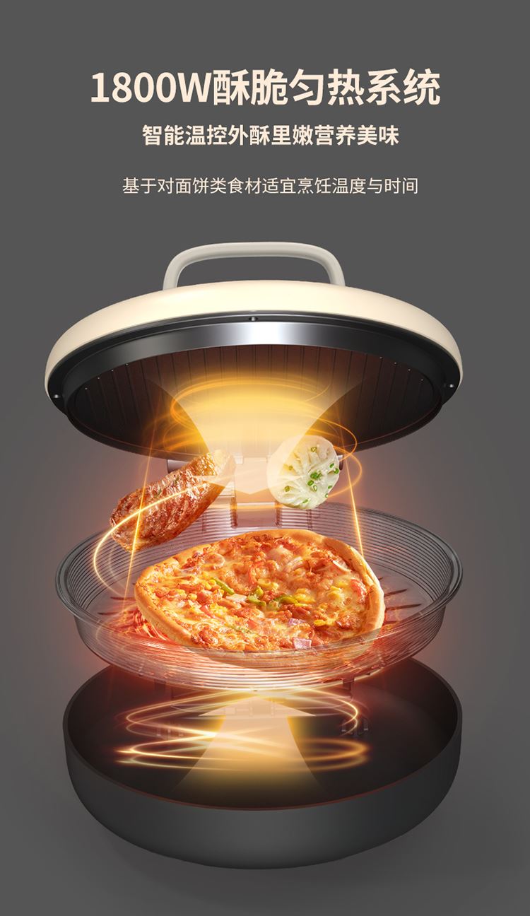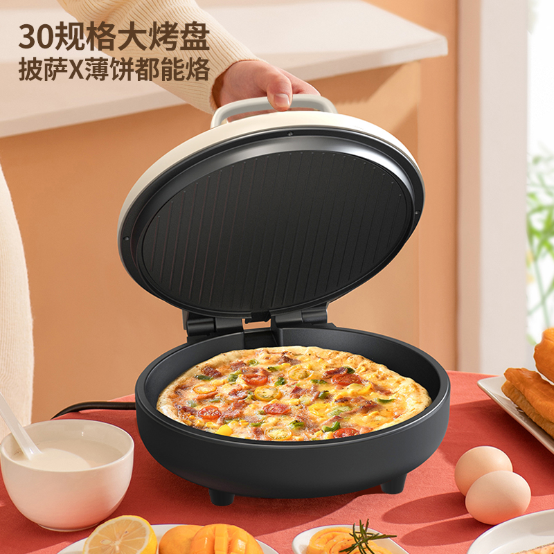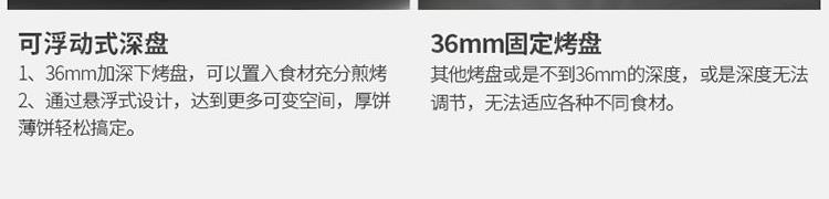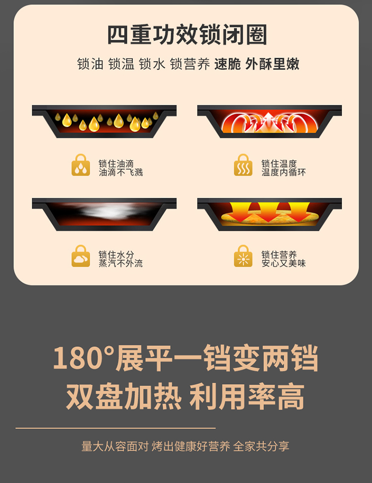 36mm加深烤盘食物薄厚随心烙 30规格大烤盘披萨,薄饼都能烙 上下盘独立控温,180度展平设计 1800W酥脆匀热系统,速热不用等 个性化防烫把手,波浪纹上盘滤出多余油脂