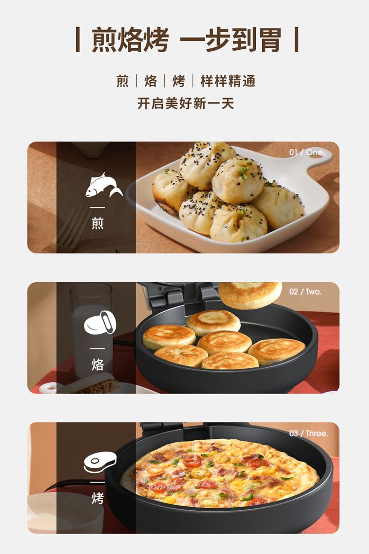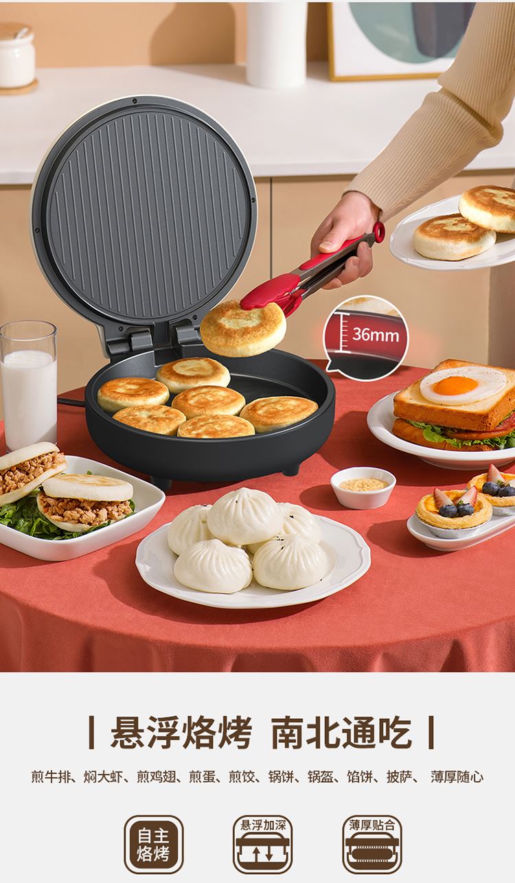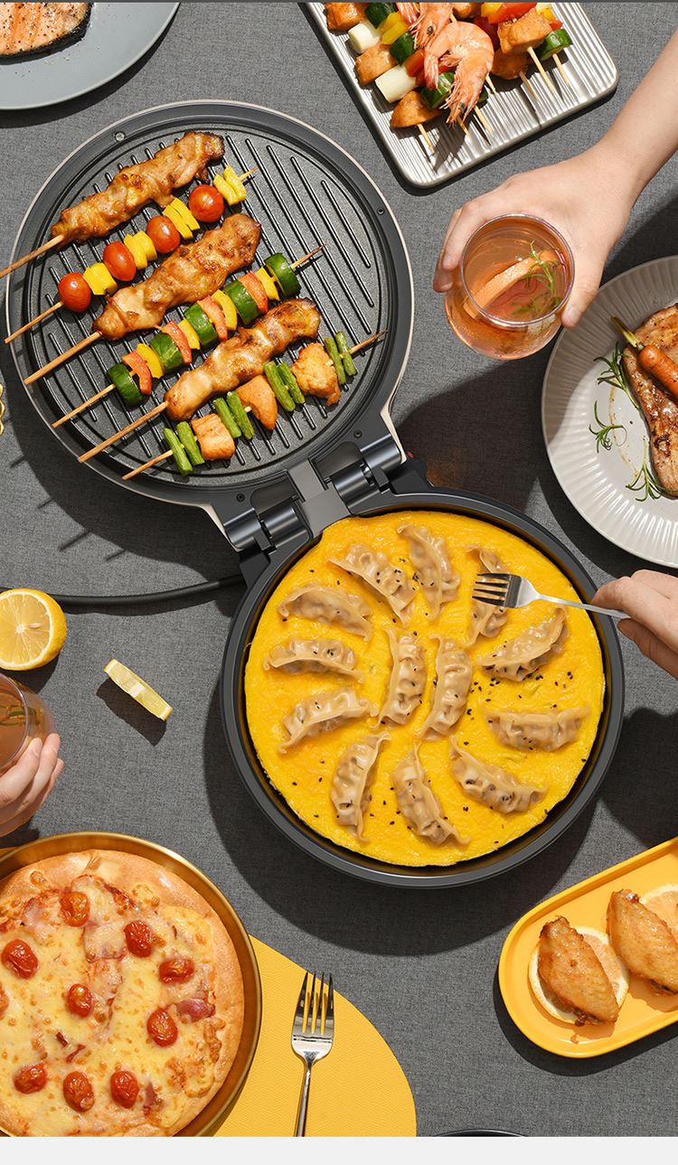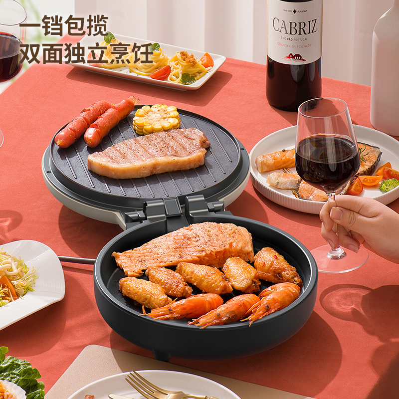 36mm加深烤盘食物薄厚随心烙 30规格大烤盘披萨,薄饼都能烙 上下盘独立控温,180度展平设计 1800W酥脆匀热系统,速热不用等 个性化防烫把手,波浪纹上盘滤出多余油脂