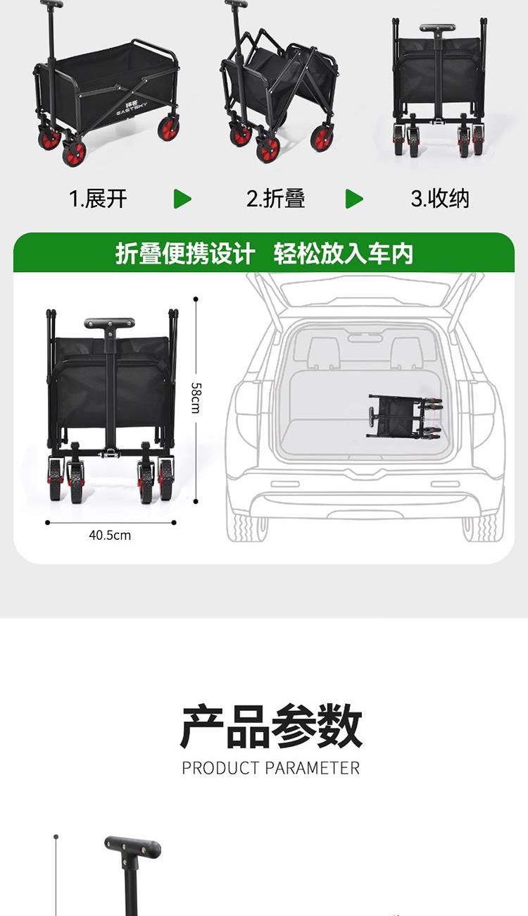 型号:EKH-9521 颜色:框架-黑色 布袋-黑色 材质:牛津布/碳钢 重量:约3.2kg 产品尺寸:59.5*40*54cm-82cm 拉杆可调节高度:54-82cm 容量:约40L