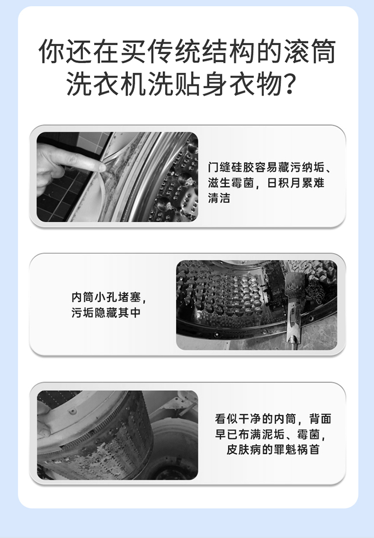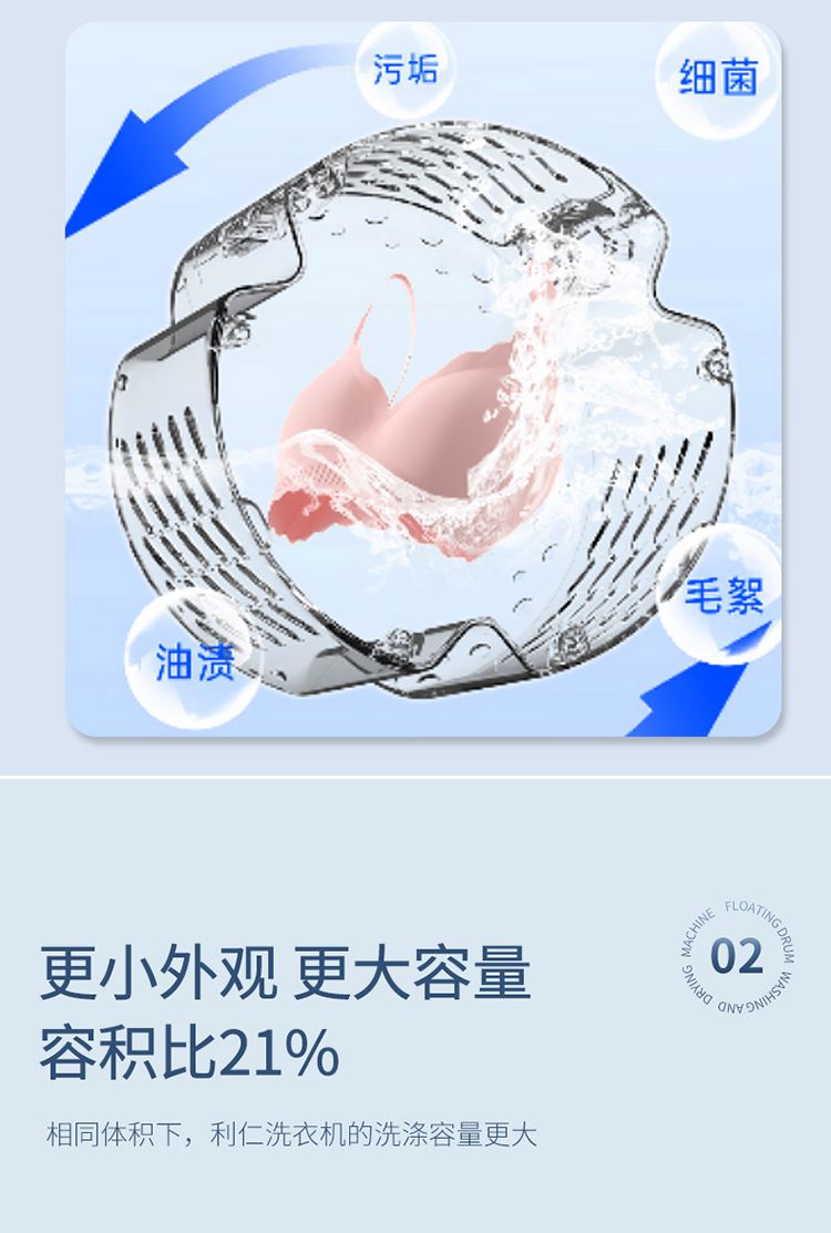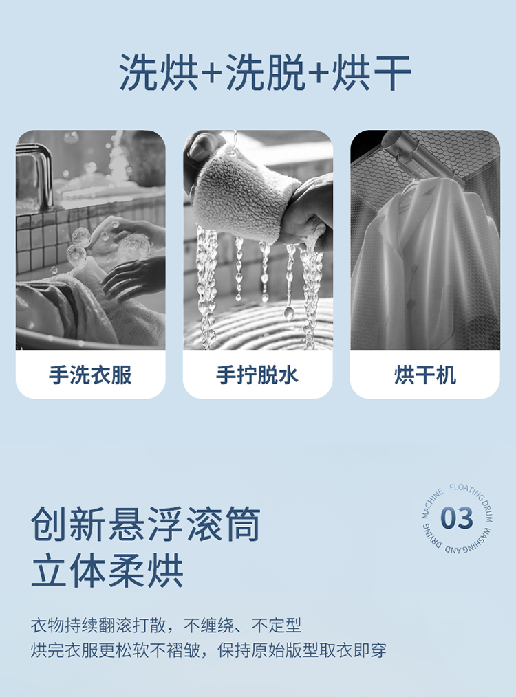 开放内仓0硅胶,拒绝藏污纳垢 悬浮滚筒洗衣更干净 65C巴氏烘干,黄金温度柔烘 上进水、下排水,活水洗涤更干净 拥有超大开孔轻松过滤毛絮,内壁不存毛