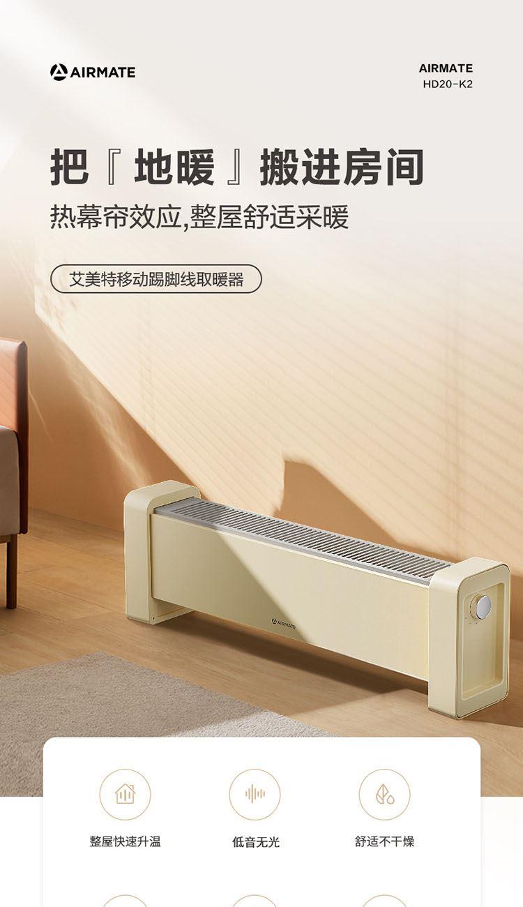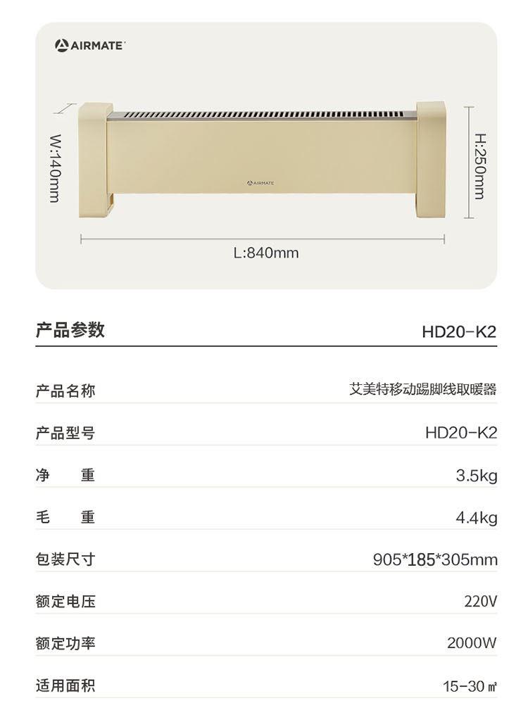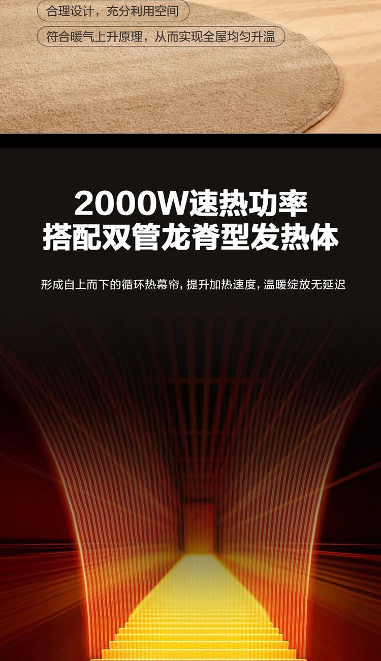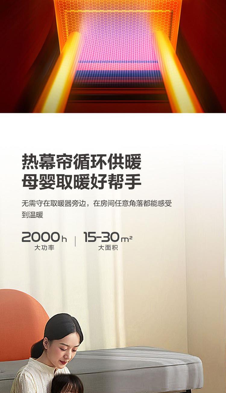 额定功率:2000W 额定电压:220V 额定频率:50Hz 档位:2档 净重毛重:3.8/4.8KG 控制方式:机械 装 箱 数:1台/箱 1、2000W速热功率搭配双管龙脊型发热体 2、循环供暖,快速大面积提升室内温度 3、热募帘循环供暖 15-30m²大面积 4、温柔治 愈暖冬配色 高定美感简约大方 5、静音不打扰 6、IP24母婴级防护冬日沐浴不怕冻