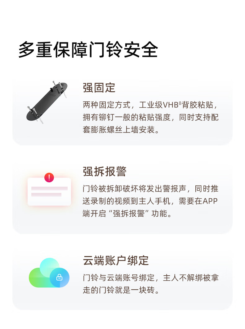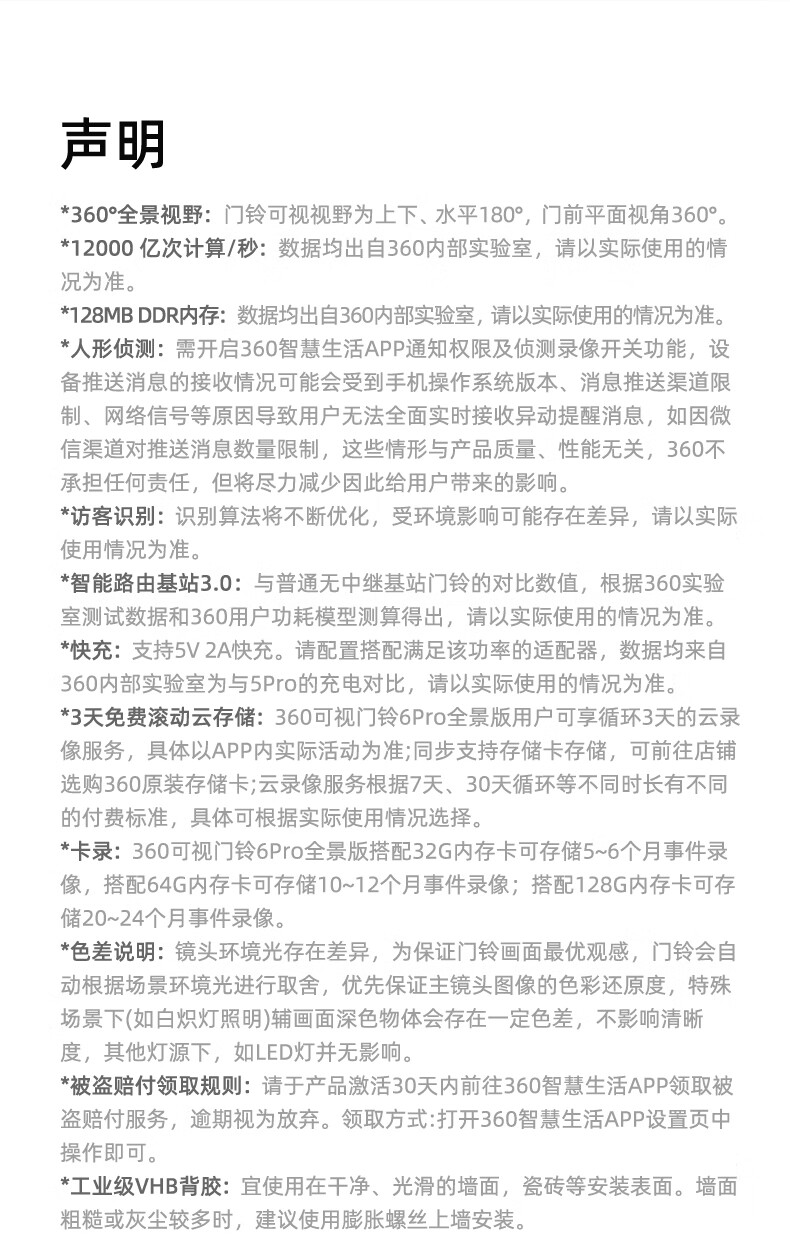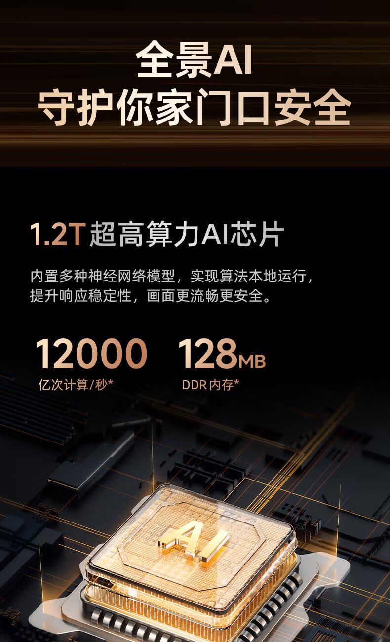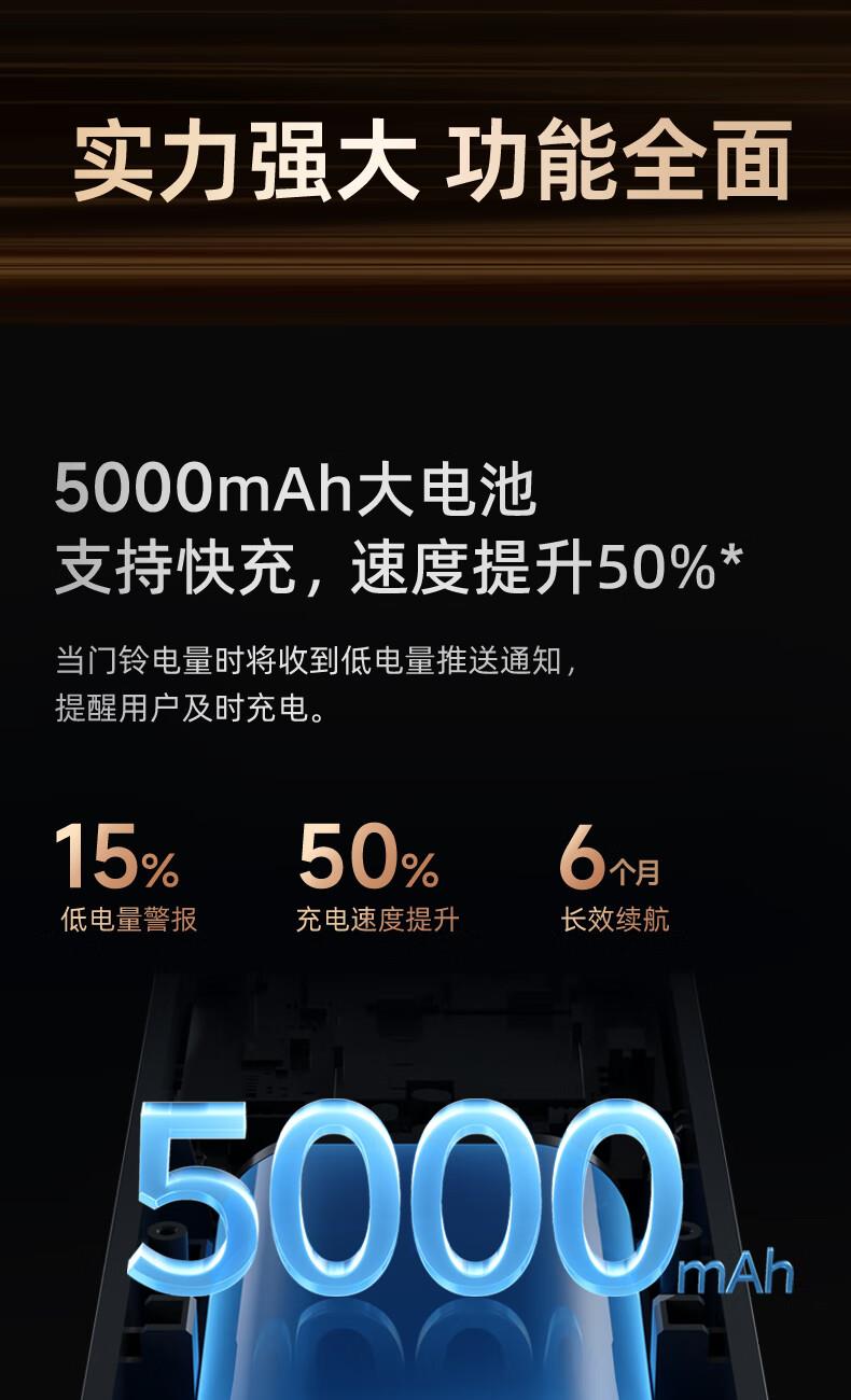产品参数: 1、500万超清像素看的更清晰,对角360°看的更全面,5000mAh超大续航,5米红外夜视 2、重量:650g、产品尺寸:189*152*55.7mm、 产品功能: 1、高清红外夜视,手机APP链接,查看门前状态 2、远程视频通话,看清门外人,问清什么事 3、PIR+AI人形检测,不在家也能知晓门前情况 4、360°全景看护 5、蓝牙+wife配网,便捷方便 5、免费3天云存储,每日安防报告,异动警报推送