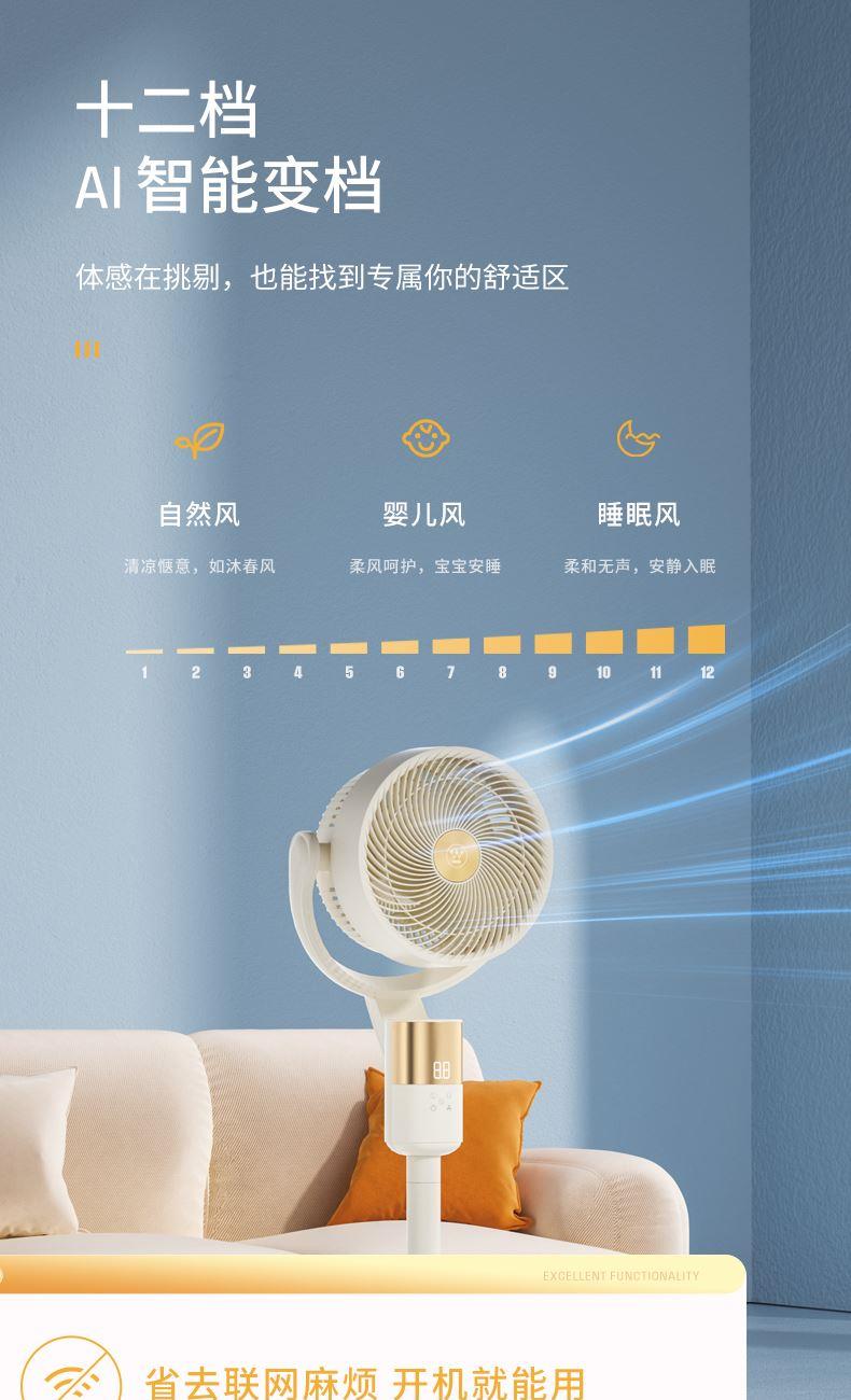 2、12档风速调节,12小时预约定时,AI智能变频;