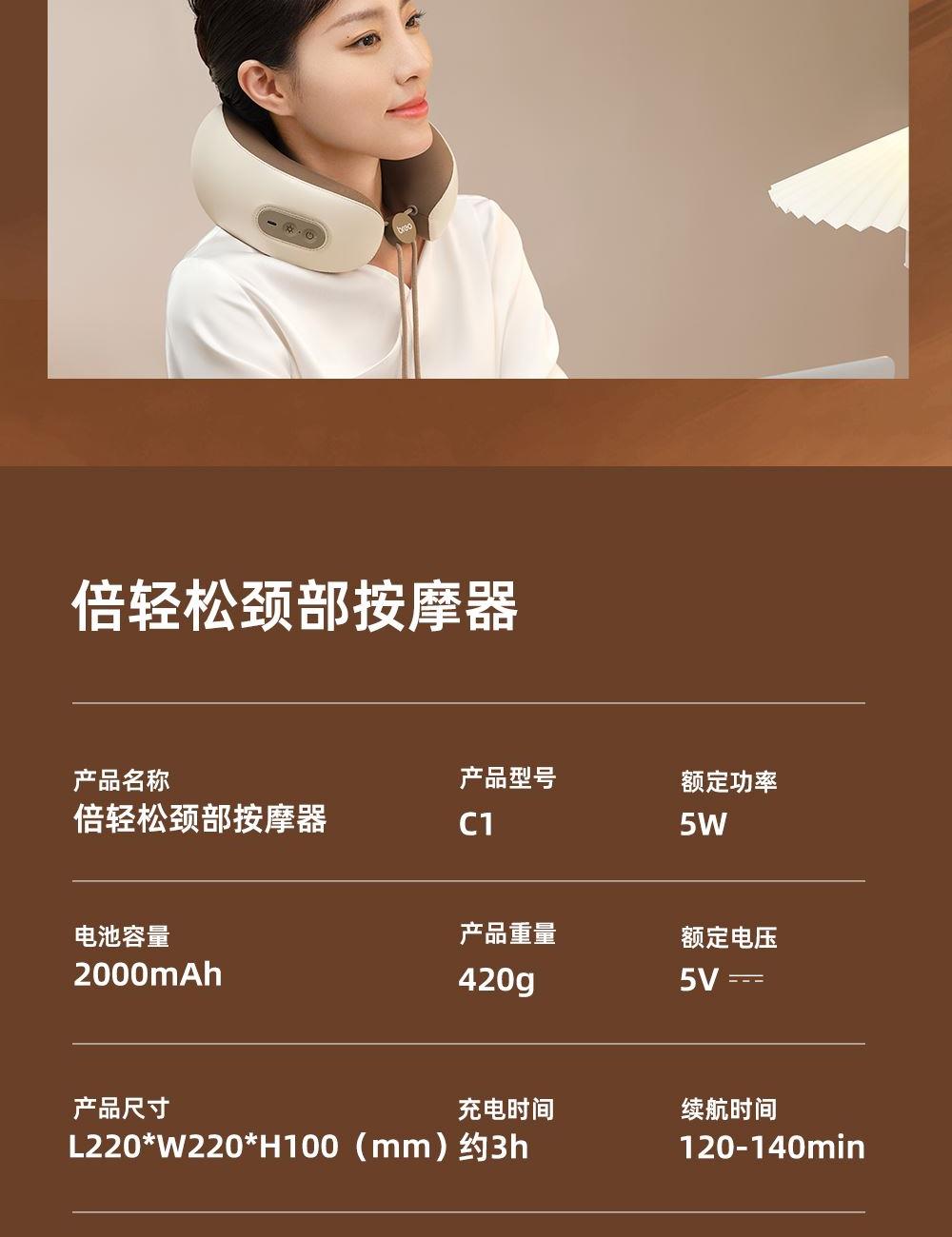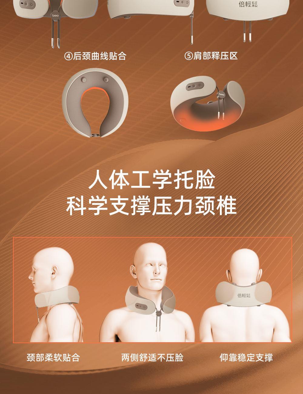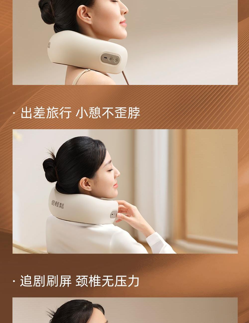 微震轻巧点按,畅享舒适按摩 360°环颈承托,多维稳固承托 42-48°C两档环颈热敷,U型超宽热敷面积,舒缓疲劳 外置帽衫式锁扣,轻轻一拉轻松调节松紧度 一体式高弹记忆海绵,高回弹内核,柔软舒适,温柔亲肤 40dB低噪体验,静享舒适小憩时光