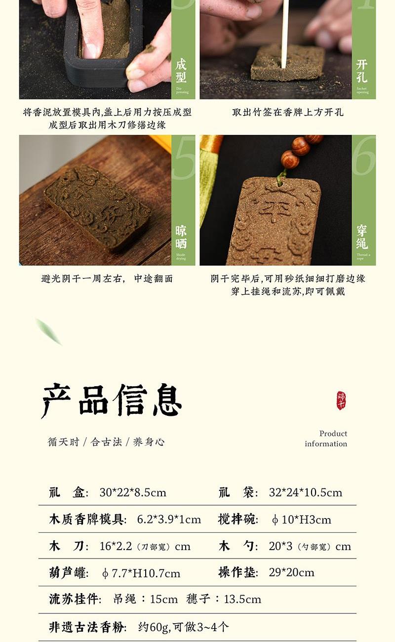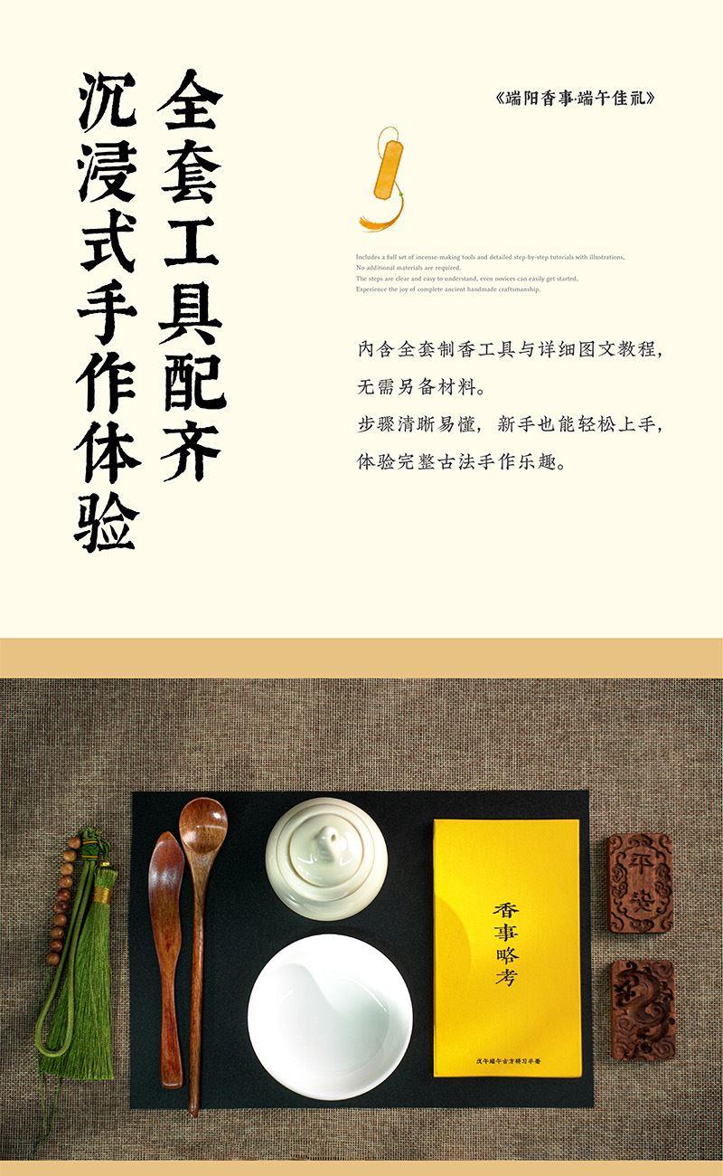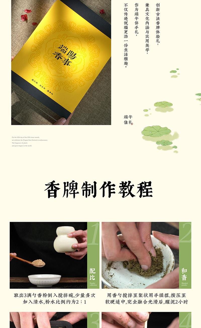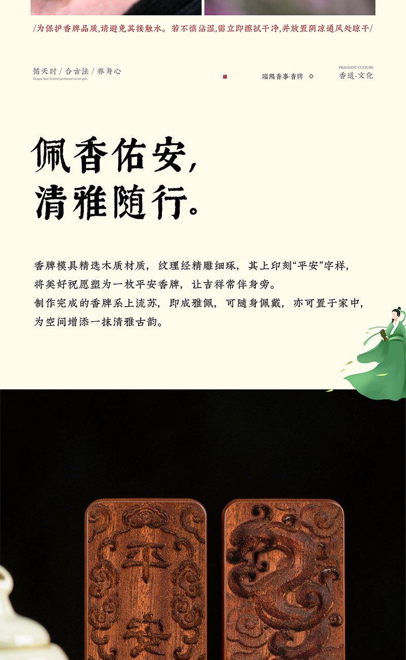 五月初五,仲夏端阳,草木清香萦绕人间。自古端午便有佩香悬艾的习俗,人们以香驱暑避秽,也将平安顺遂的祈愿寄托于一缕幽香之中。「端阳香事」融合古法合香技艺,以手作香牌体验为核心,用方寸之礼重现传统香事雅趣。我们依天时而制,循古法而作,让传统香事以更生动、更具参与感的方式融入日常生活。无需复杂门槛,只需跟随步骤,即可亲手完成一枚平安香牌,感受手作之趣与古韵之雅。