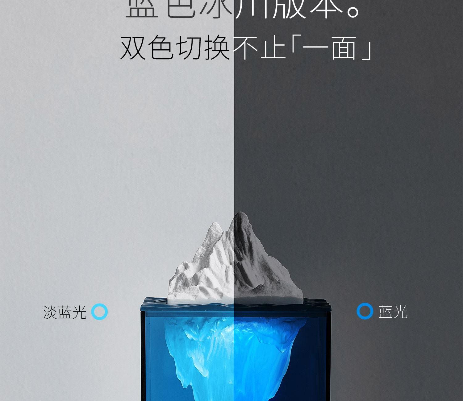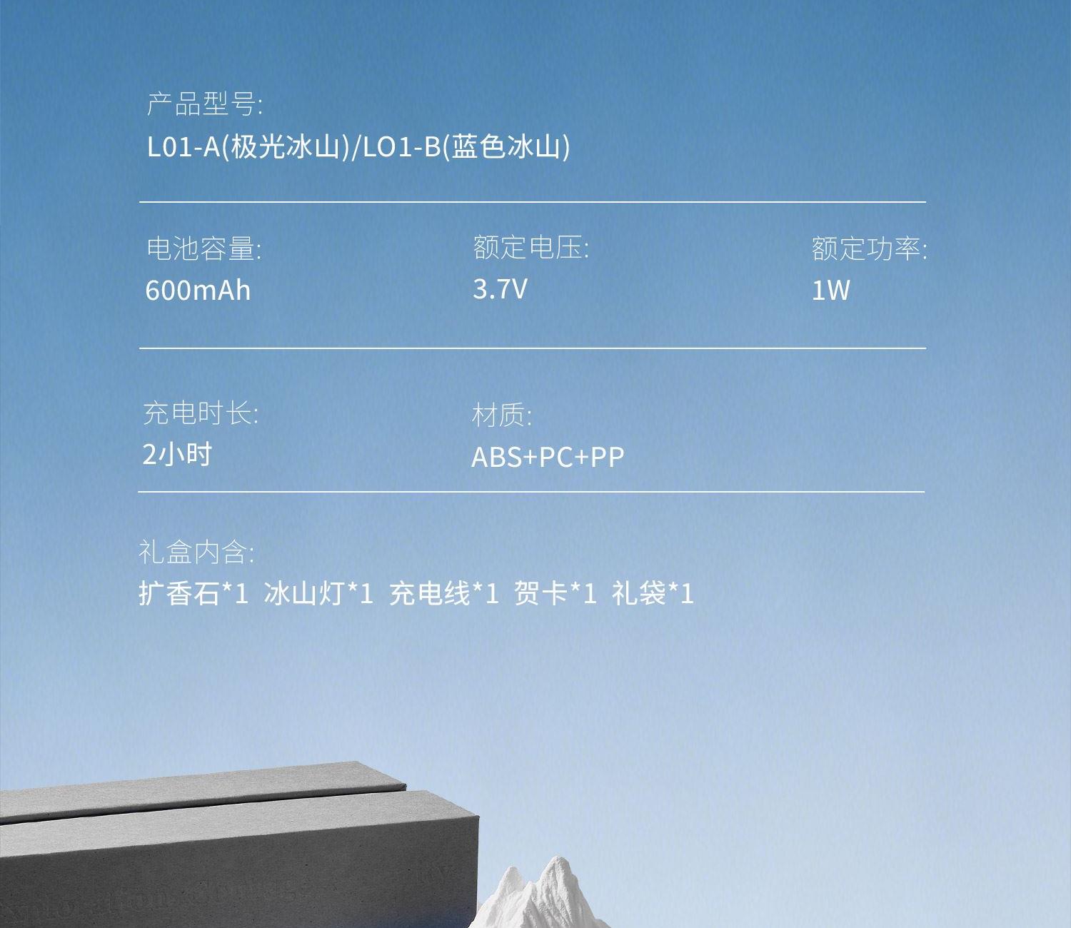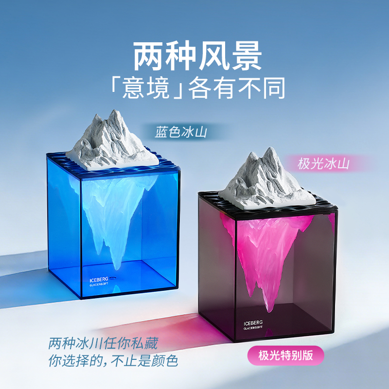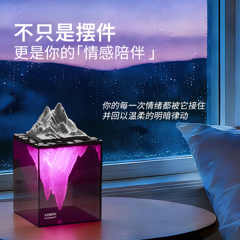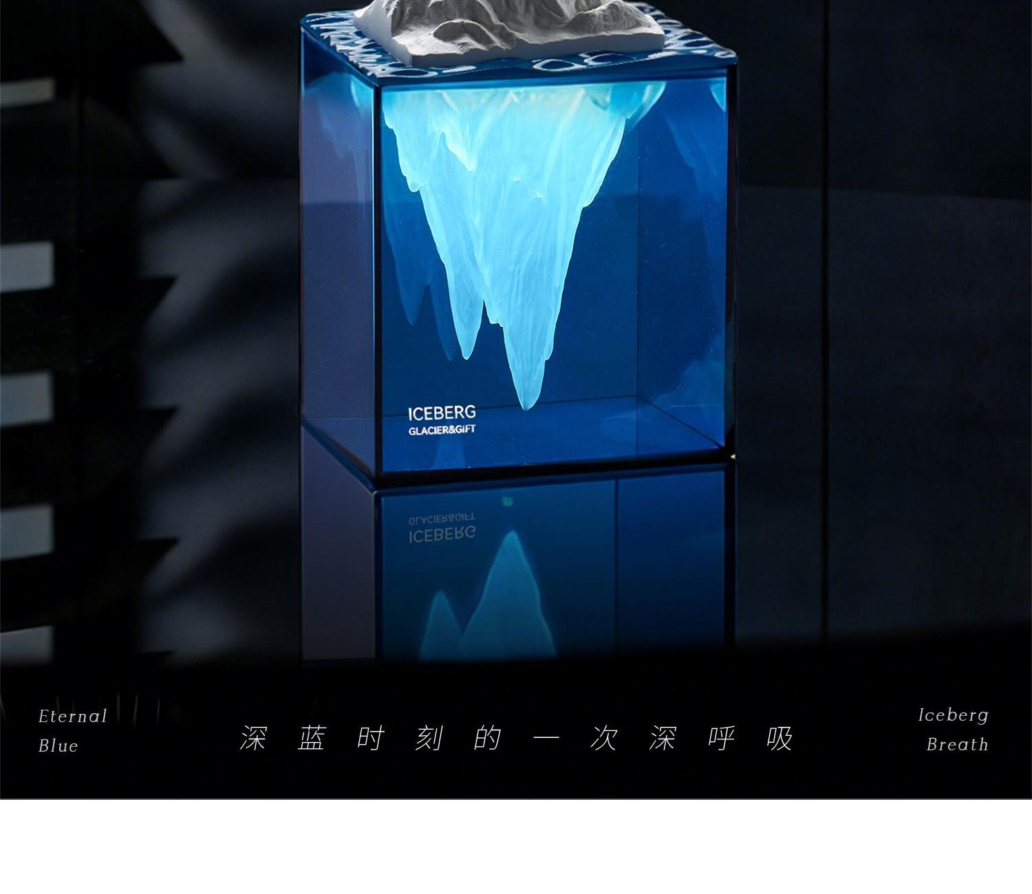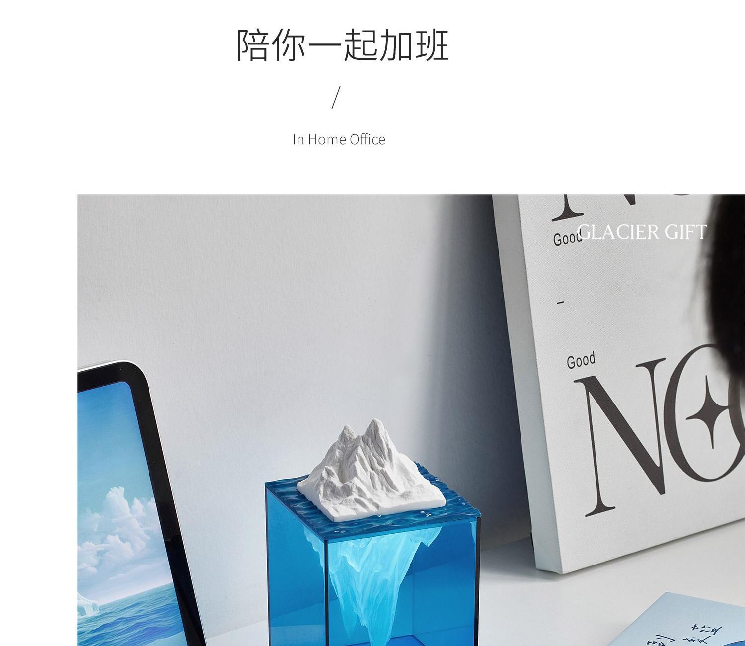 特点:1、以冰川/冰山精神为内核的情绪型家居美学的设计理念,集夜灯+香薰+摆件为一体组合套装。