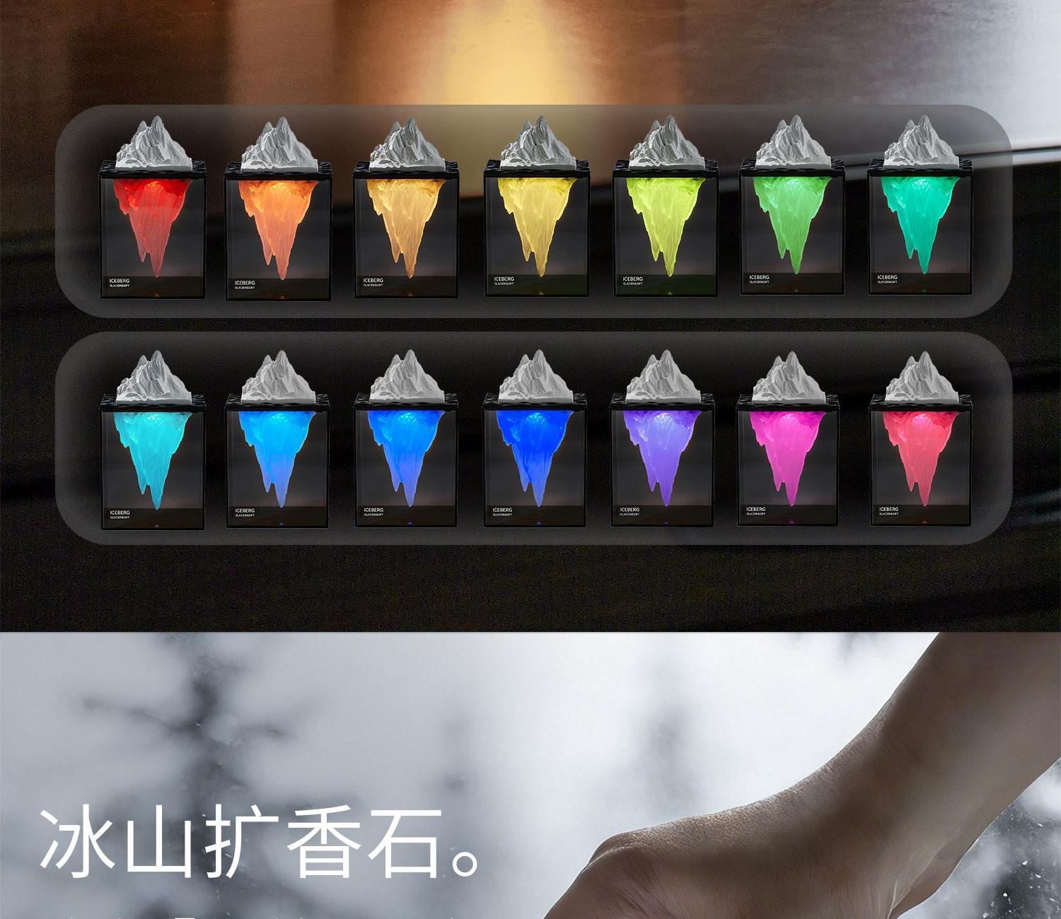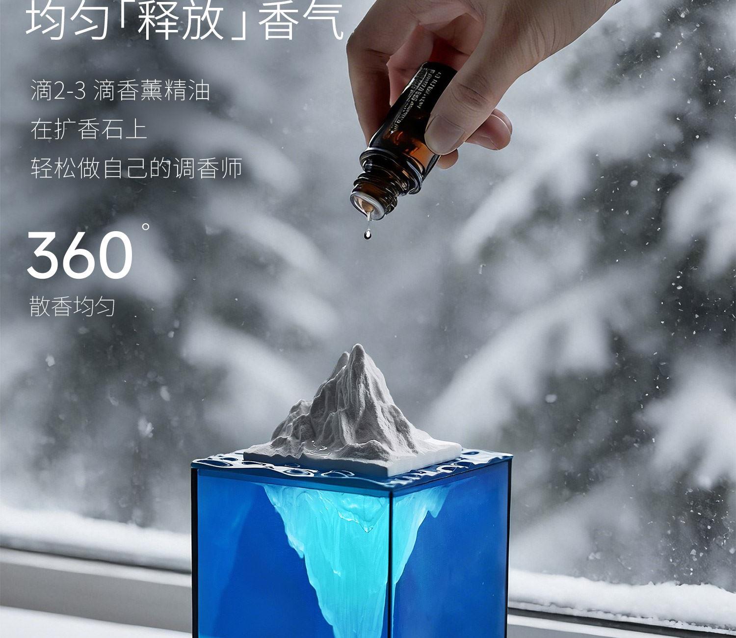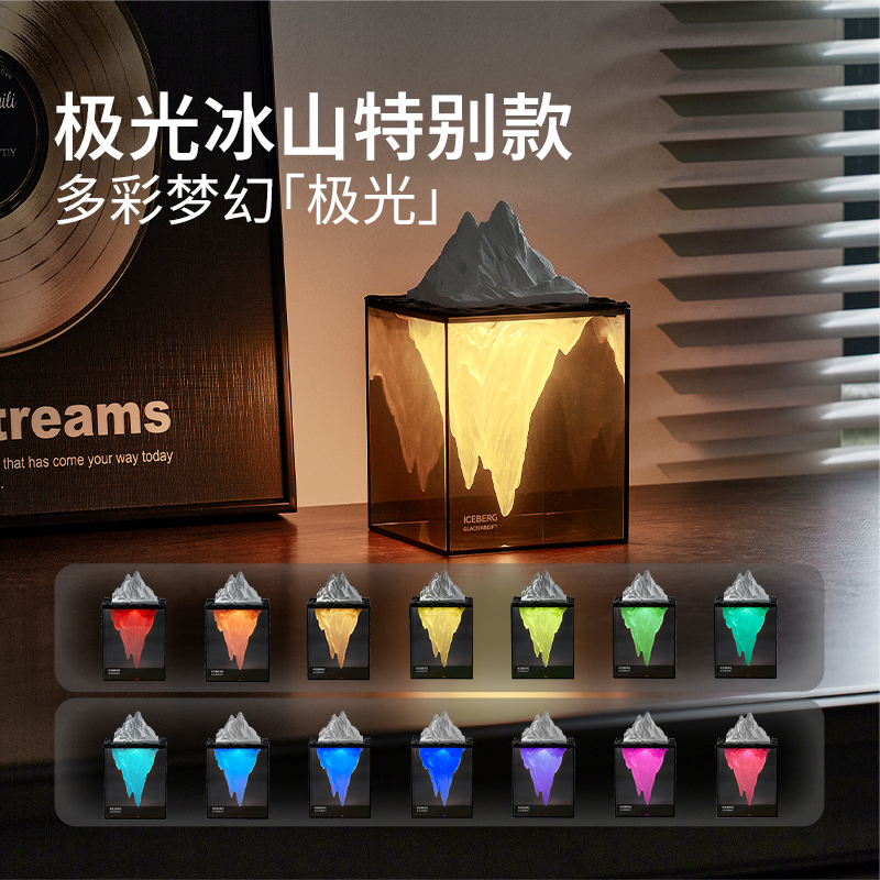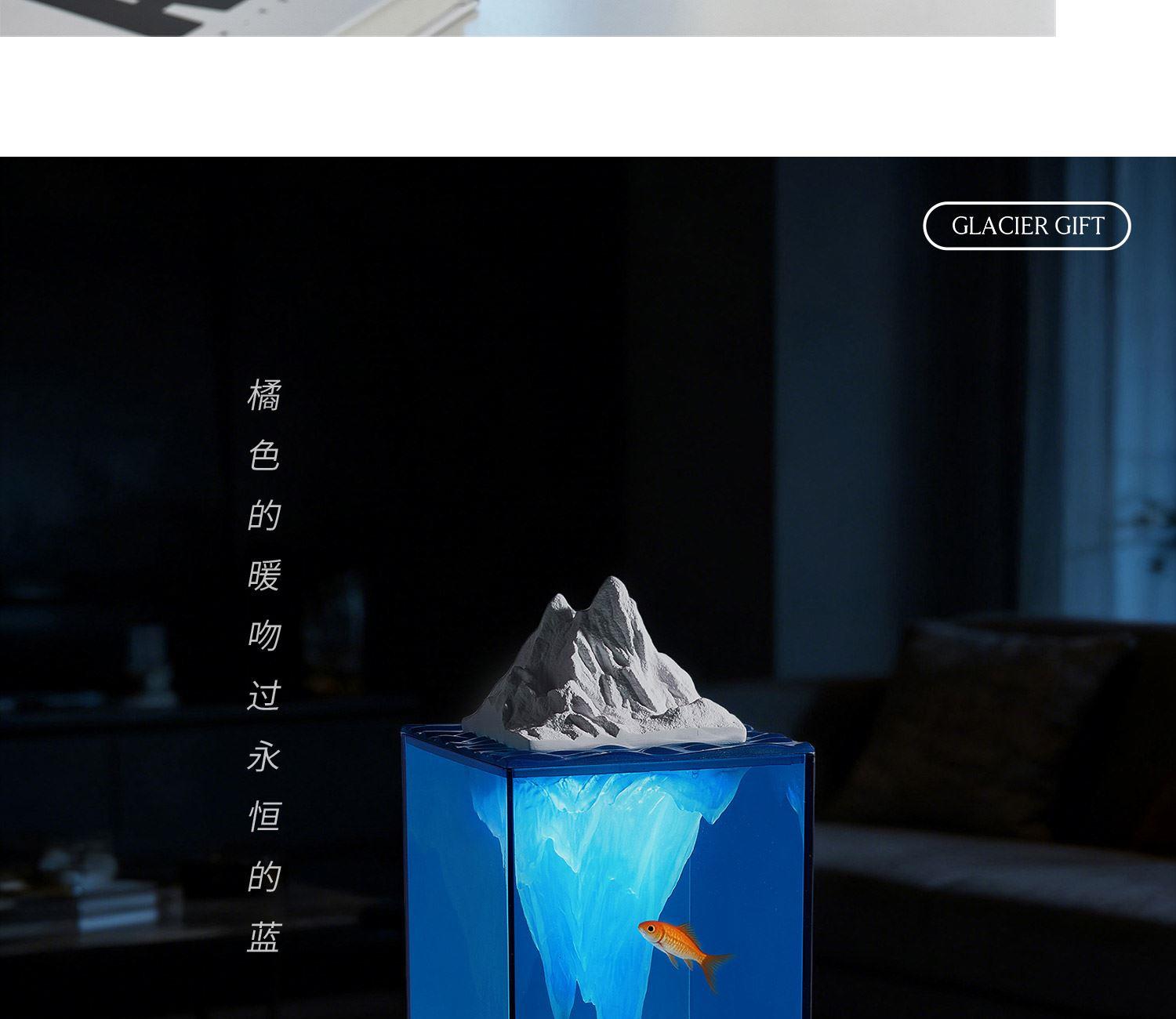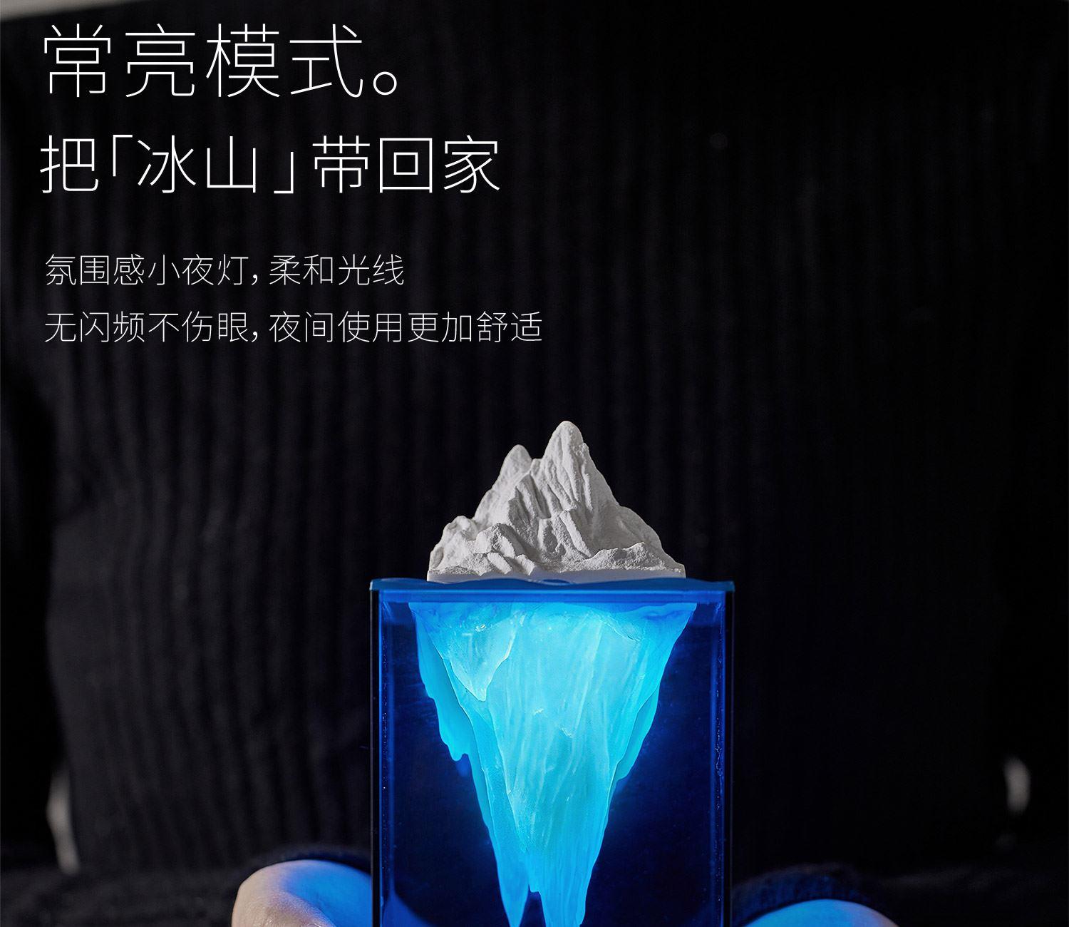 特点:1、以冰川/冰山精神为内核的情绪型家居美学的设计理念,集夜灯+香薰+摆件为一体组合套装。
