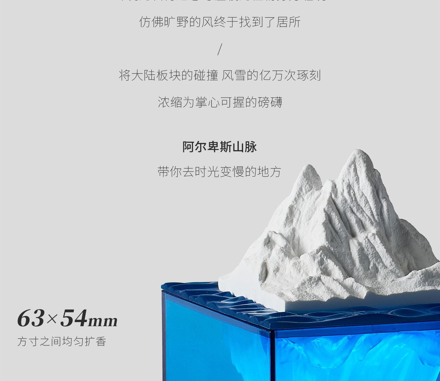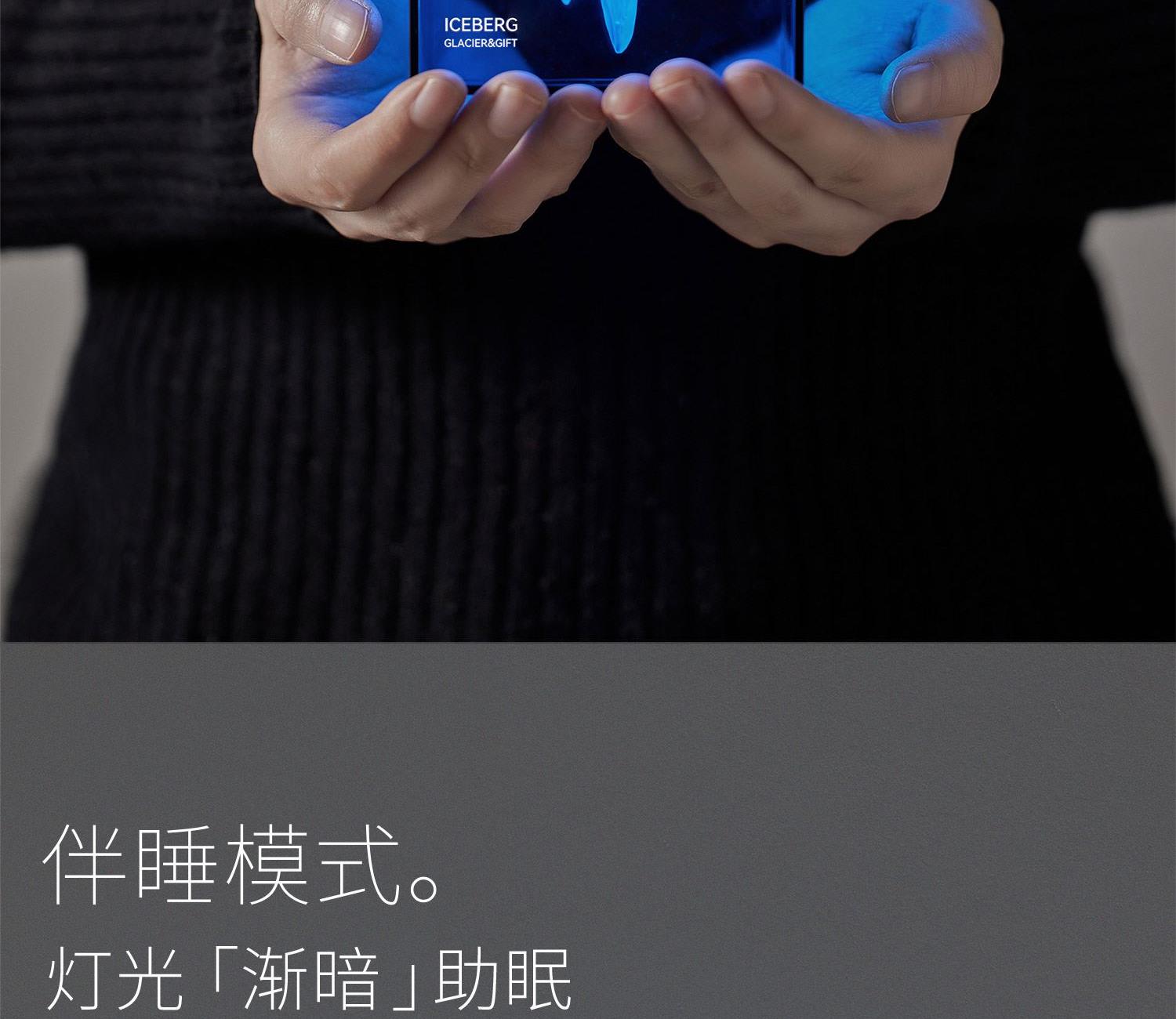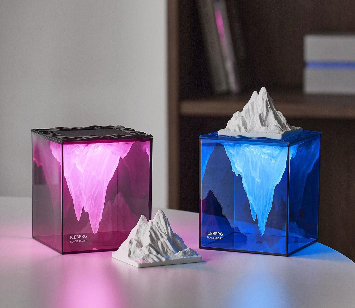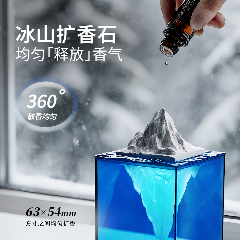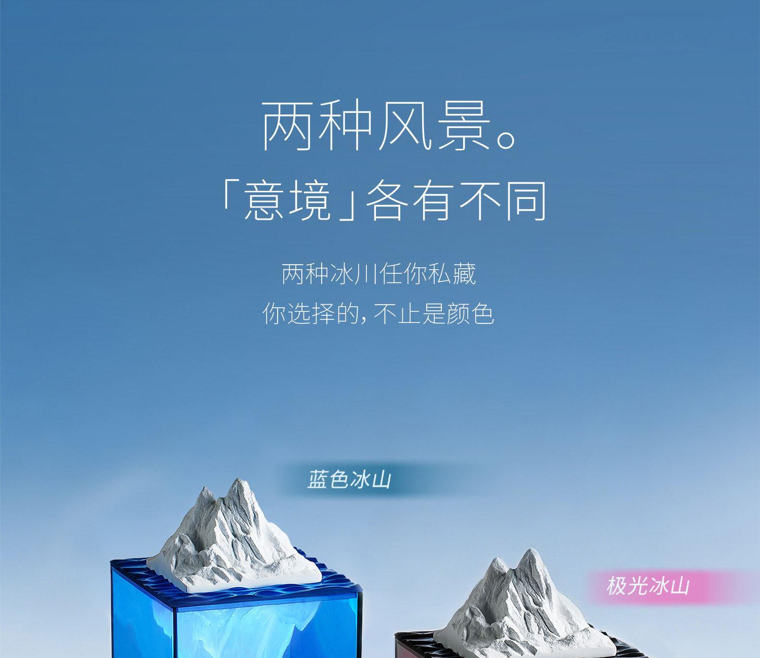 特点:1、以冰川/冰山精神为内核的情绪型家居美学的设计理念,集夜灯+香薰+摆件为一体组合套装。